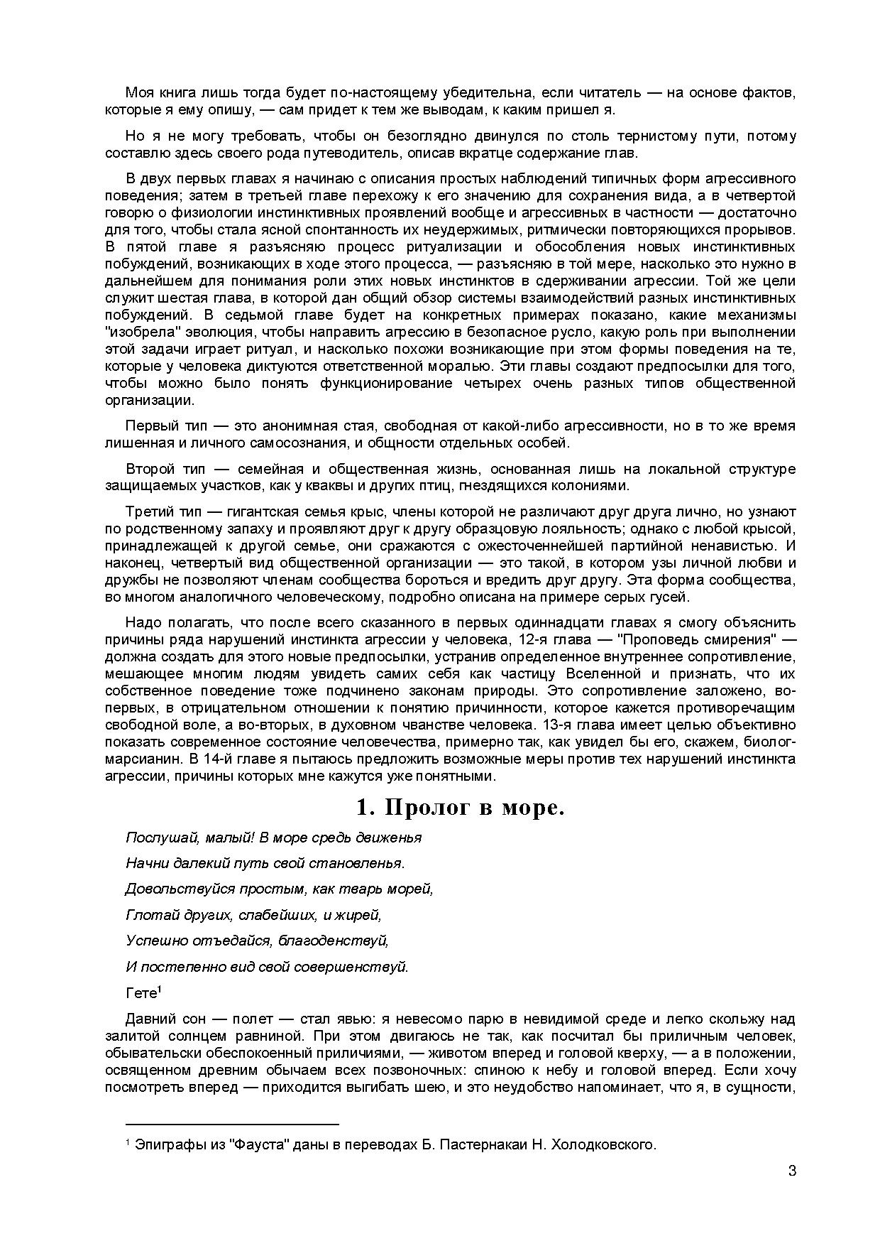 Утверждая, что агрессивность является врожденным, инстинктивно обусловленным свойством всех высших животных — и доказывая это на множестве убедительных примеров, — автор подводит к выводу: