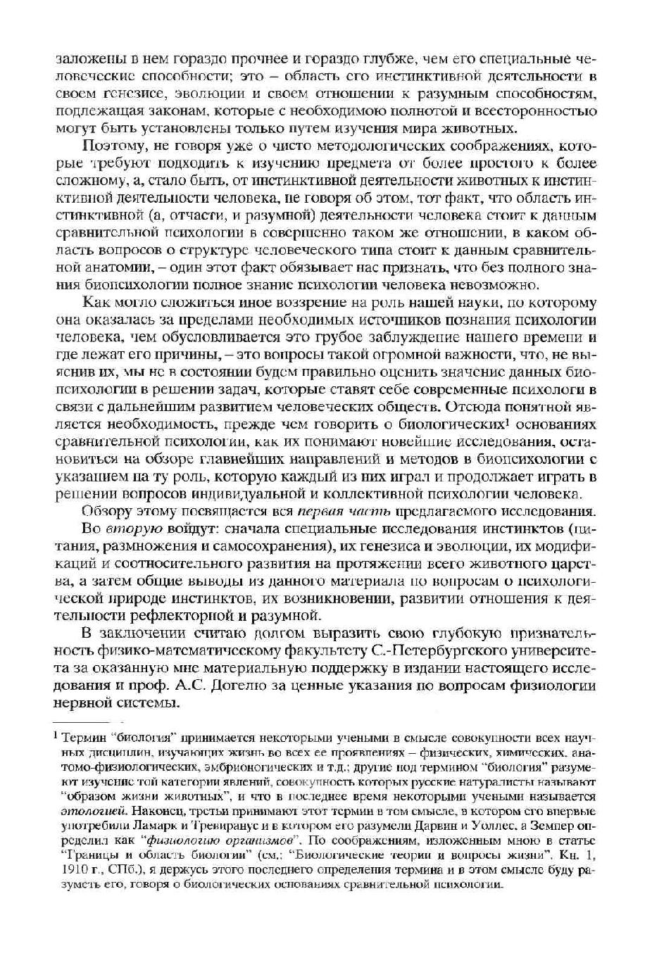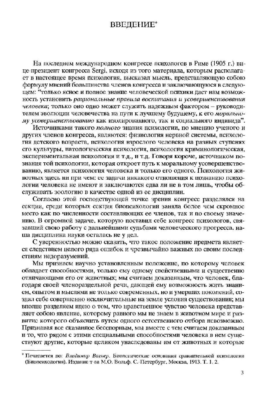 В первом томе проводится методологический анализ предмета сравнительной психологии, путей и способов исследования рассматриваемых ею проблем; вскрываются коренные различия биологически обусловленного видового поведения животных и социально детерминированного развития психологии человека; отвергаются как антропоморфизм в изучении психики животных, так и попытки представления о животных как «рефлекторных машинах»; предлагается новый путь исследования на основе сформулированного Вагнером «объективного биологического метода».
