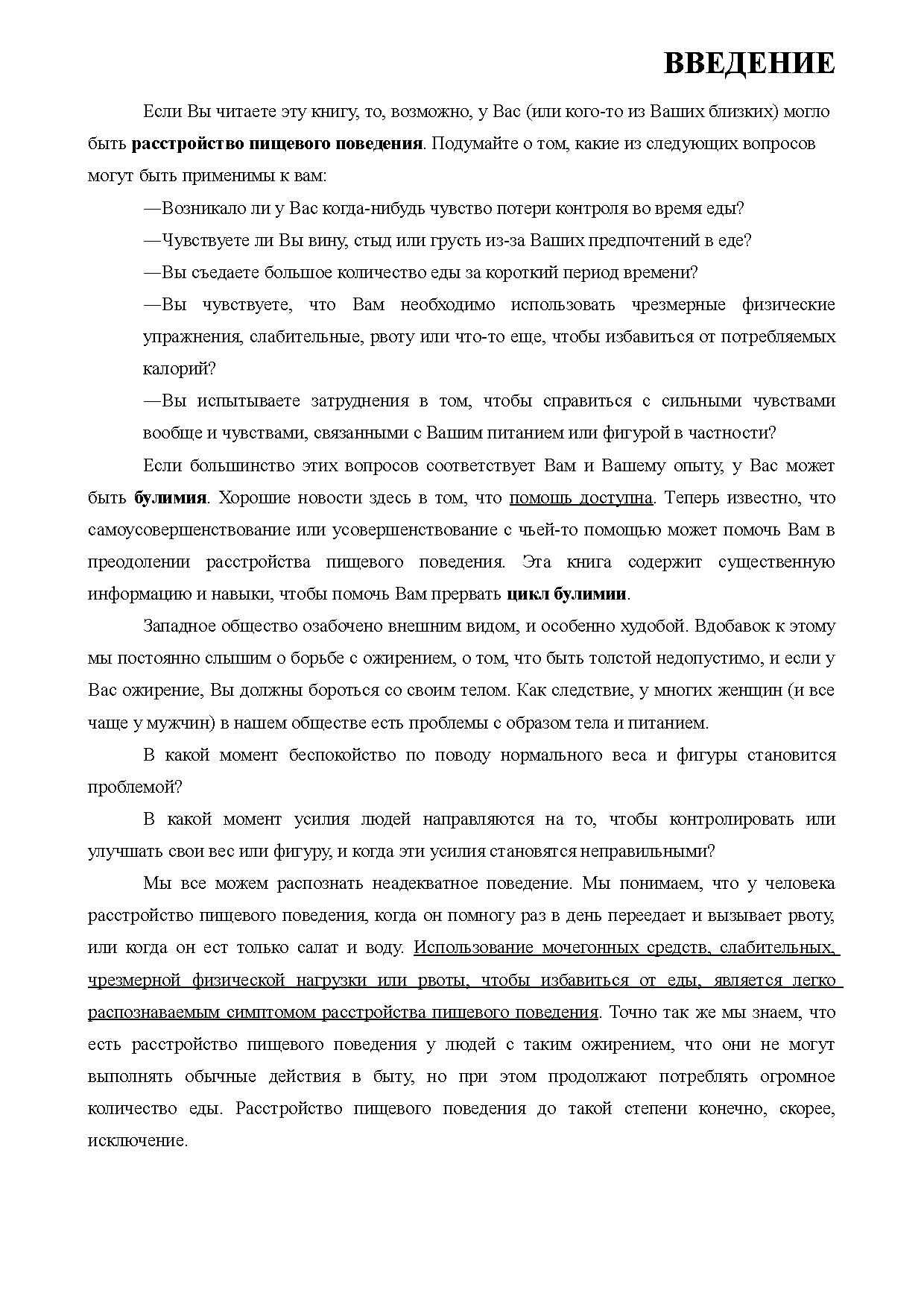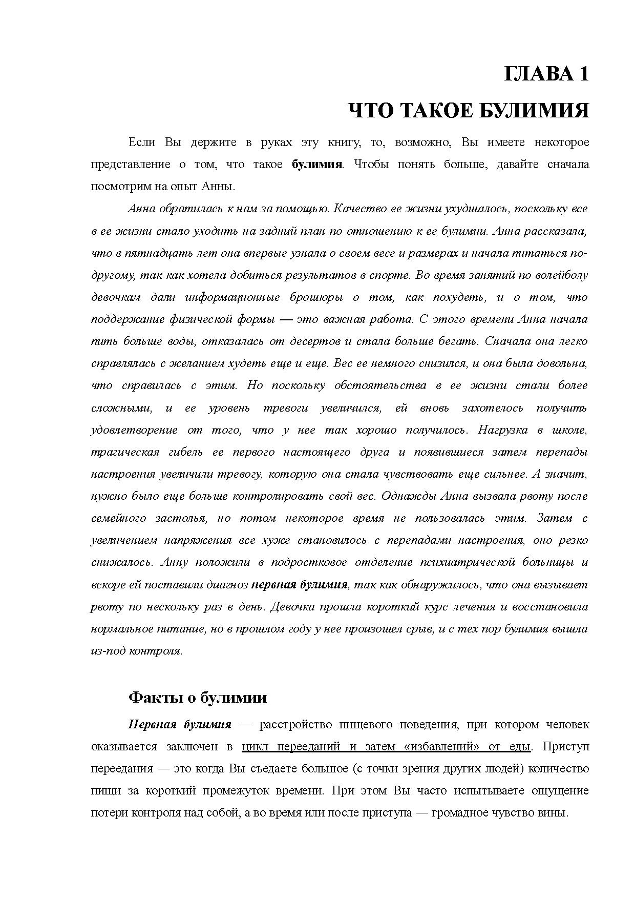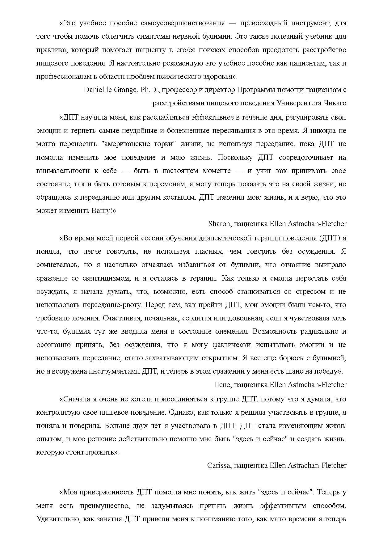 Это учебное пособие самоусовершенствования ― превосходный инструмент, для того чтобы помочь облегчить симптомы нервной булимии. Это также полезный учебник для практика, который помогает пациенту в его/ее поисках способов преодолеть расстройство пищевого поведения. Я настоятельно рекомендую это учебное пособие как пациентам, так и профессионалам в области проблем психического здоровья.
