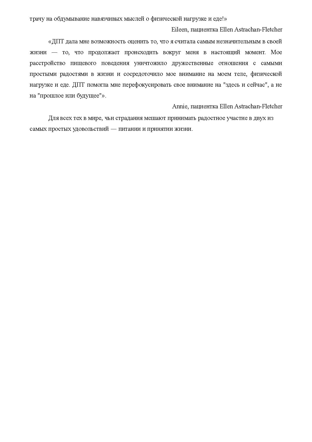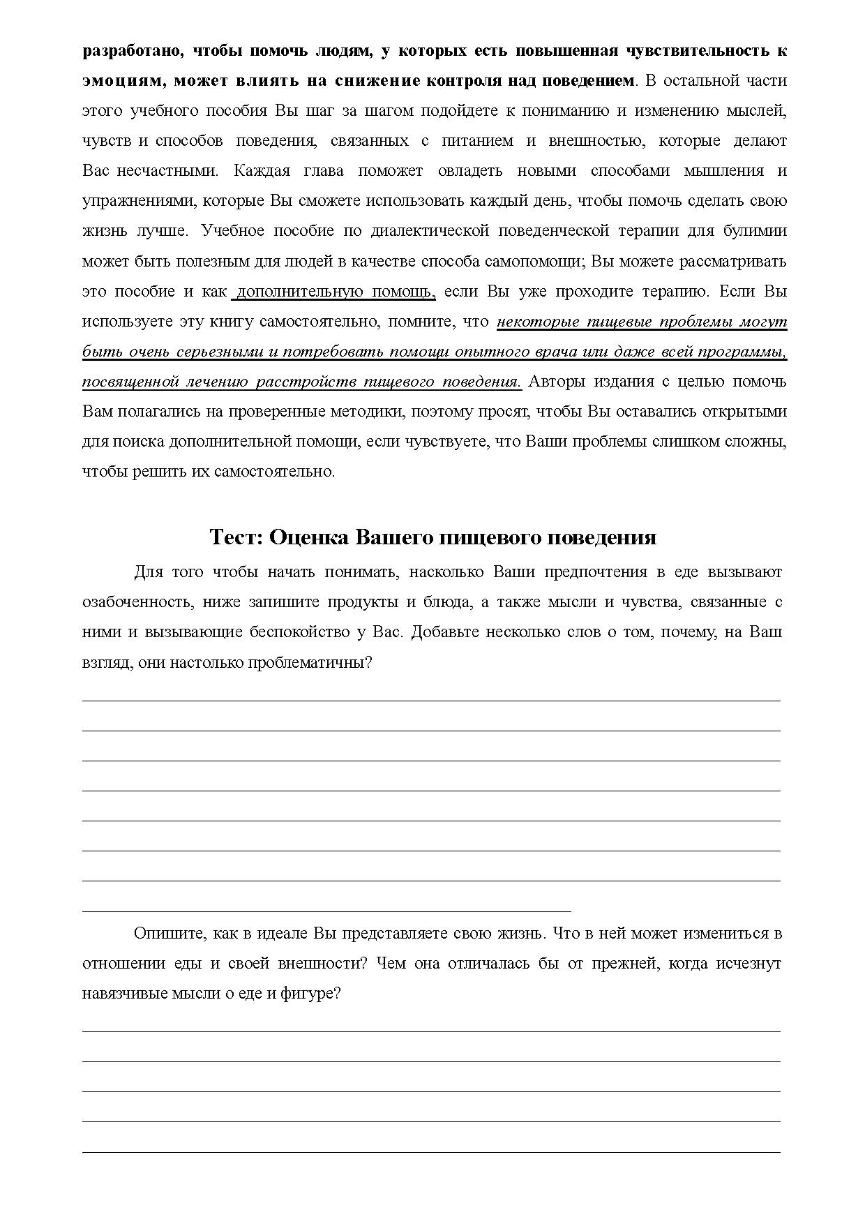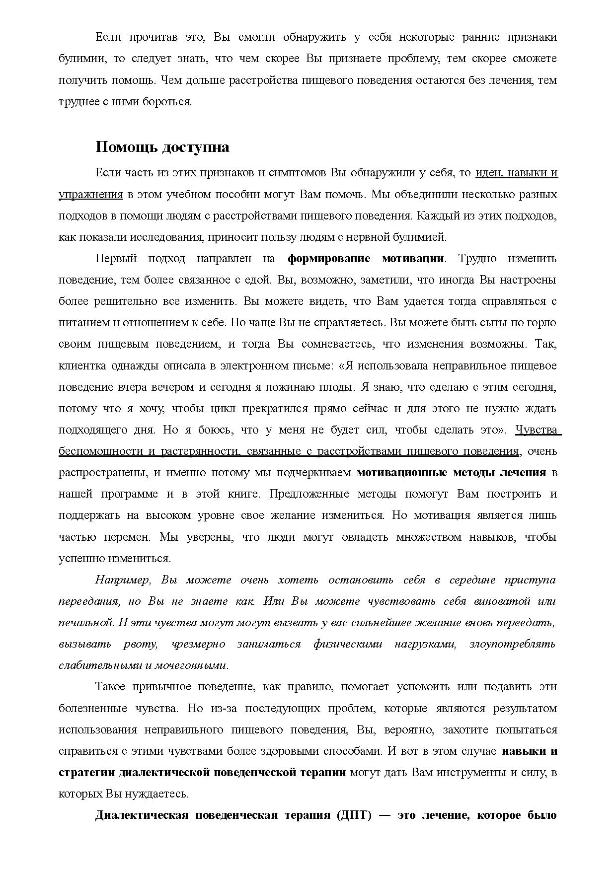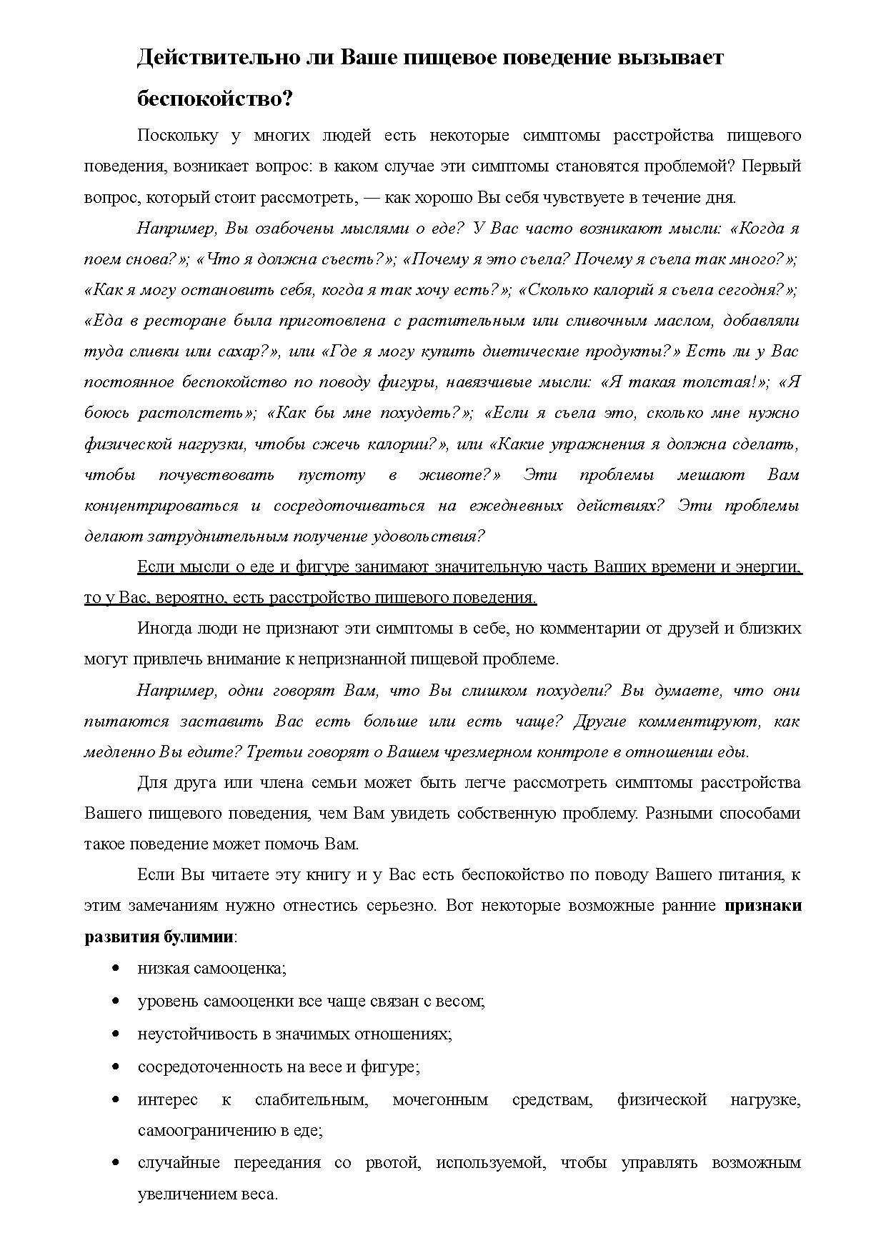 Это учебное пособие самоусовершенствования ― превосходный инструмент, для того чтобы помочь облегчить симптомы нервной булимии. Это также полезный учебник для практика, который помогает пациенту в его/ее поисках способов преодолеть расстройство пищевого поведения. Я настоятельно рекомендую это учебное пособие как пациентам, так и профессионалам в области проблем психического здоровья.