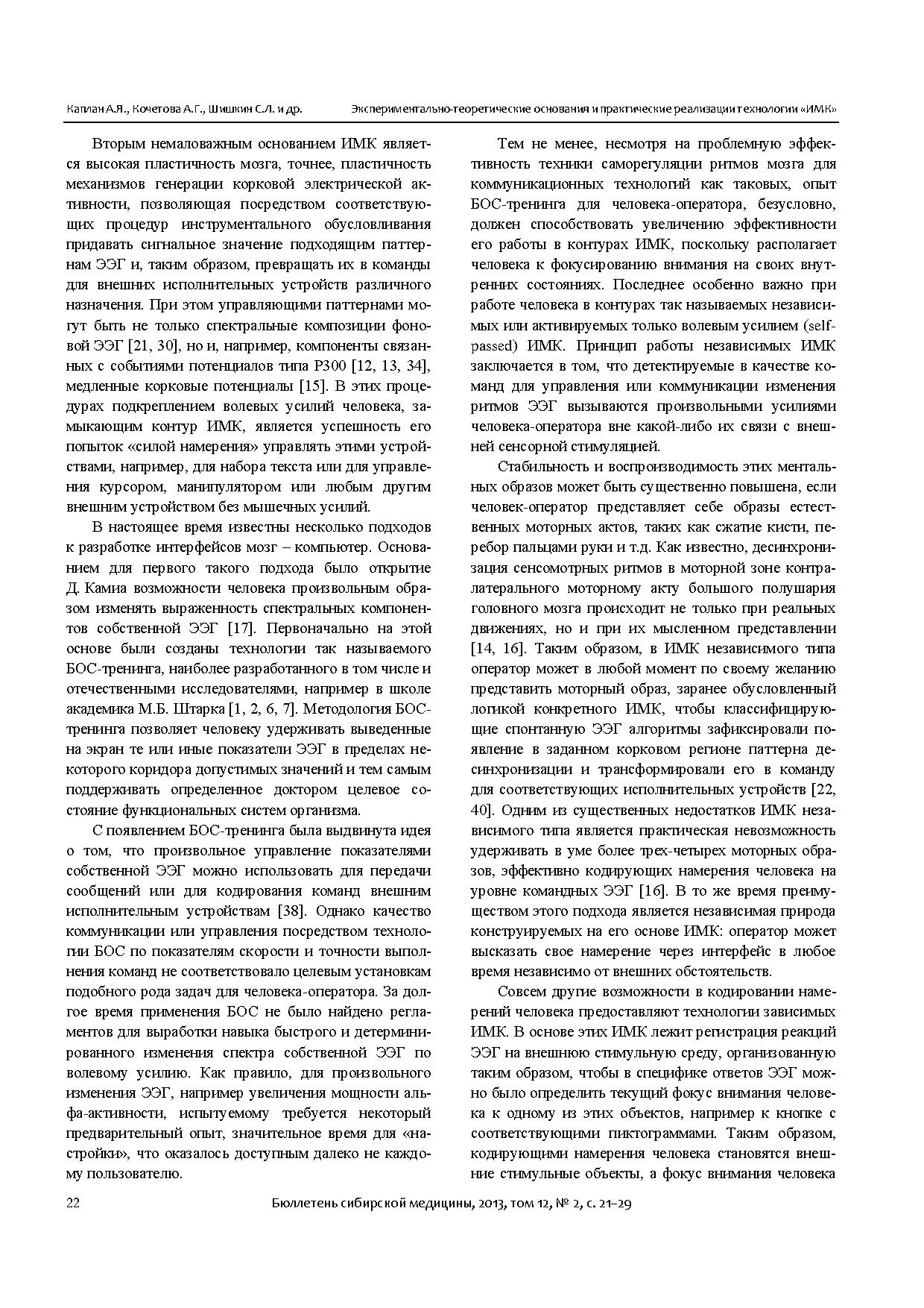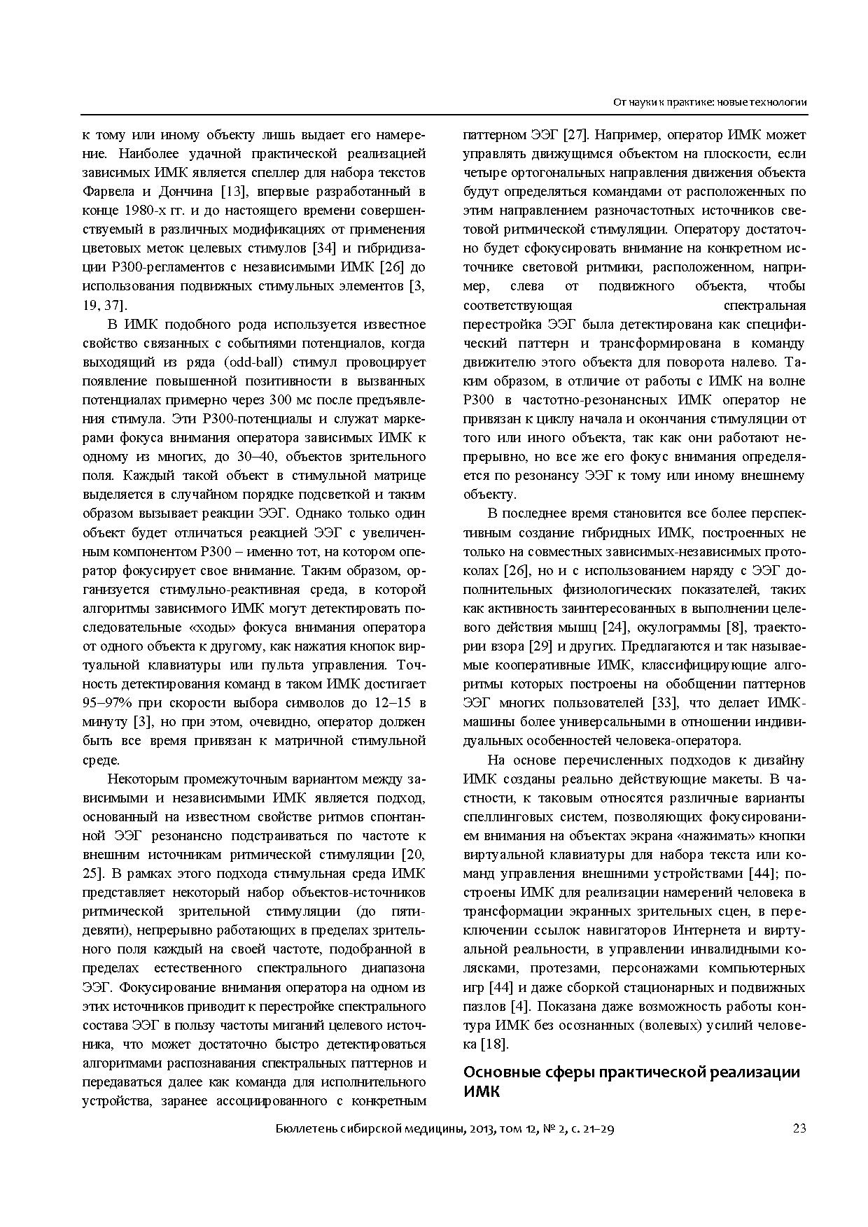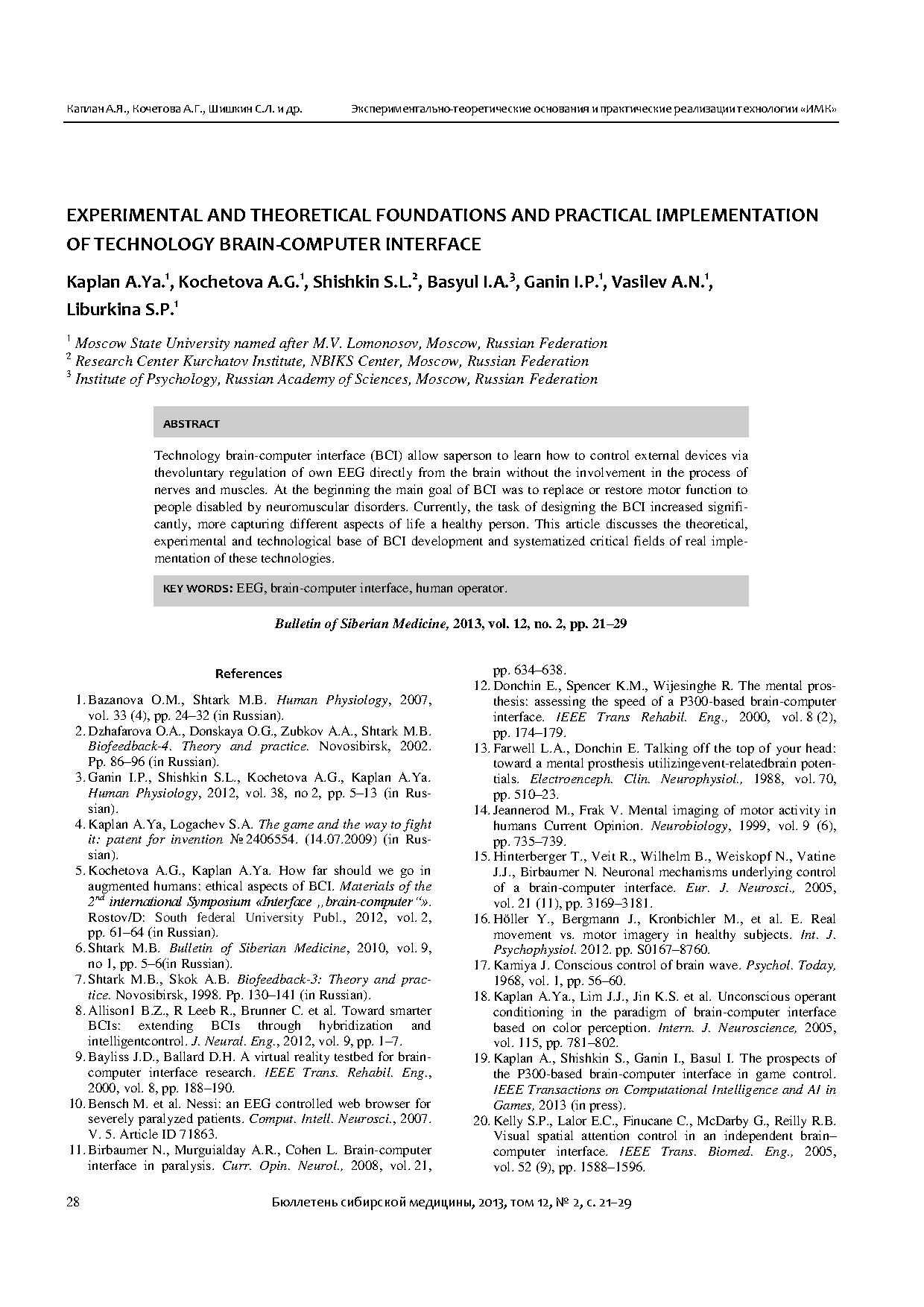 Технология интерфейсов мозг – компьютер (ИМК) позволяет человеку научиться управлять внешними исполнительными устройствами посредством произвольной модификации собственной ЭЭГ напрямую от мозга без привлечения в этот процесс нервов и мышц. В начале основной целью разработки ИМК было замещение или восстановление моторных функций человека, страдающего нейромышечными расстройствами. В настоящее время задачи разработки ИМК значительно расширились, все более захватывая различные сферы жизни здорового человека.