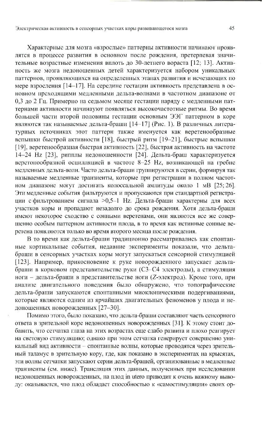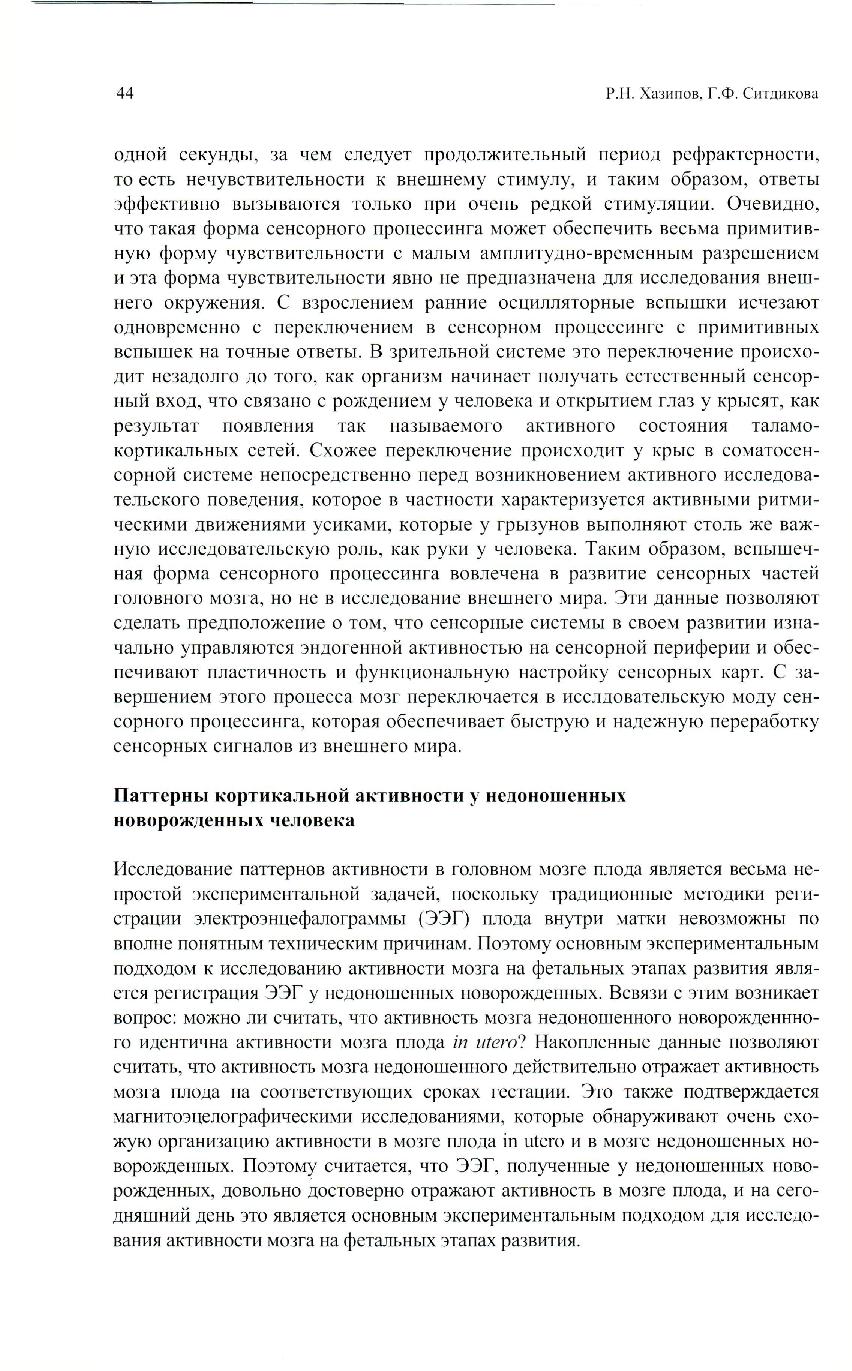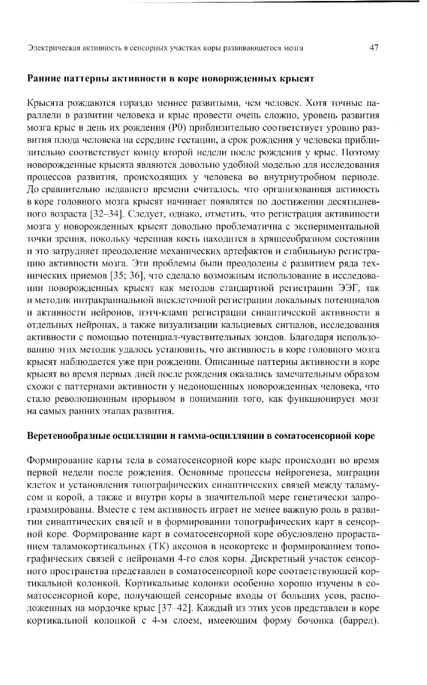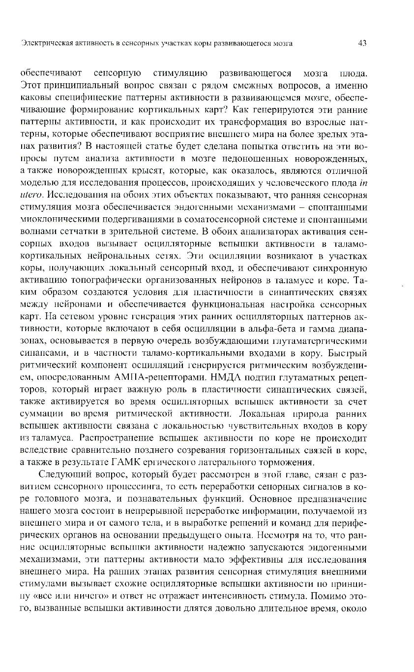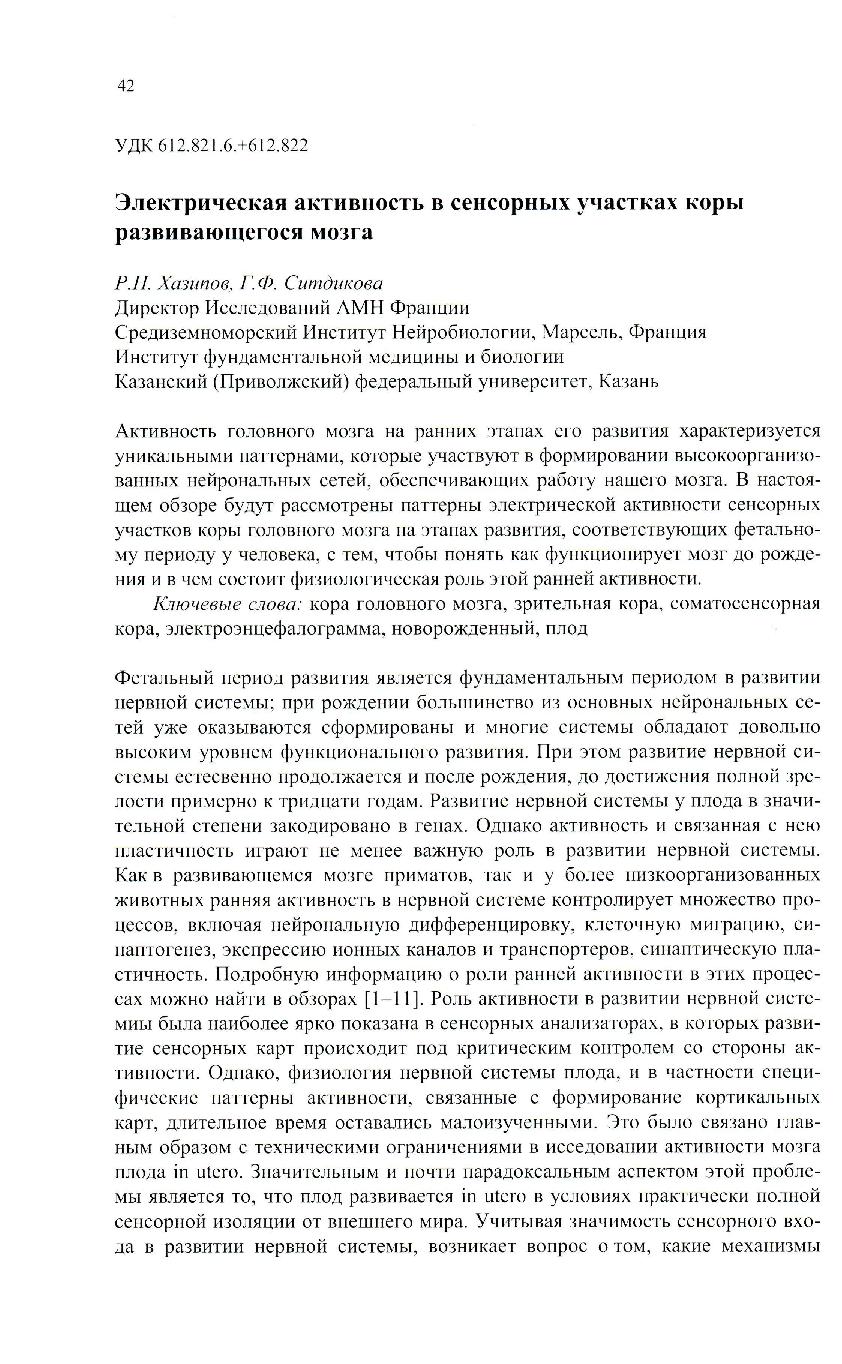 В настоящем обзоре будут рассмотрены паттерны электрической активности сенсорных участков коры головного мозга на этапах развития, соответствующих фетальному периоду у человека, с тем, чтобы понять как функционирует мозг до рождения и в чем состоит физиологическая роль э той ранней активности.