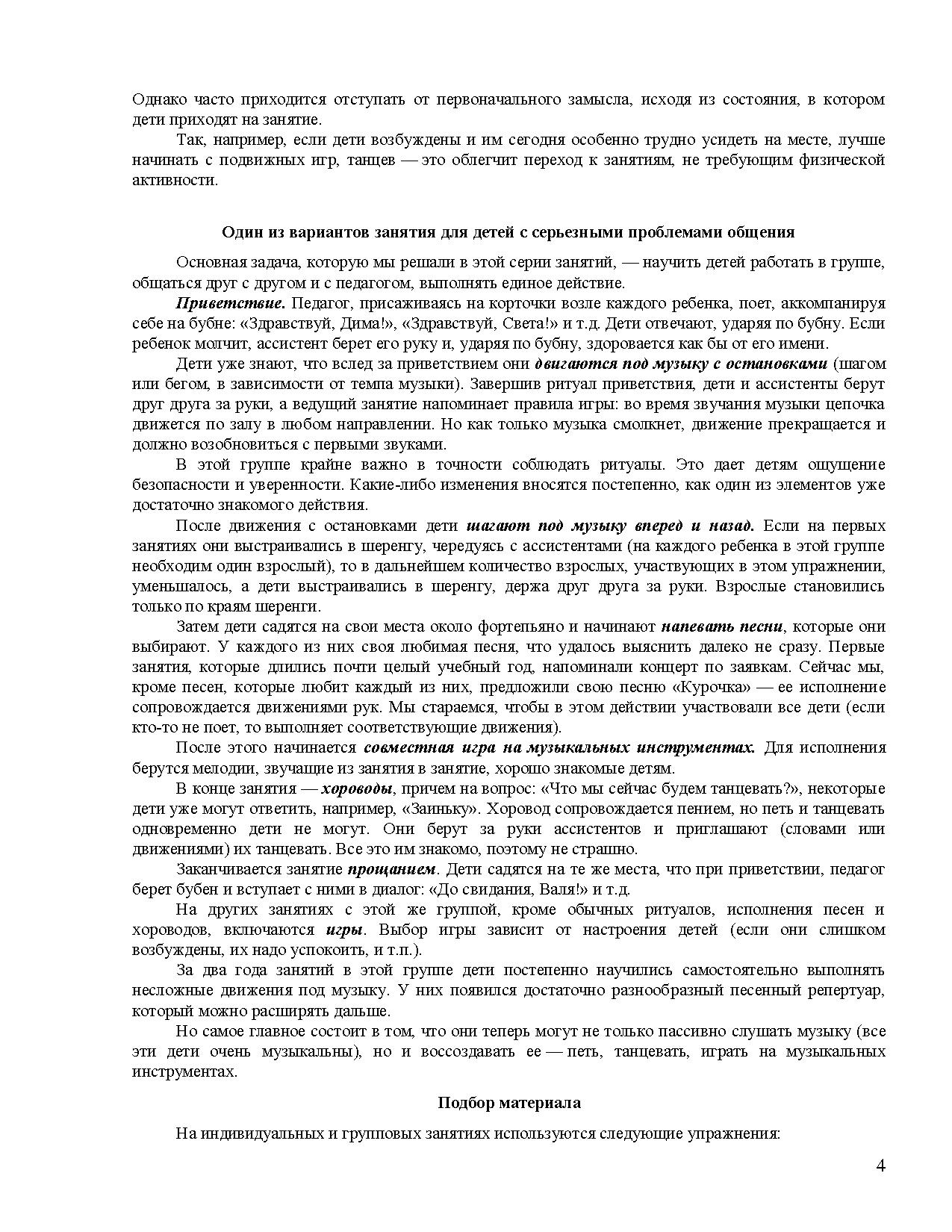 Представленная работа по содержанию и охвату проблем дает достаточно полное представление о терапевтическом и обучающем воздействии музыкальных занятий на развитие особого ребенка, а также о методике организации и проведения занятий.