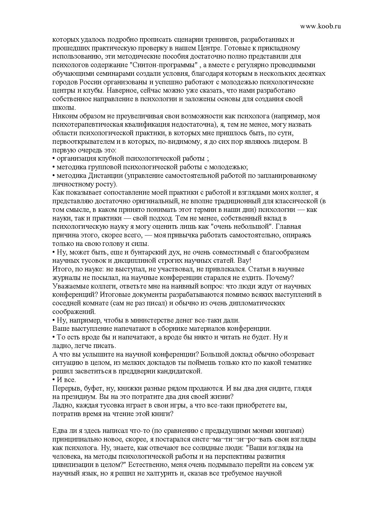 Психолог-теоретик найдет здесь очень неожиданную, но предметную и доброжелательную критику гуманистического подхода в психологии и сможет познакомиться с “Синтон-программой” как новым подходом к организации и ведению группового психологического тренинга.