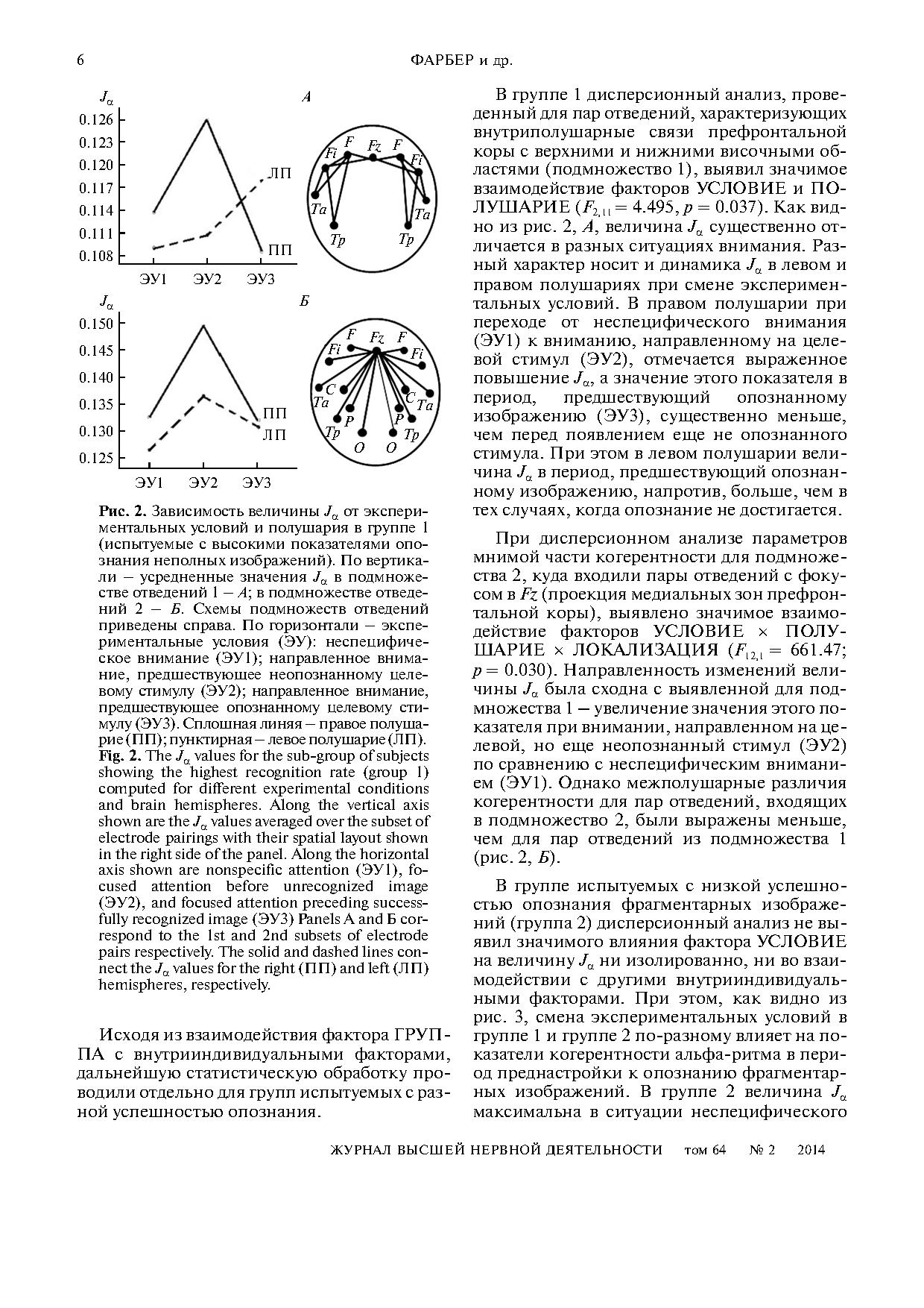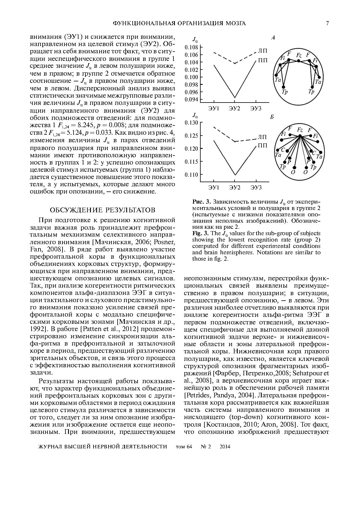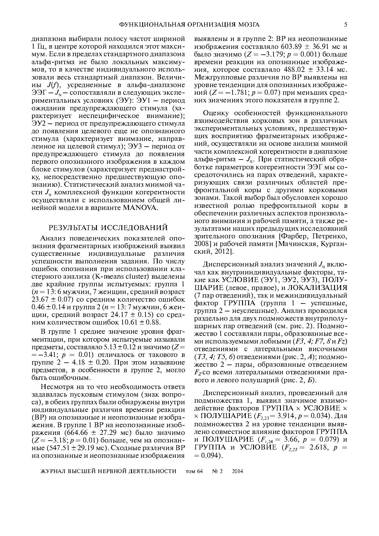 В качестве показателей функционального взаимодействия использовали оценки мнимой части комплексной когерентности альфаритма ЭЭГ. Показано, что характер перестроек внутрикоркового взаимодействия различается у испытуемых с высокими и низкими показателями успешности опознания. У успешных испытуемых изменения внутрикоркового взаимодействия в период, предшествующий еще неопознанным стимулам, преобладают в правом полушарии, а в период, предшествующий опознанным стимулам, – в левом полушарии. В этой группе испытуемых в обоих полушариях когерентность альфаритма возрастает в ситуации направленного внимания по отношению к ситуации неспецифического внимания. У неуспешных испытуемых, напротив, значения когерентности альфаритма как в правом, так и в левом полушариях существенно снижаются при направленном внимании по отношению к неспецифическому вниманию.
