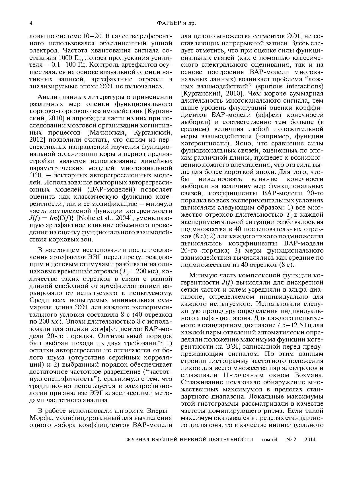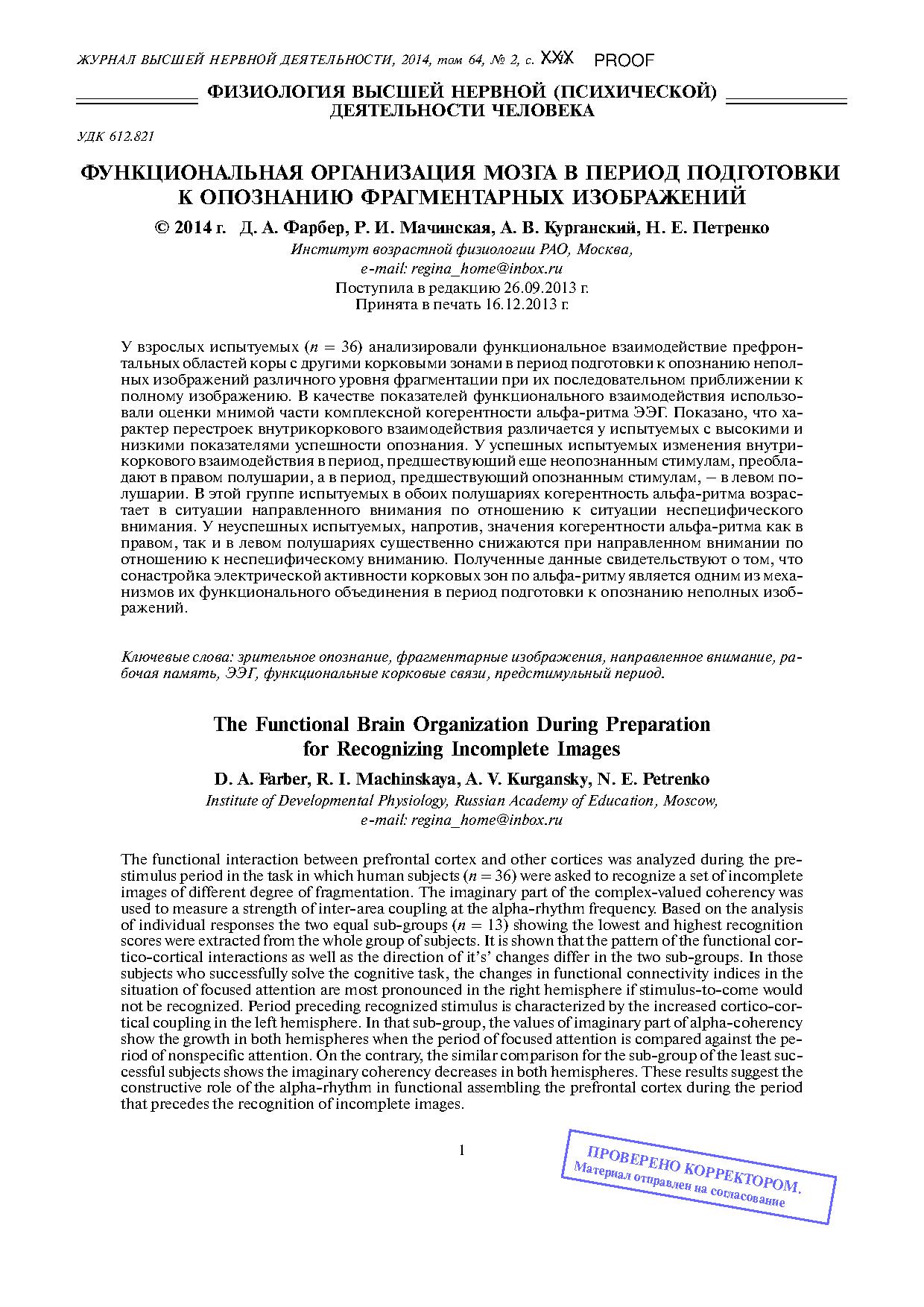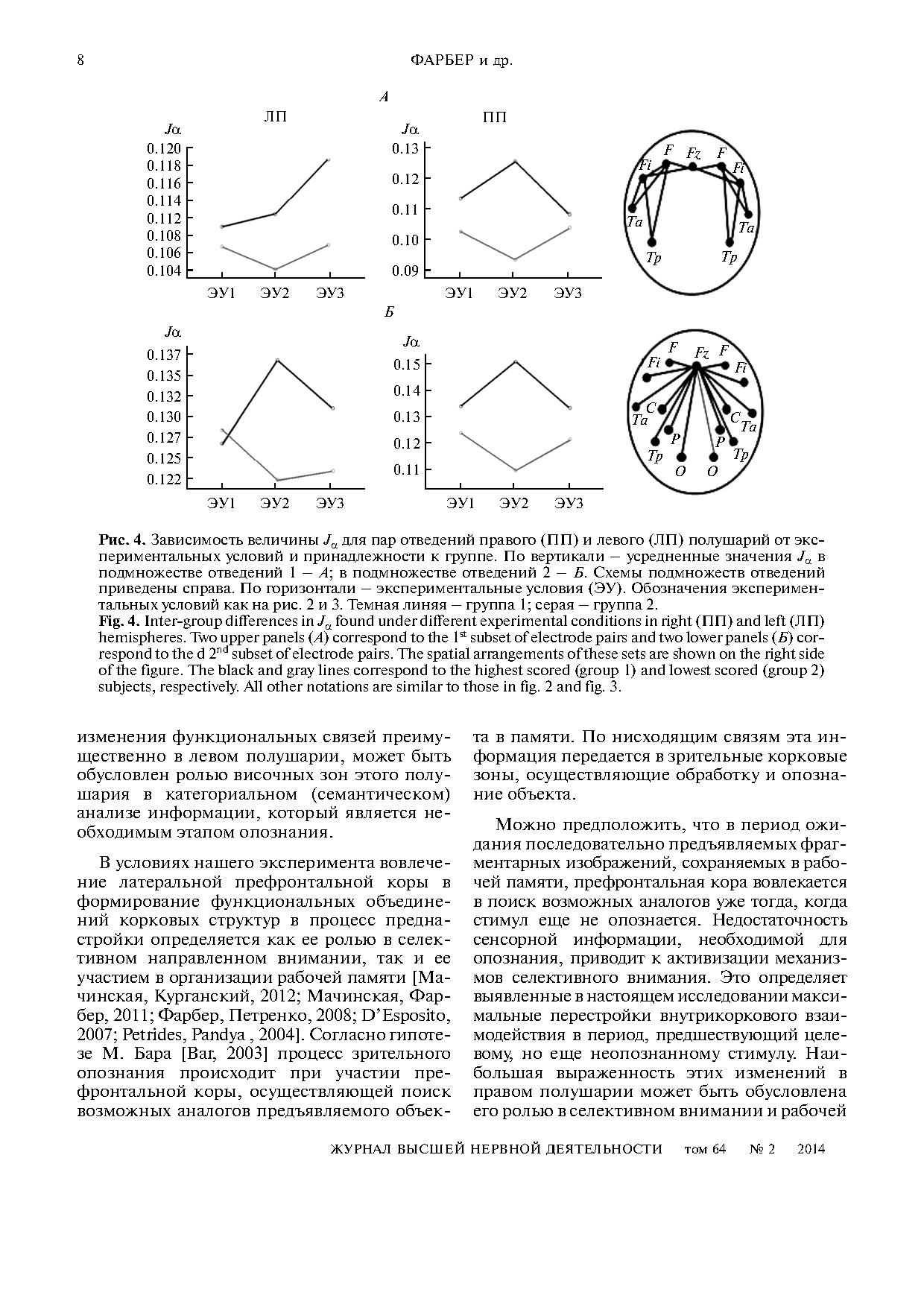 В качестве показателей функционального взаимодействия использовали оценки мнимой части комплексной когерентности альфаритма ЭЭГ. Показано, что характер перестроек внутрикоркового взаимодействия различается у испытуемых с высокими и низкими показателями успешности опознания. У успешных испытуемых изменения внутрикоркового взаимодействия в период, предшествующий еще неопознанным стимулам, преобладают в правом полушарии, а в период, предшествующий опознанным стимулам, – в левом полушарии. В этой группе испытуемых в обоих полушариях когерентность альфаритма возрастает в ситуации направленного внимания по отношению к ситуации неспецифического внимания. У неуспешных испытуемых, напротив, значения когерентности альфаритма как в правом, так и в левом полушариях существенно снижаются при направленном внимании по отношению к неспецифическому вниманию.