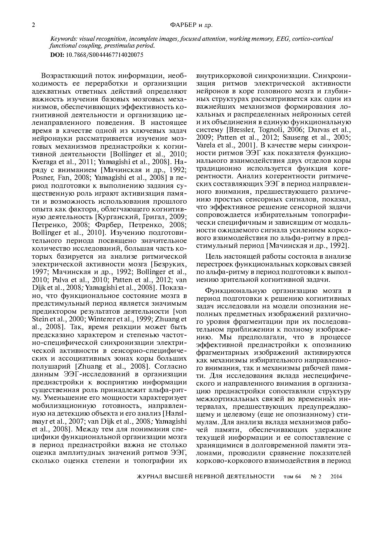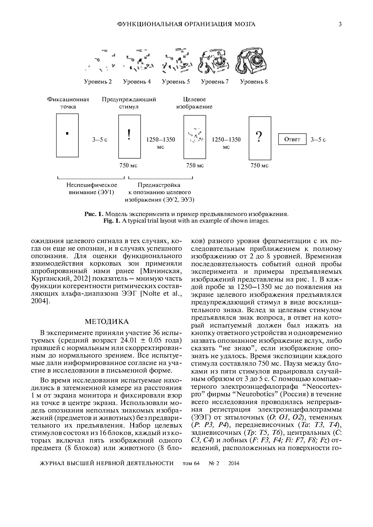 У взрослых испытуемых (n = 36) анализировали функциональное взаимодействие префронтальных областей коры с другими корковыми зонами в период подготовки к опознанию неполных изображений различного уровня фрагментации при их последовательном приближении к полному изображению.