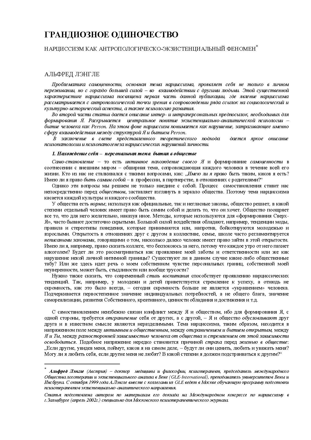 Проблематика самоценности, основная тема нарциссизма, проявляет себя не только в личном переживании, но с гораздо большей силой – во взаимодействии с другими людьми. Этой существенной характеристике нарциссизма посвящена первая часть данной публикации, где явление нарциссизма рассматривается с антропологической точки зрения в сопровождении ряда ссылок на социологический и культурно-исторический аспекты, а также психологию развития.
