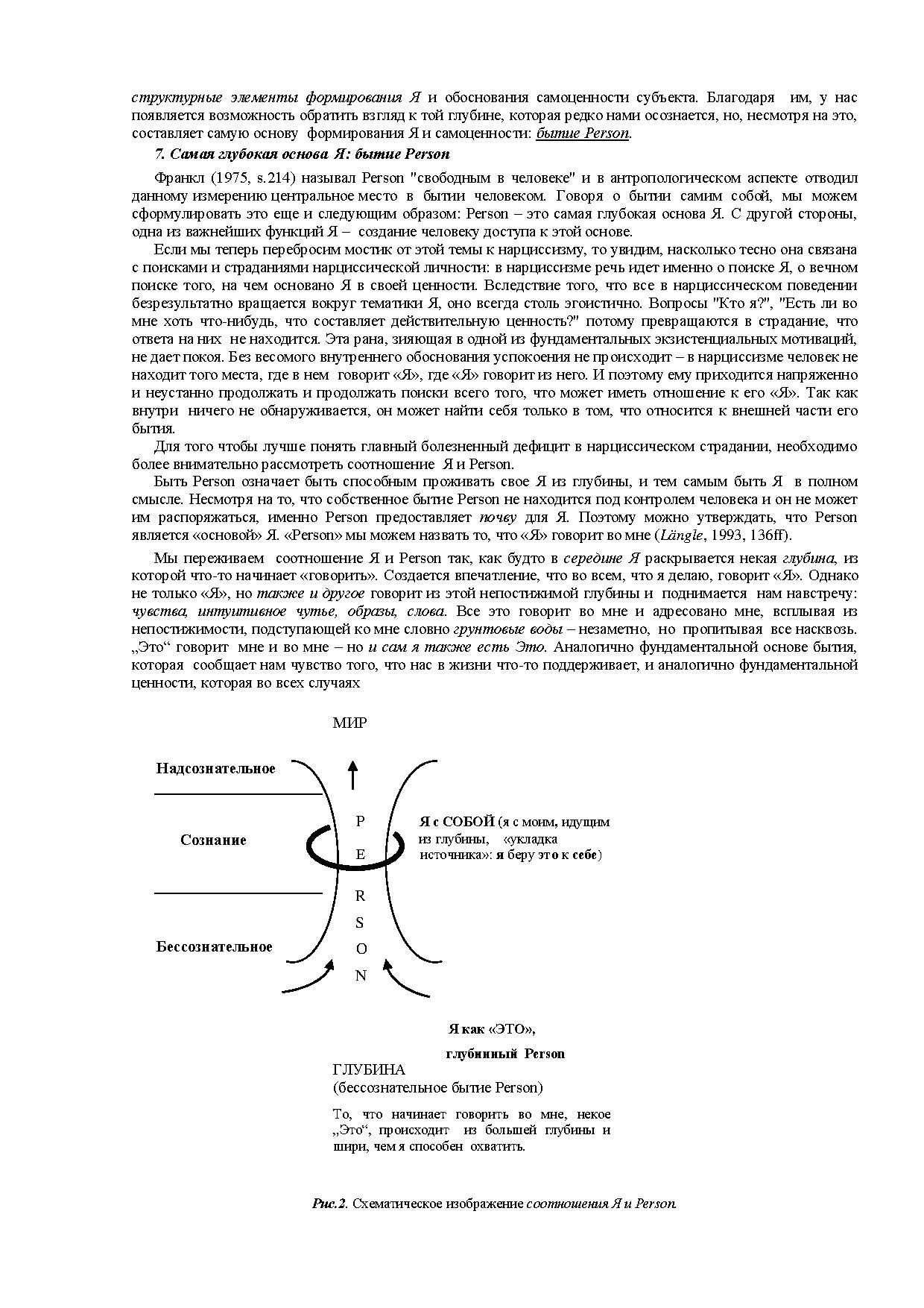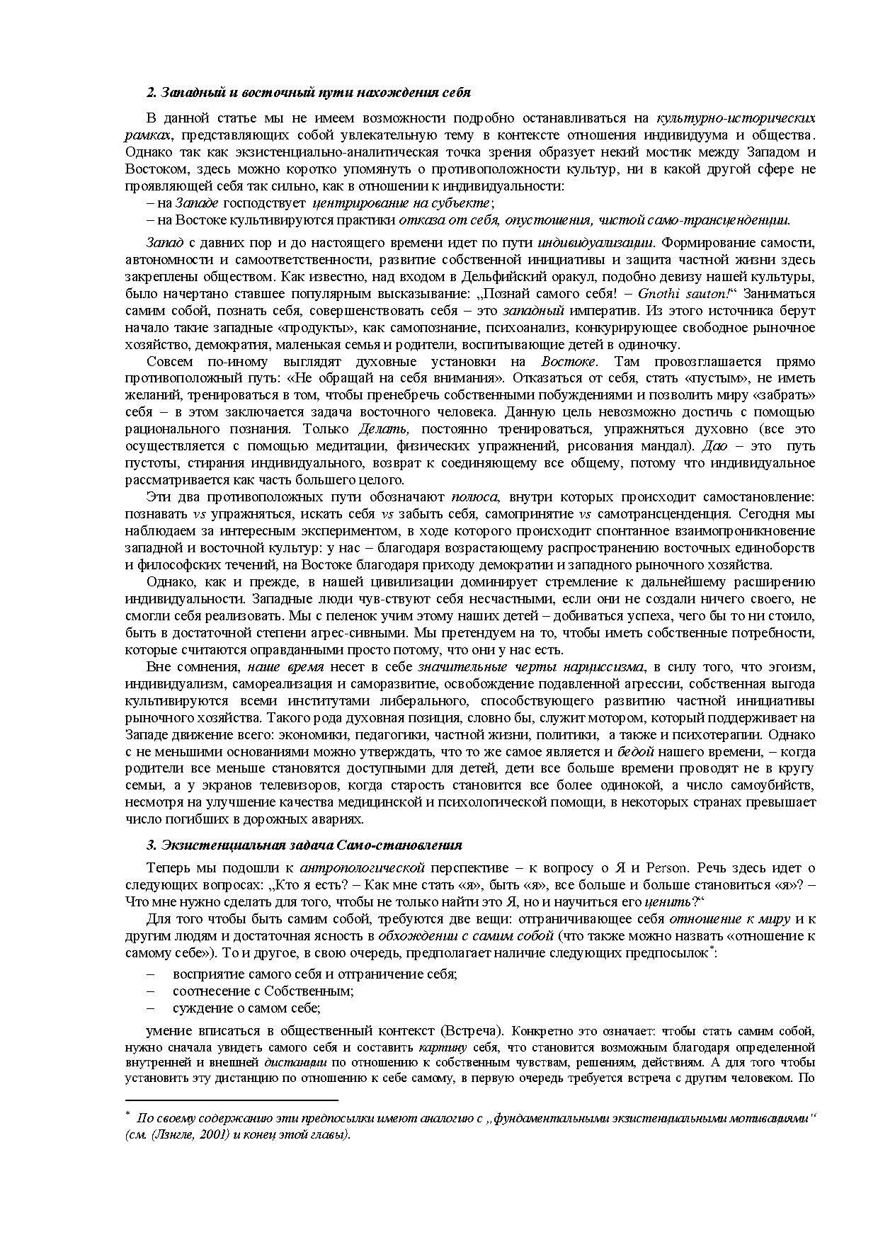 Во второй части статьи дается описание интер- и интраперсональных предпосылок, необходимых для формирования Я. Раскрывается центральное понятие экзистенциально-аналитической психологии – бытие человека как Person. На этом фоне нарциссизм понимается как нарушение, затрагивающее именно сферу взаимодействия между структурой Я и бытием Person.