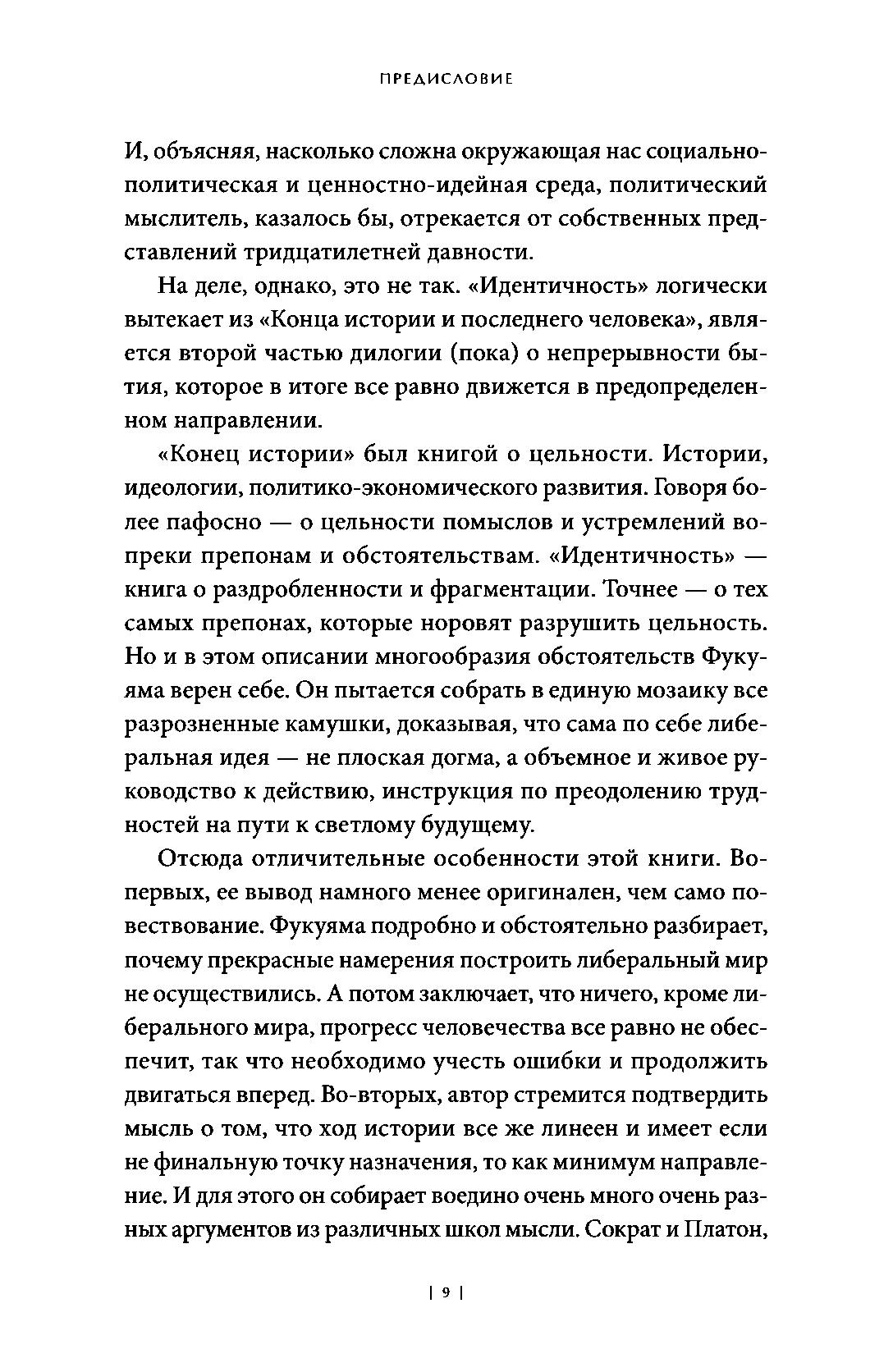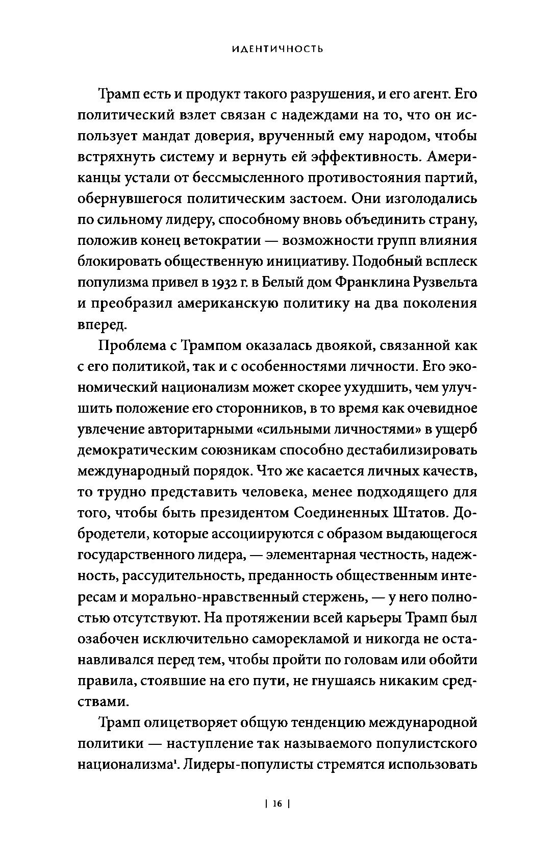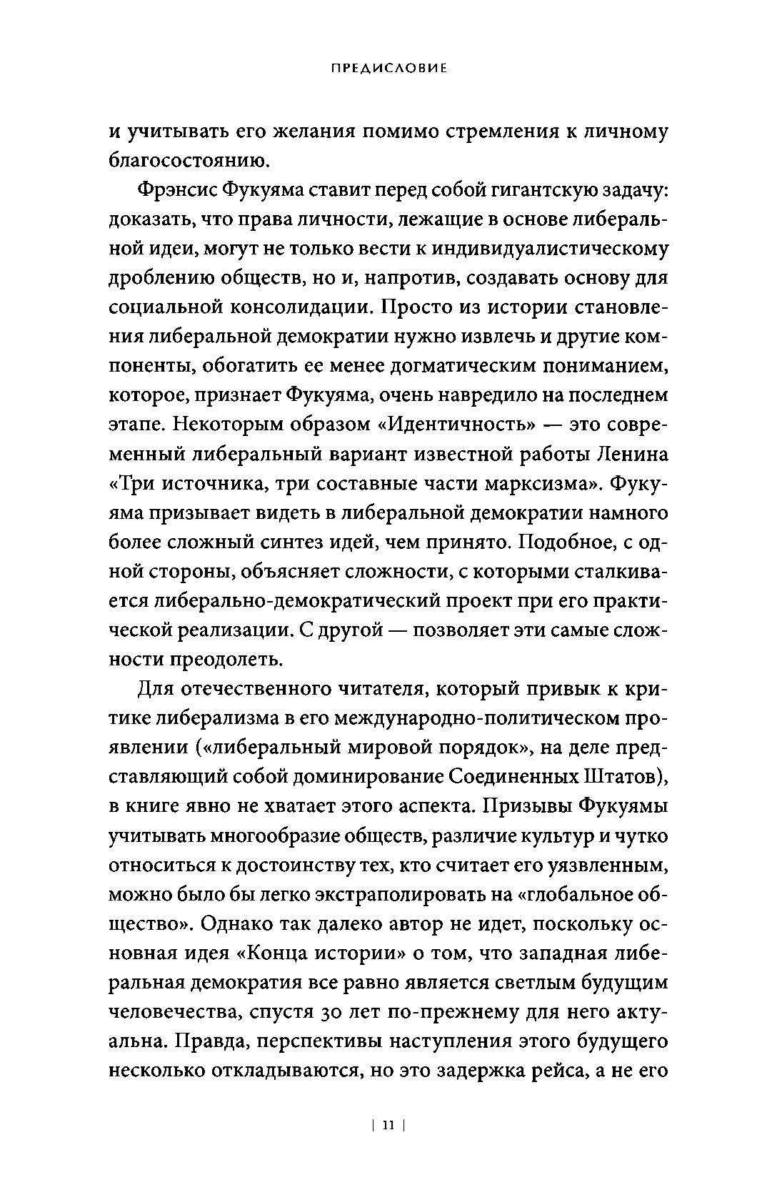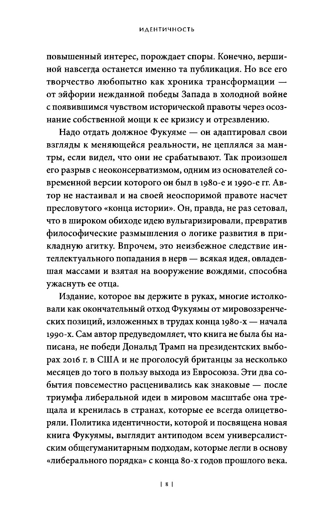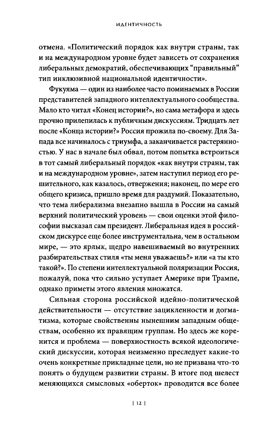 В своей новой книге Фукуяма исследует истоки нашего стремления к признанию достоинства и разбирает последствия влияния политики идентичности на либеральный миропорядок в эпоху популизма. Задача, которую ставит перед собой Фукуяма, — доказать, что права личности, лежащие в основе либеральной идеи, не только могут вести к индивидуалистическому дроблению обществ, но и создать основу для социальной консолидации.