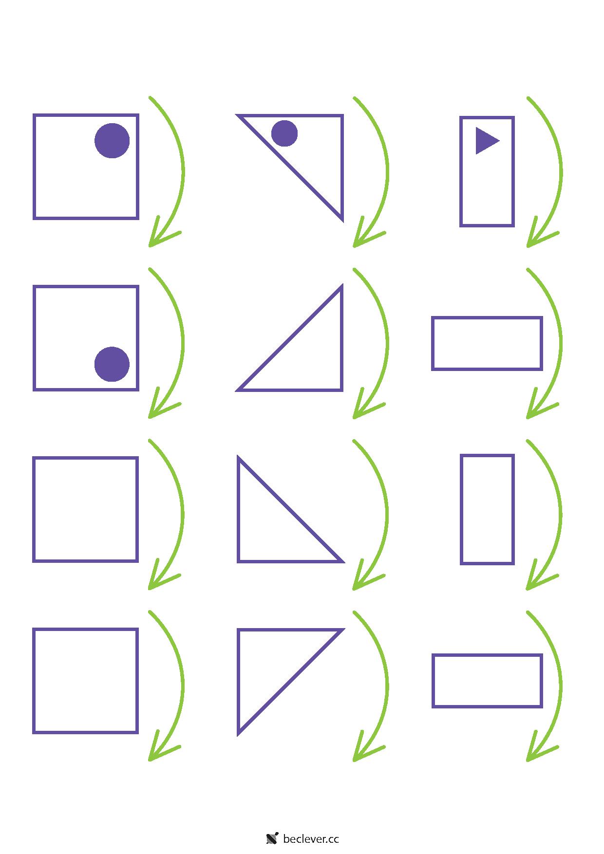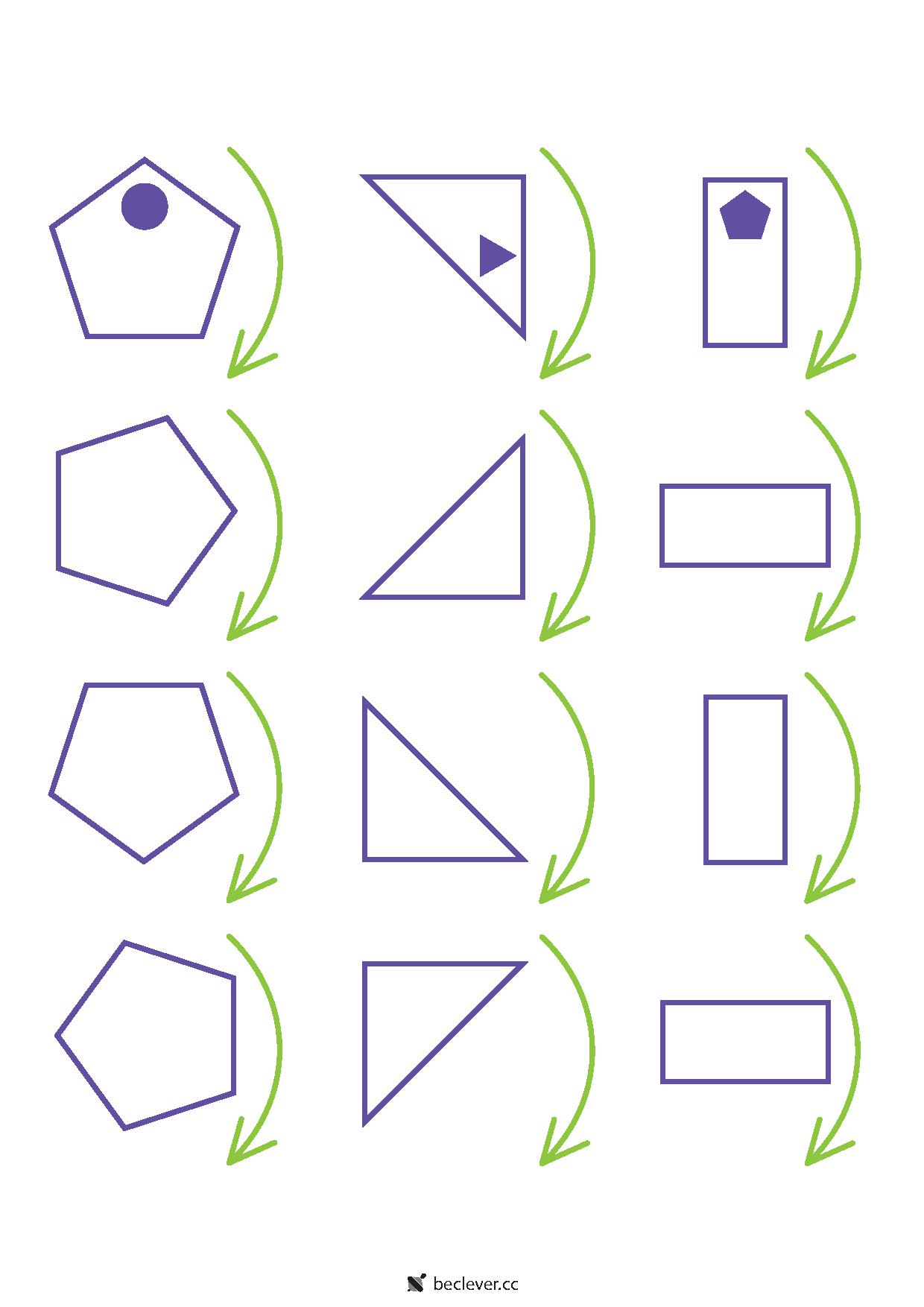 В первых заданиях нужно дорисовать внутреннюю фигуру (в том месте, где она окажется после поворота), в следующих - раскрасить треугольники в правильные цвета. Если ребенку сложно представить, что должно получиться, распечатайте фигуры и дайте ему повращать.