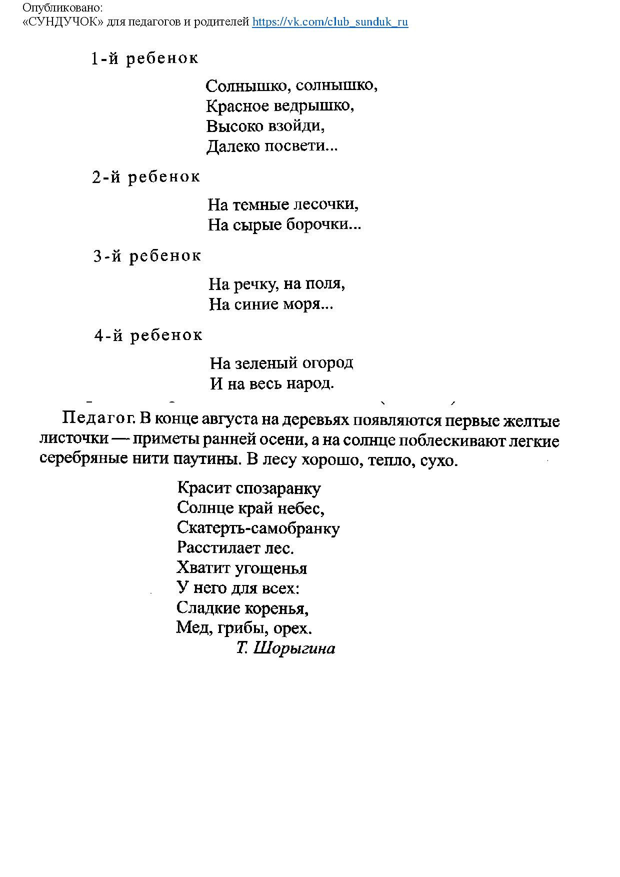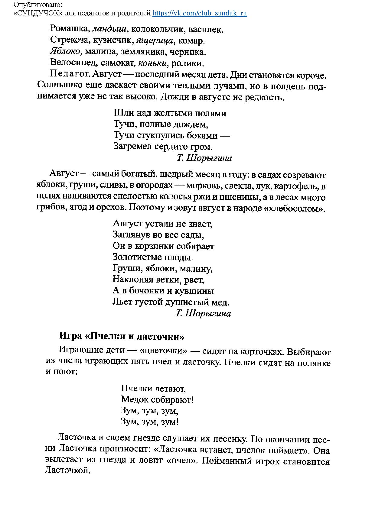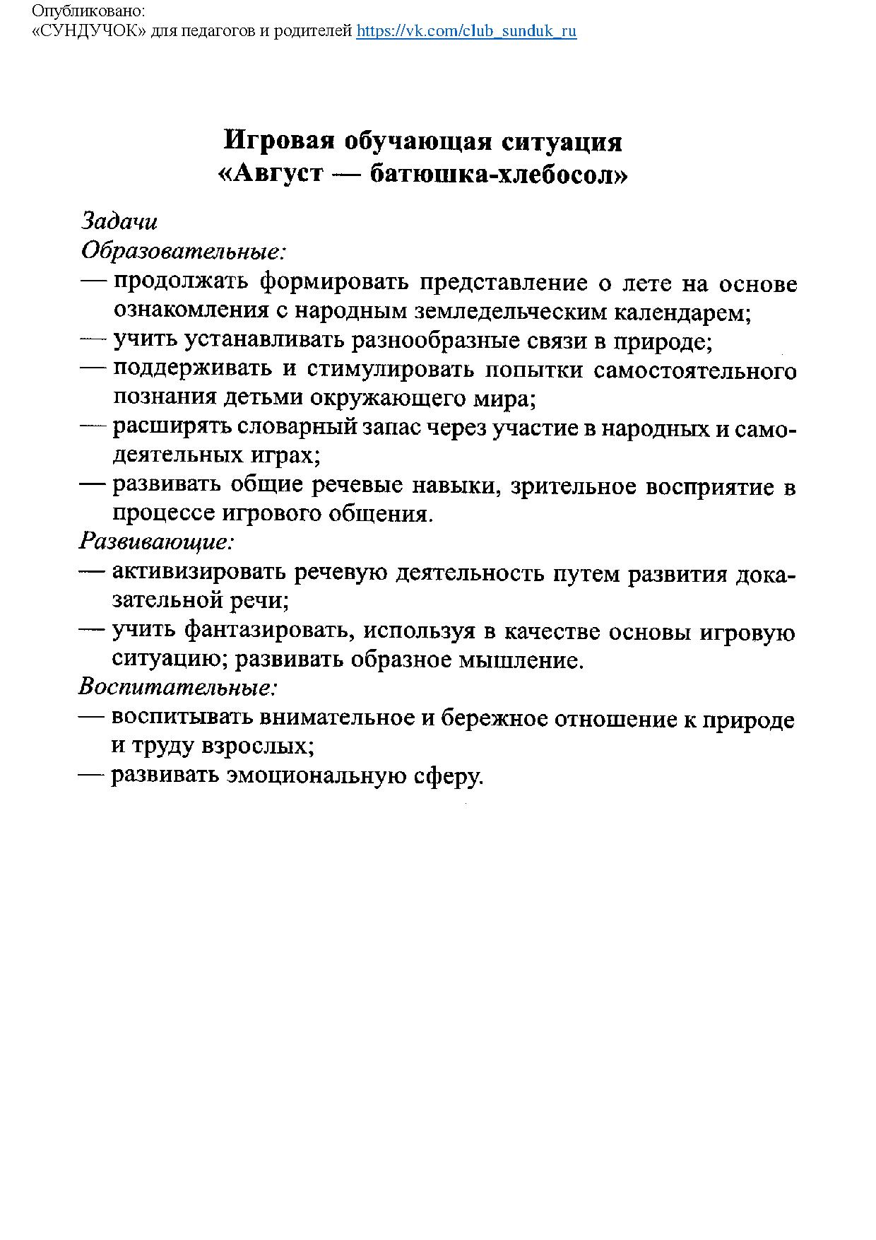Образовательные: продолжать формировать представления о лете на основе знакомства детей с существенными признаками августа, народным календарём. Учить устанавливать разнообразные связи в природе. Поддерживать и стимулировать попытки самостоятельного познания детьми окружающего мира. Расширять словарный запас через восприятие фольклора. Развивать общие речевые навыки.