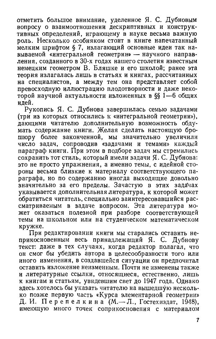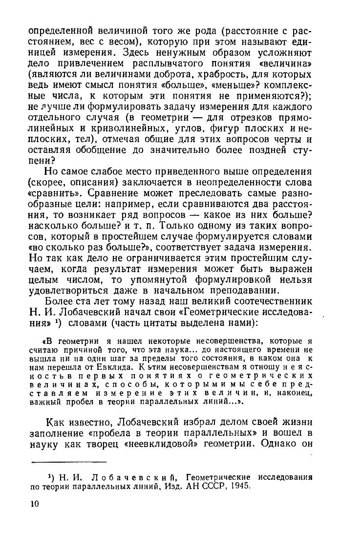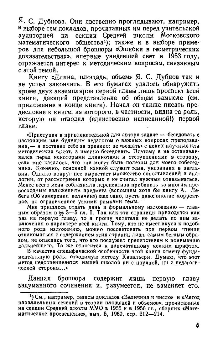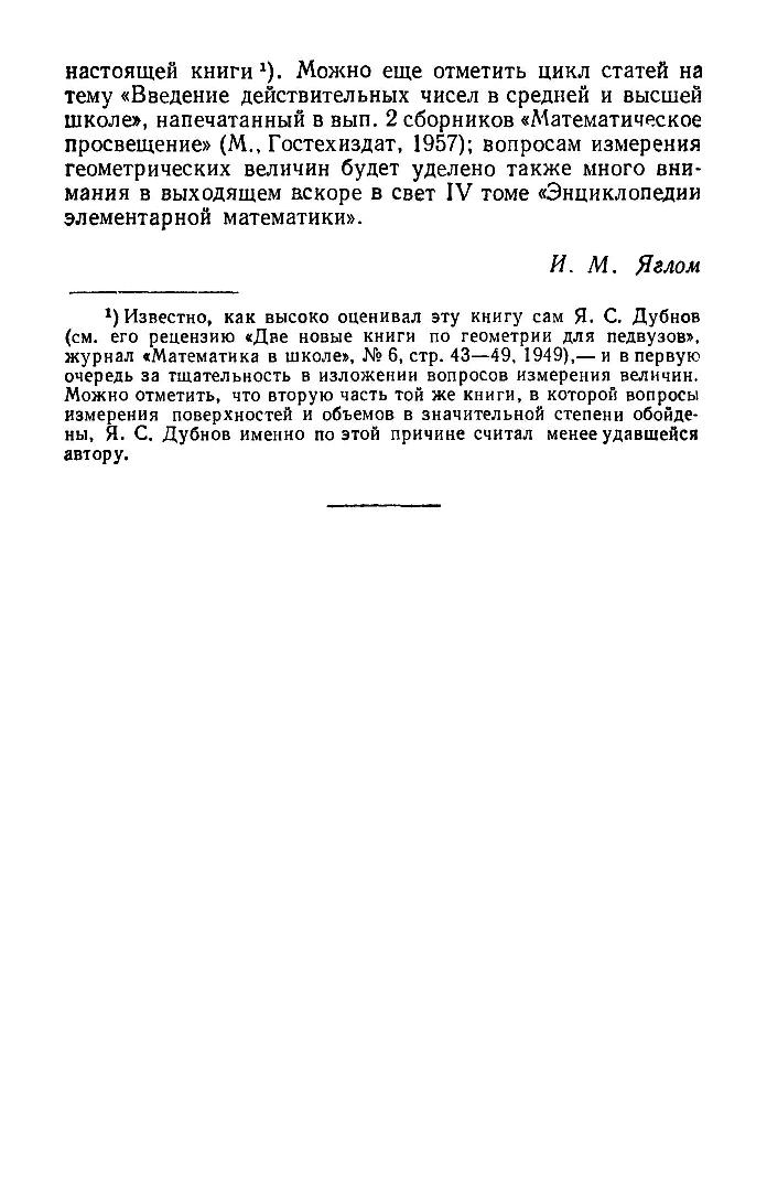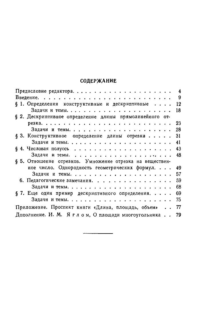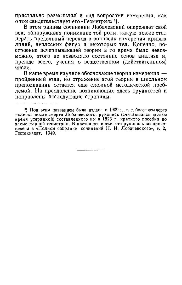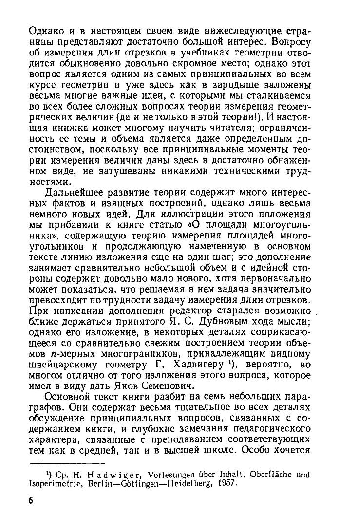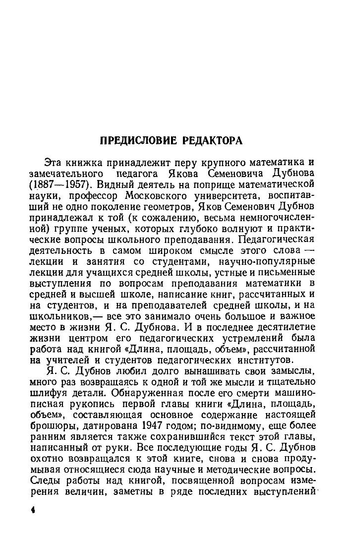 Эта книжка, принадлежащая перу умершего в 1957 г. Я.С. Дубнова, видного советского математика и выдающегося педагога, представляет собой первую часть задуманного им большого сочинения об измерении геометрических величин. Она посвящена вопросу об измерении длин отрезков и имеет совершенно законченный характер Брошюра отличается большой тщательностью и обстоятельностью изложения и в то же время доступностью. Каждый параграф заканчивается «задачами и темами для самостоятельной работы». Краткое дополнение редактора содержит изложение вопросов измерения площадей многоугольников, следующее схеме, принятой Я.С. Дубновым в теории измерения длин отрезков.