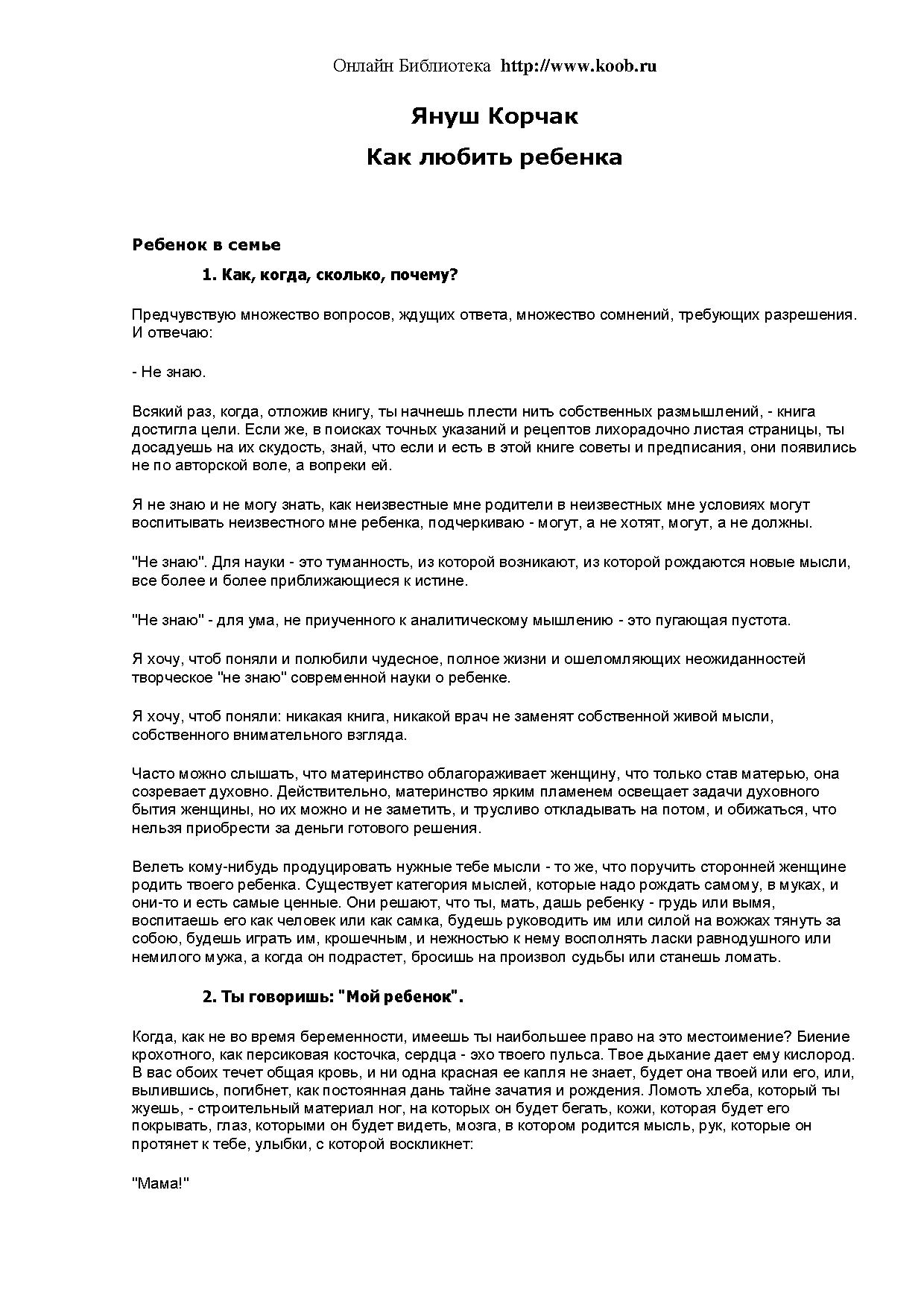 "Как любить ребенка" - руководство для ответственного родителя, своеобразное завещание, оставленное автором грядущим поколениям во имя детского счастья. Корчак уверенно заявляет: "Ребенок не бывает твоим". И с бесконечным теплом и уважением к самостоятельности маленькой личности доходчиво рассказывает о том, какие шаги могут предпринять отец и мать (в том числе и будущие), чтобы вырастить Человека с большой буквы.