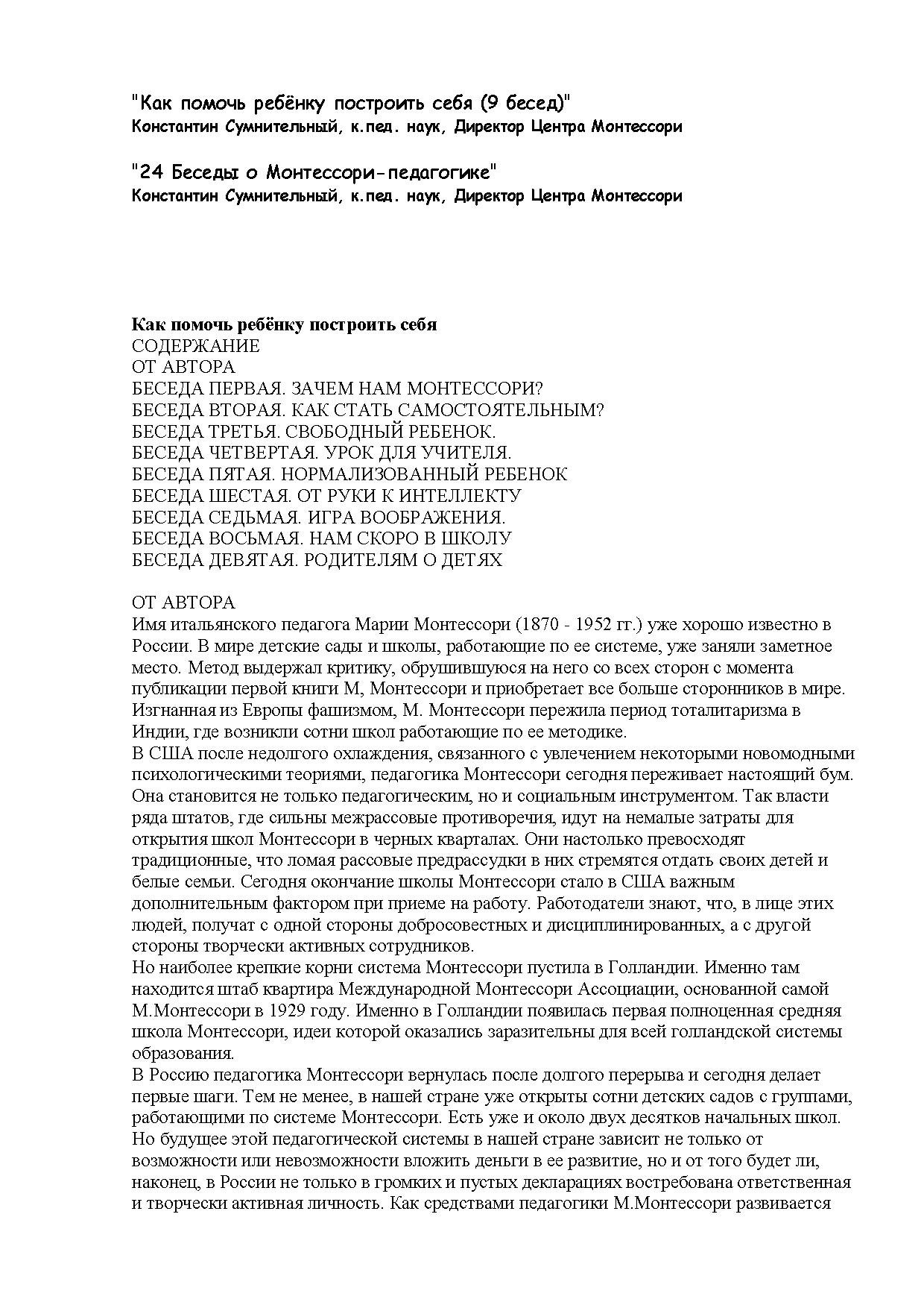 Имя итальянского педагога Марии Монтессори (1870 - 1952 гг.) уже хорошо известно в России. В мире детские сады и школы, работающие по ее системе, уже заняли заметное место. Метод выдержал критику, обрушившуюся на него со всех сторон с момента публикации первой книги М. Монтессори и приобретает все больше сторонников в мире. Изгнанная из Европы фашизмом, М. Монтессори пережила период тоталитаризма в Индии, где возникли сотни школ работающие по ее методике.
