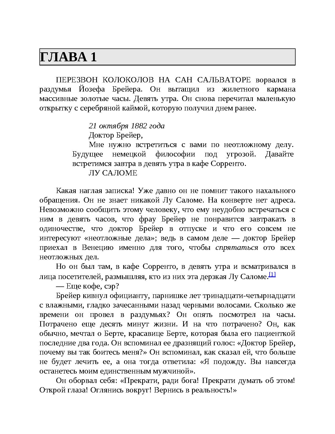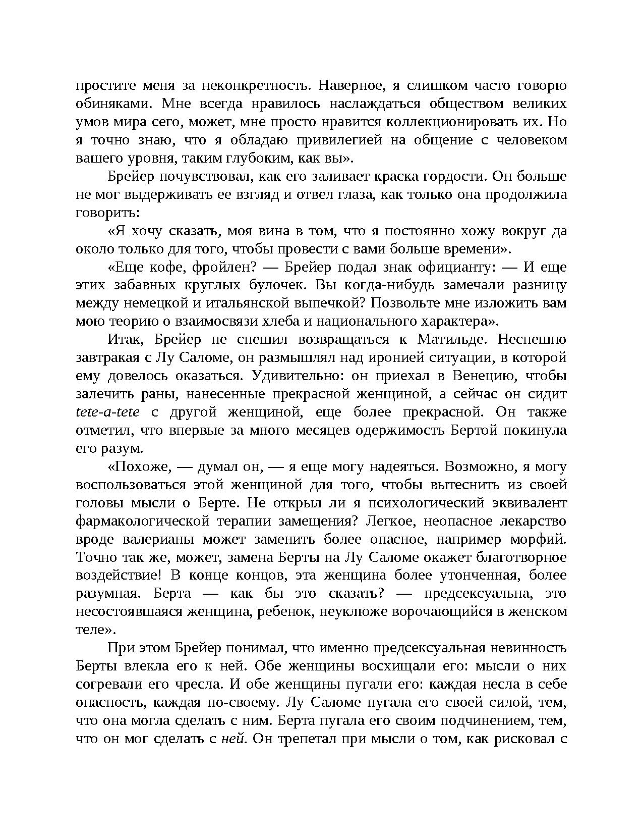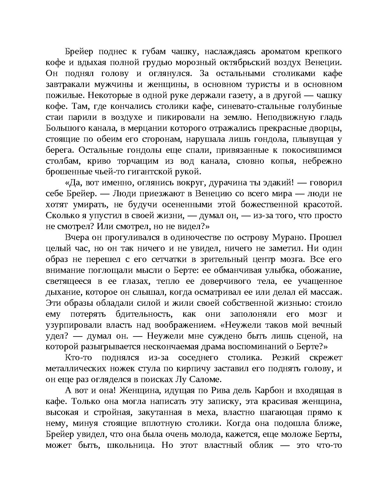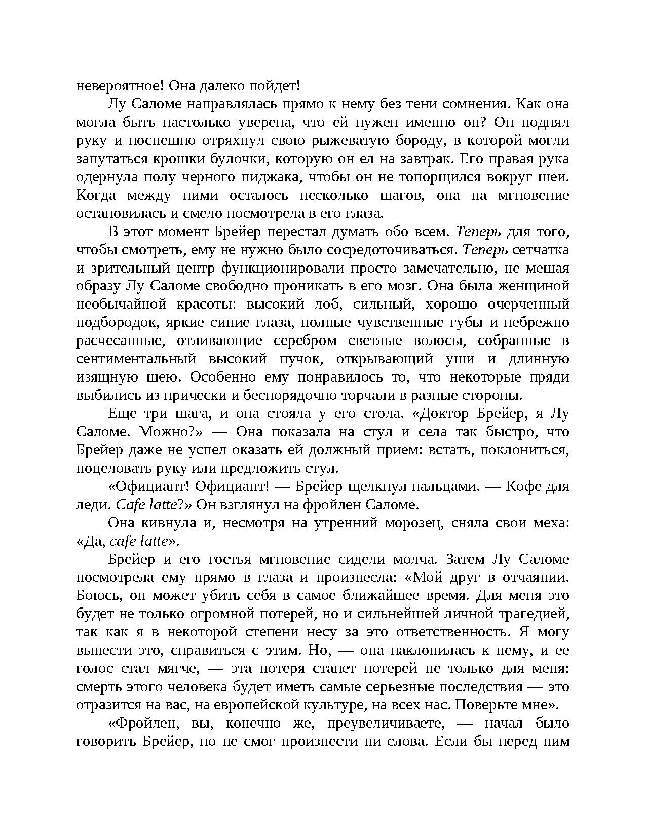 Яркое произведение знаменитого писателя и психотерпевта И. Ялома, написанное в форме романа, о драматических событиях, которые разворачиваются в Вене XIX века, в преддверии зарождения психоанализа.