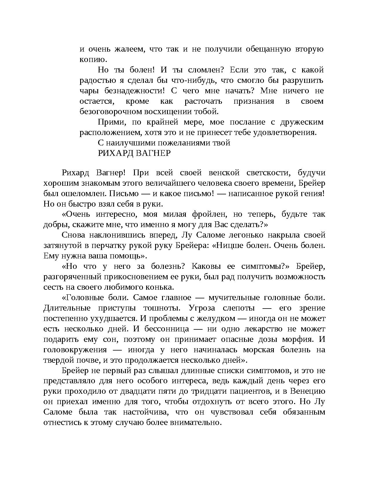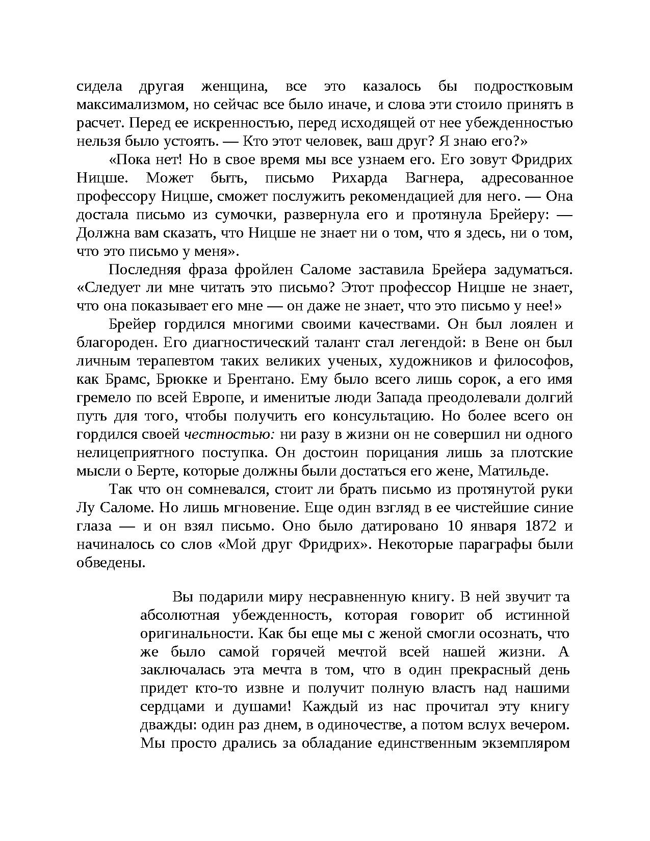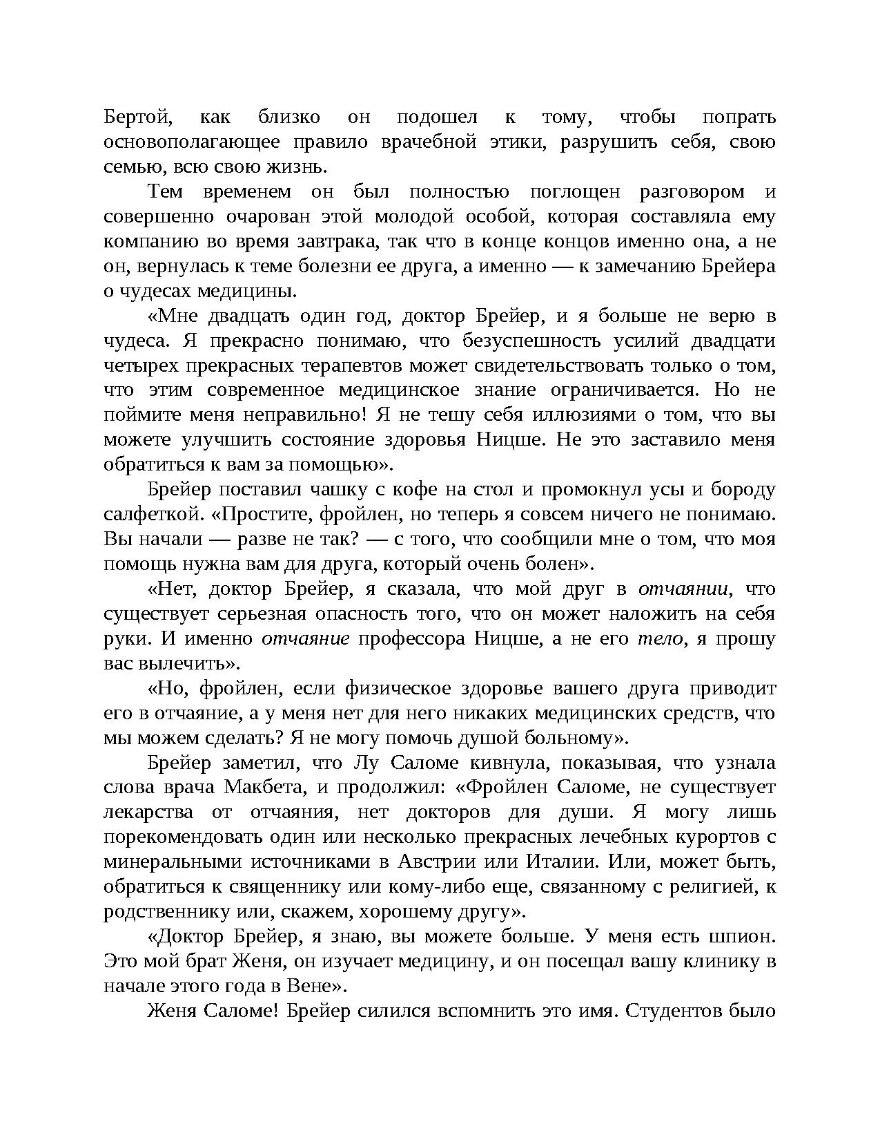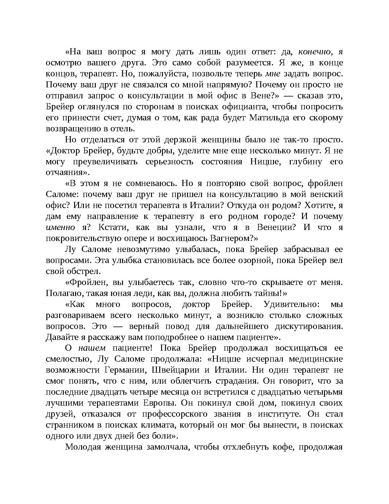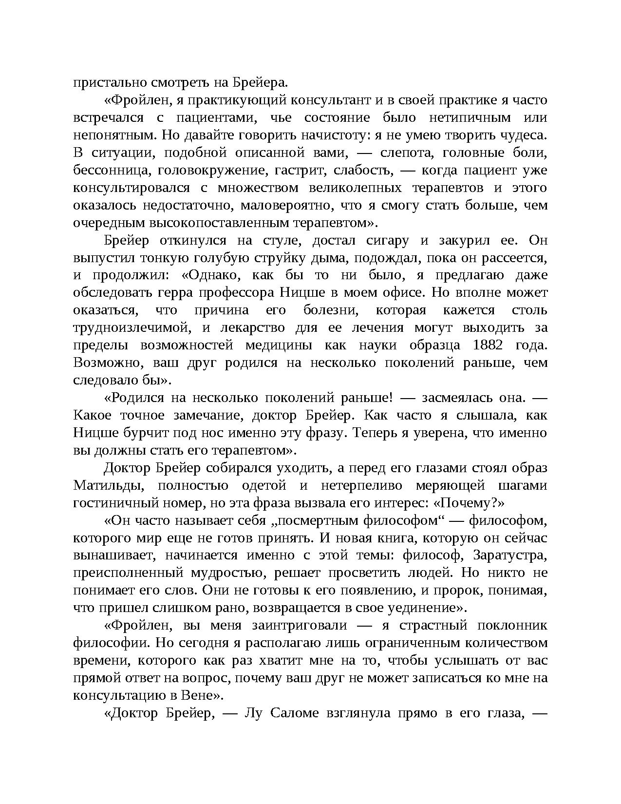 Факт и вымысел, страсть и отвращение, обязательства и свобода — драматические события разворачиваются на фоне интеллектуального брожения Вены XIX века, в преддверии зарождения психоанализа. Незаурядный пациент... Талантливый лекарь, терзаемый мучениями... Тайный договор. Соединение этих элементов порождает незабываемую сагу будто бы имевших место взаимоотношений величайшего философа Европы (Ф. Ницше) и одного из отцов-основателей психоанализа (Й. Брейера). Ялом втягивает в действие не только Ницше и Брейера, но и Лу Сало-ме, "Анну О." и молодого медика-интерна Зигмунда Фрейда.