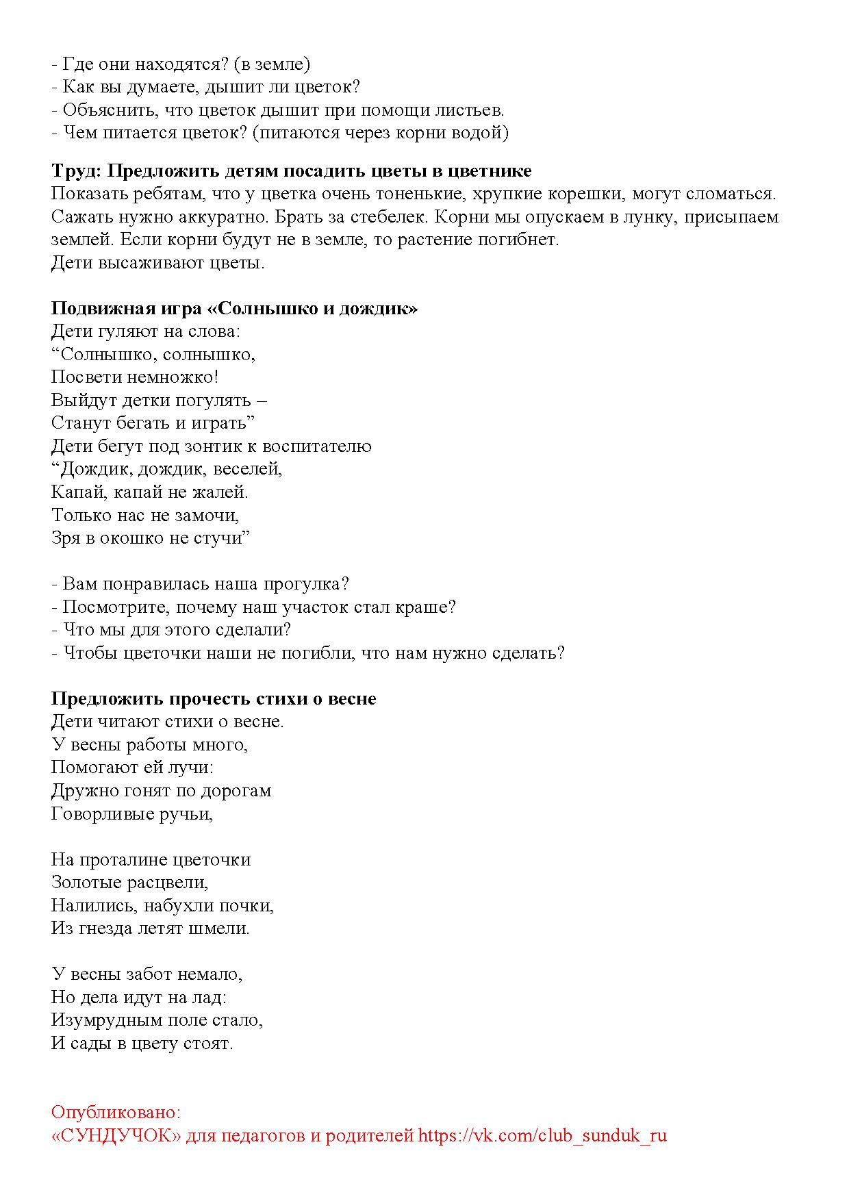 - учить детей замечать и рассказывать об изменениях в природе с приходом весны, устанавливать простейшие причинно-следственные связи; рассмотреть первую зеленую травку на проталинках и первоцветы;