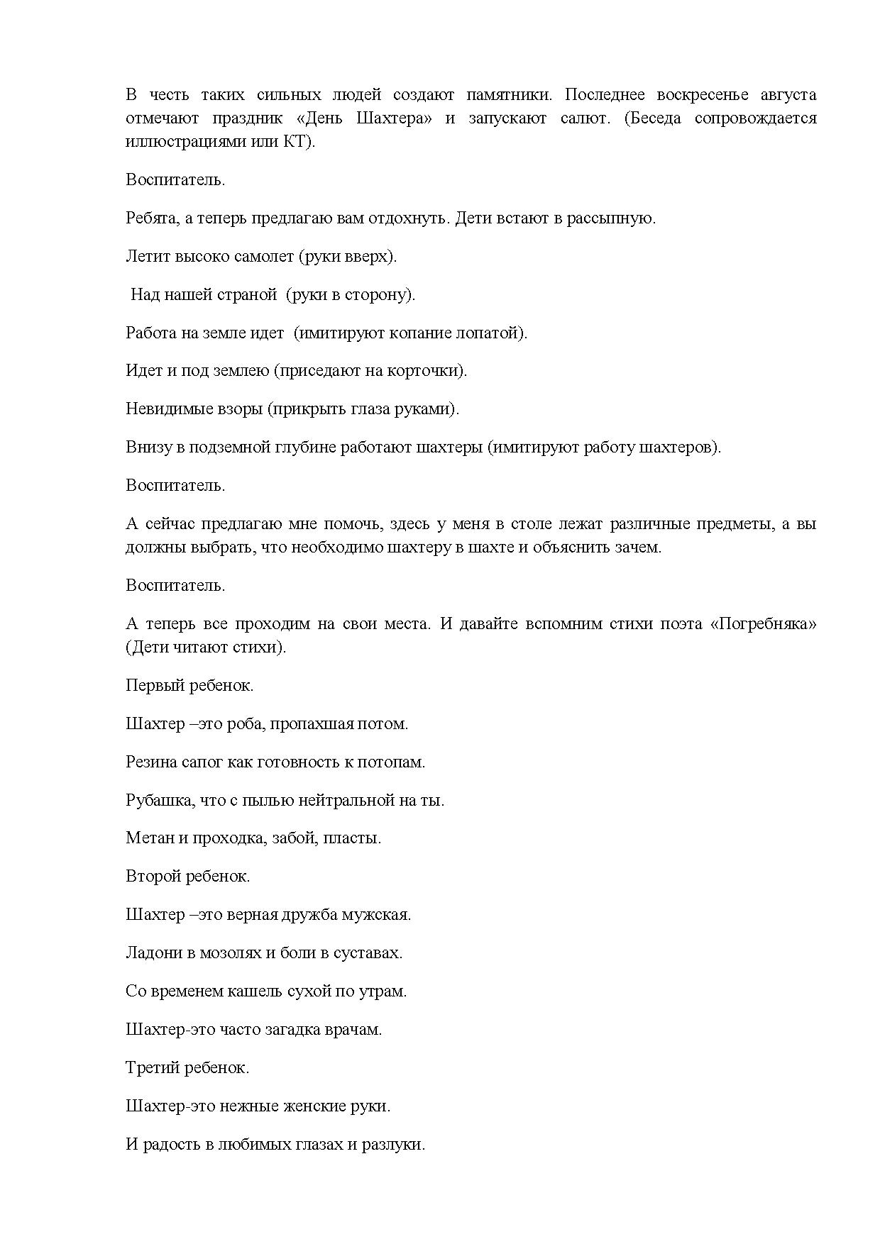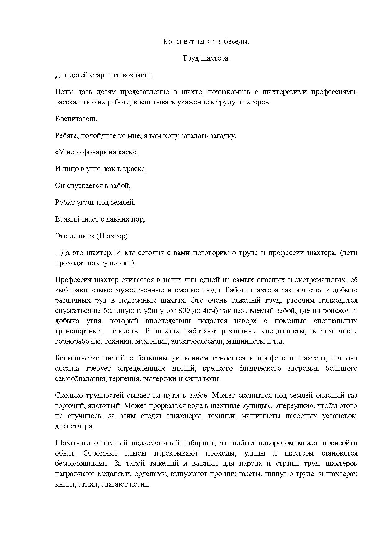 Цель: дать детям представление о шахте, познакомить с шахтерскими профессиями, рассказать о их работе, воспитывать уважение к труду шахтеров.
