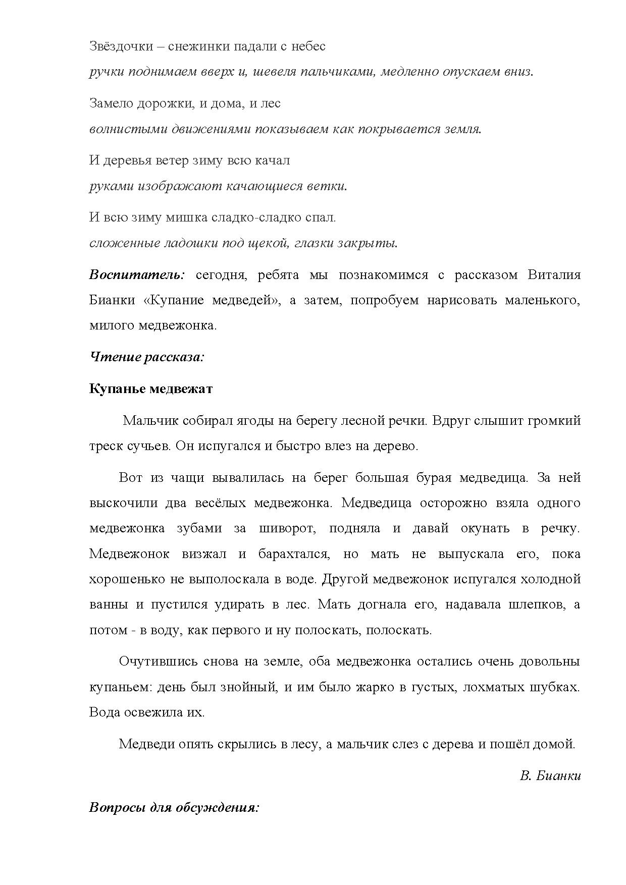 1. Познакомить детей с творчеством Виталия Бианки, рассказом «Купание медвежат».