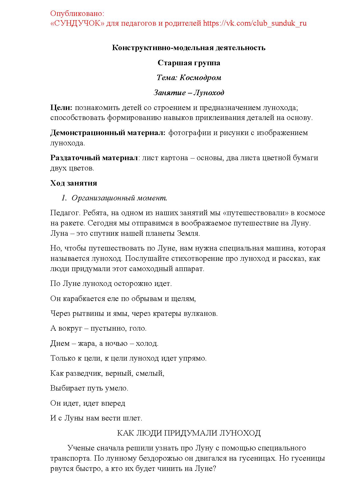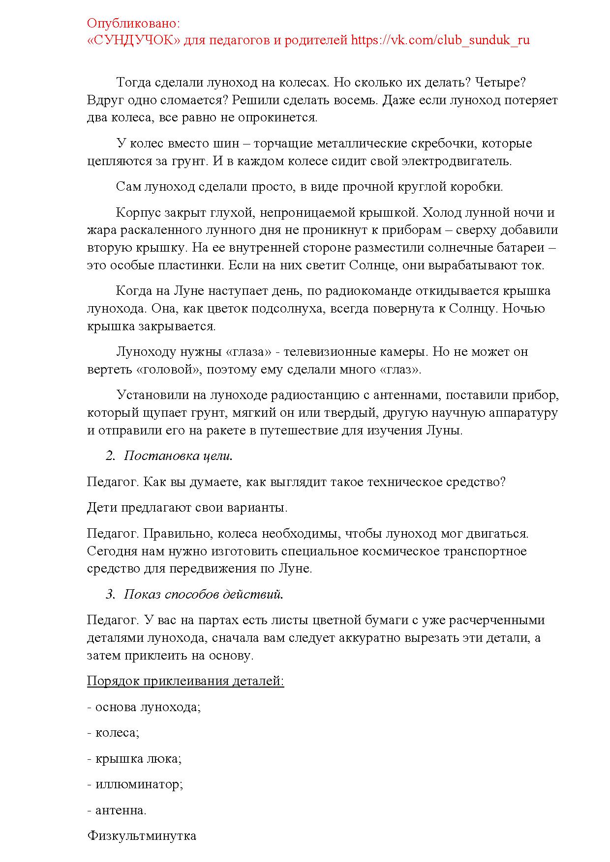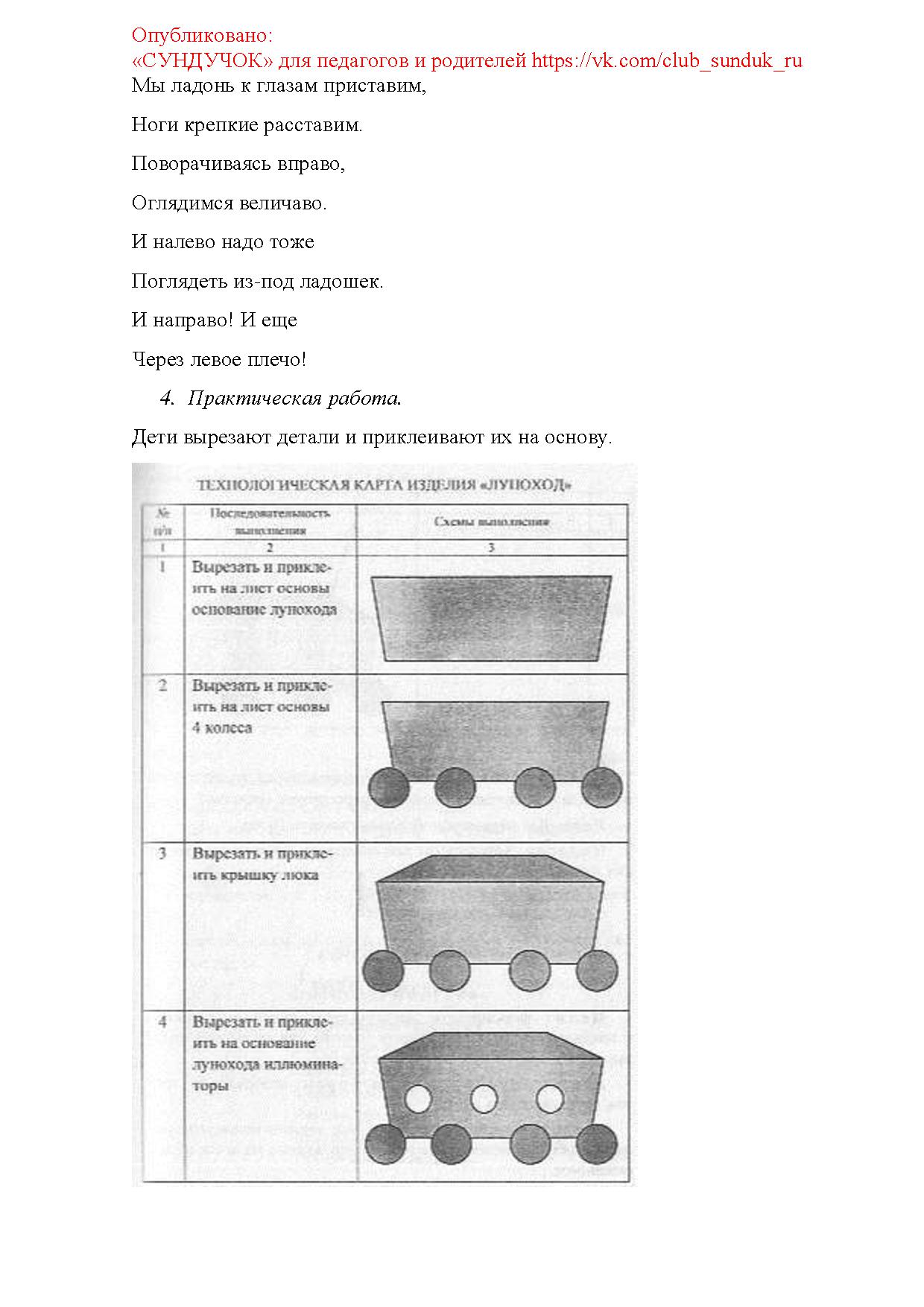 Цели: познакомить детей со строением и предназначением лунохода; способствовать формированию навыков приклеивания деталей на основу.
