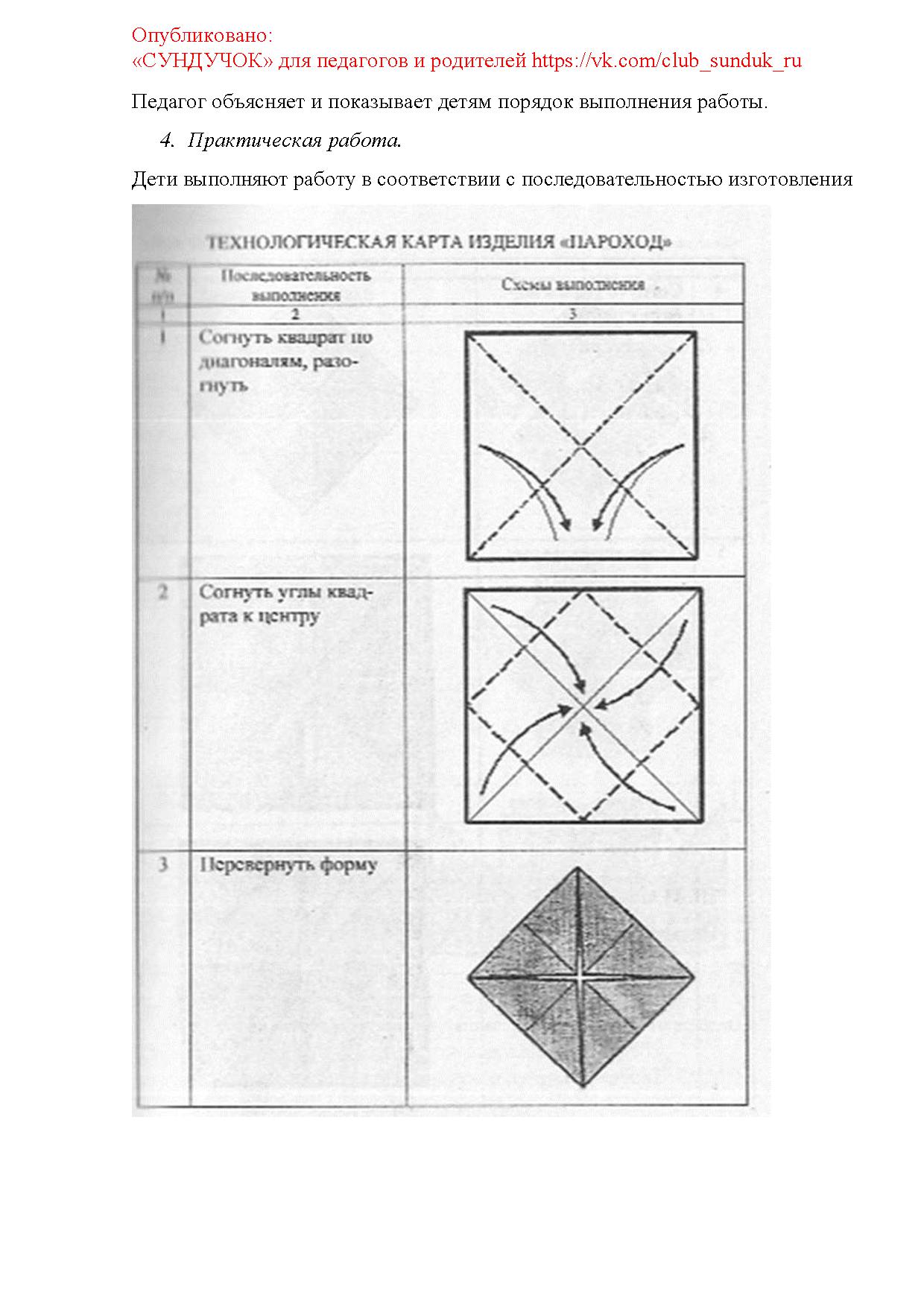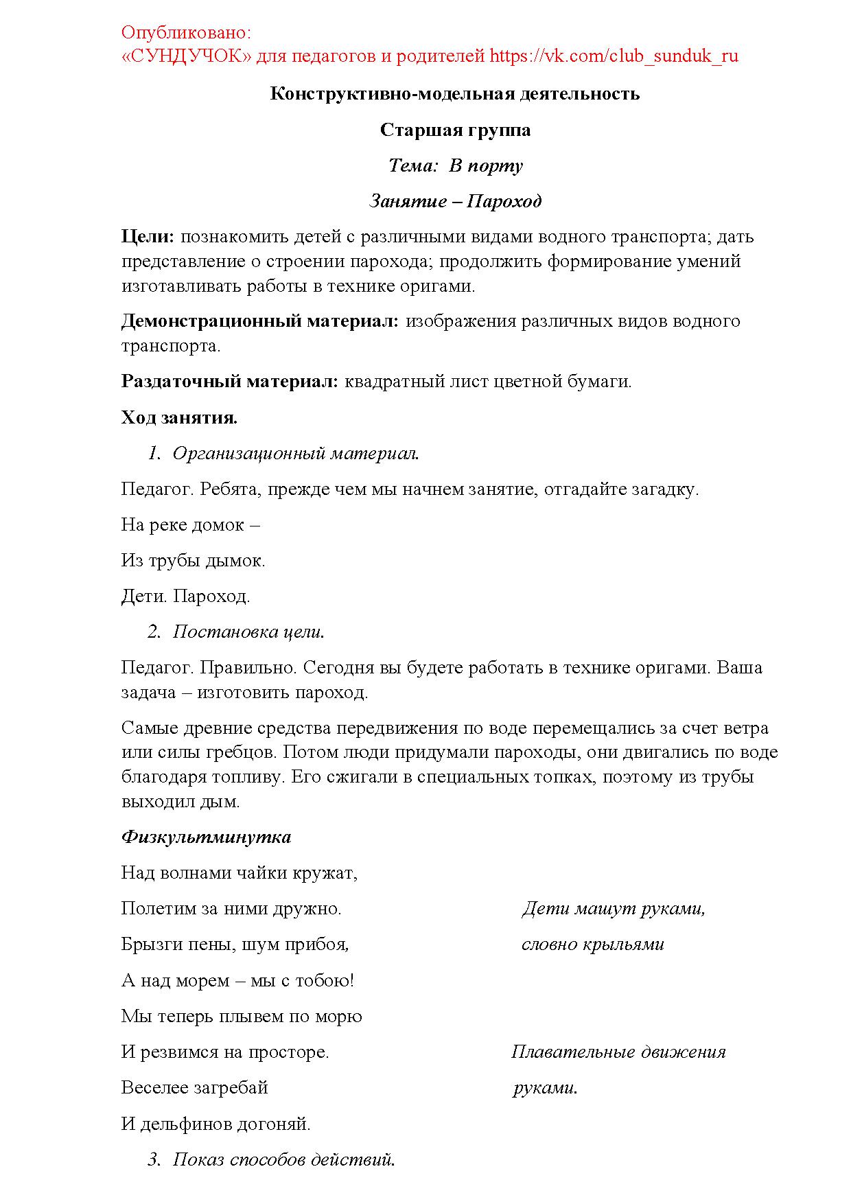 Цели: познакомить детей с различными видами водного транспорта; дать представление о строении парохода; продолжить формирование умений изготавливать работы в технике оригами.