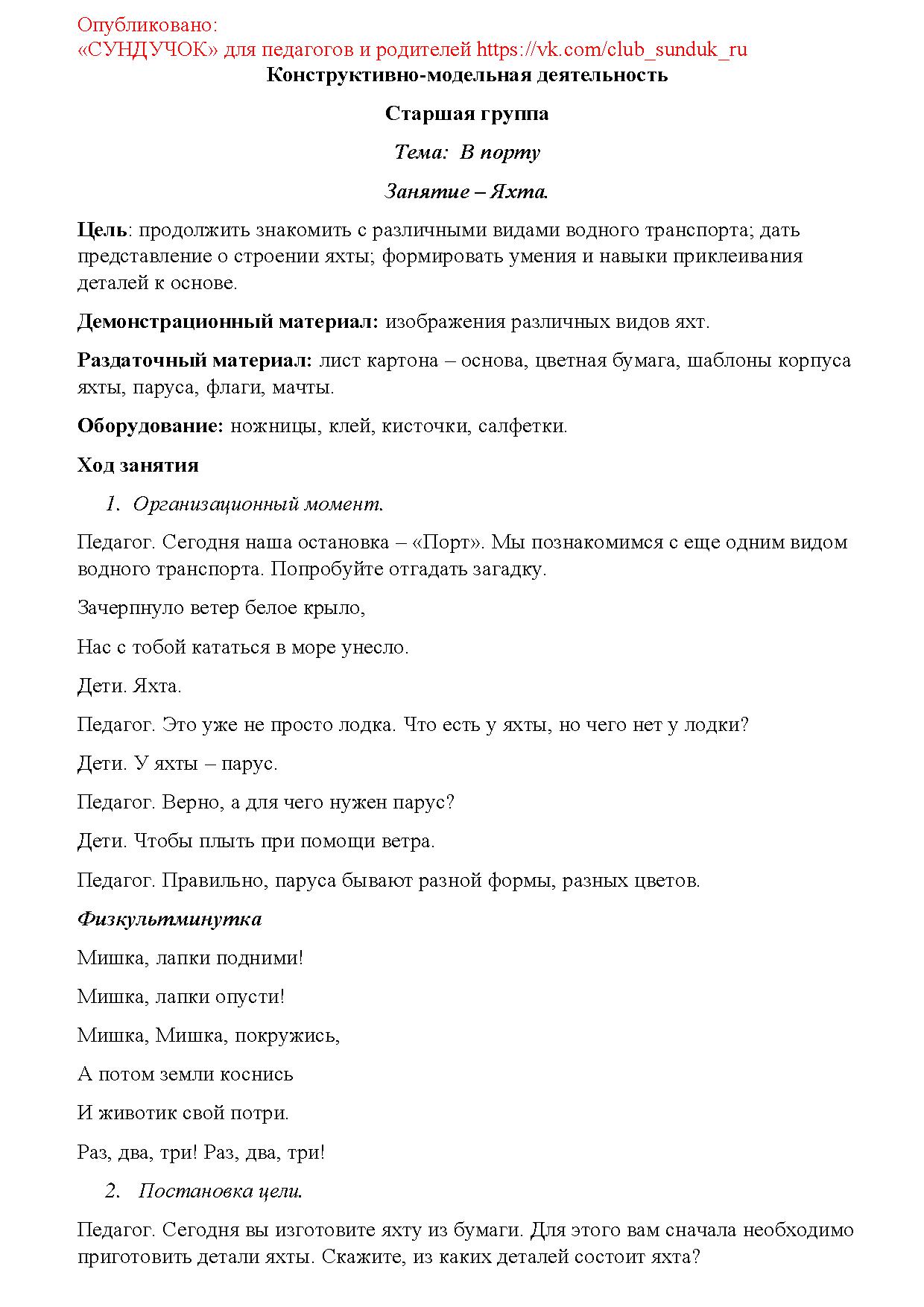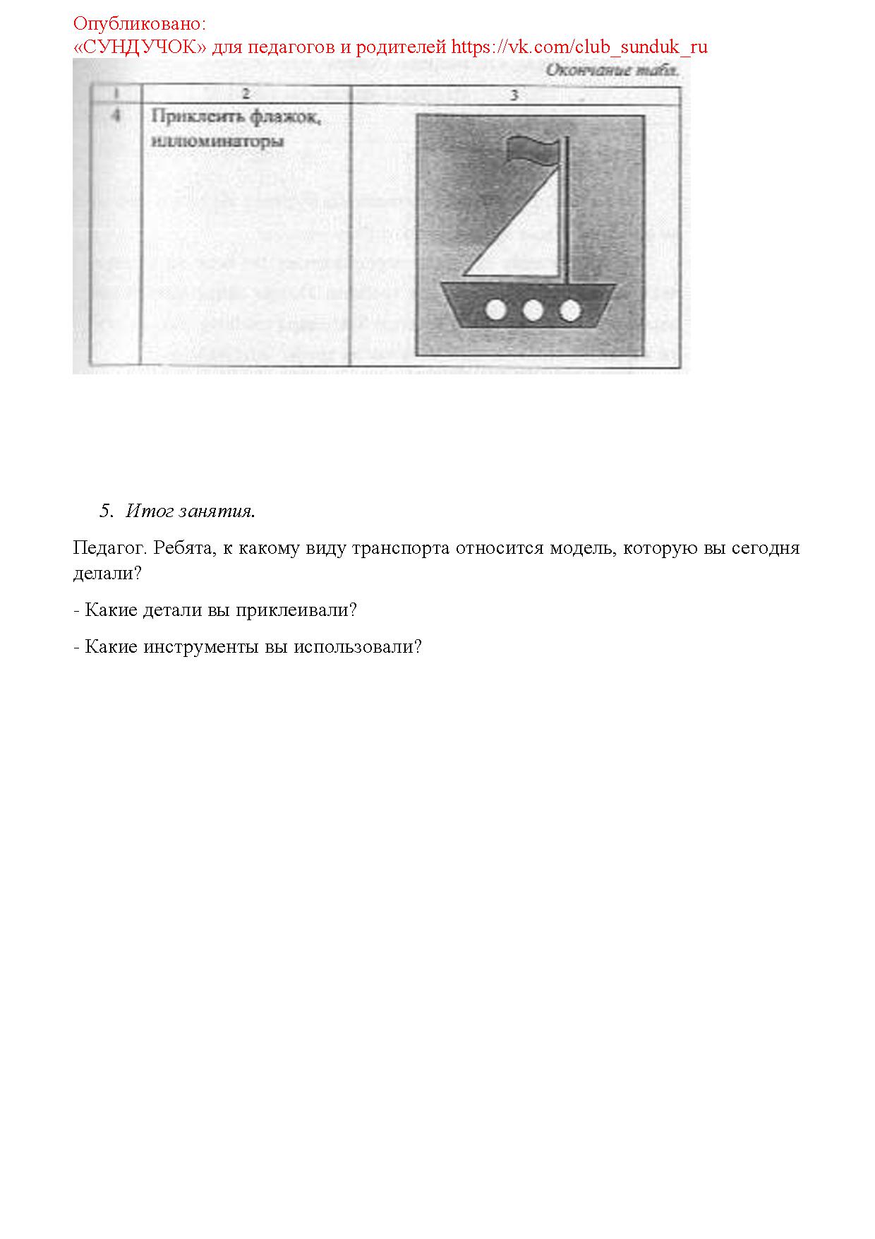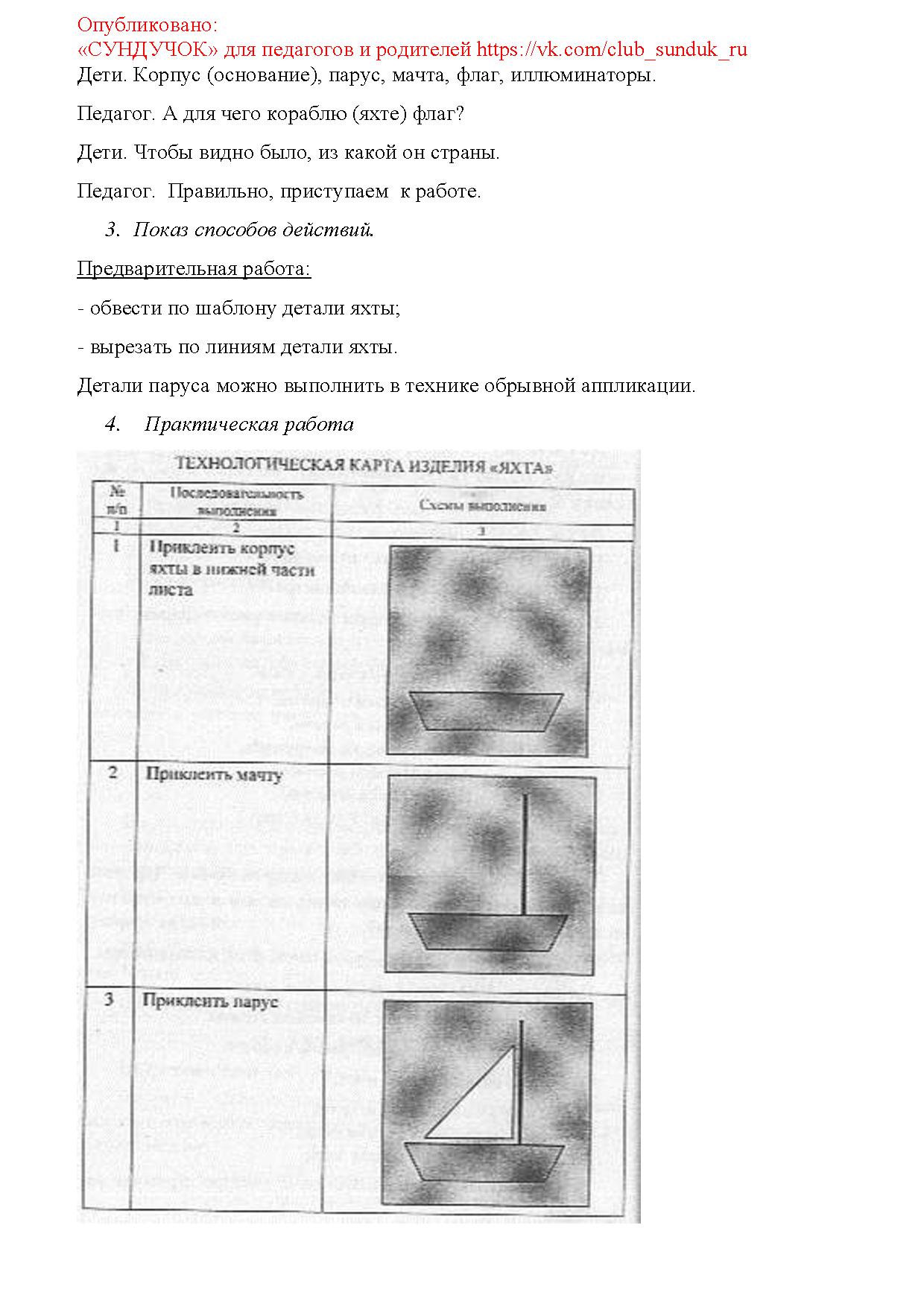 Цель: продолжить знакомить с различными видами водного транспорта; дать представление о строении яхты; формировать умения и навыки приклеивания деталей к основе.