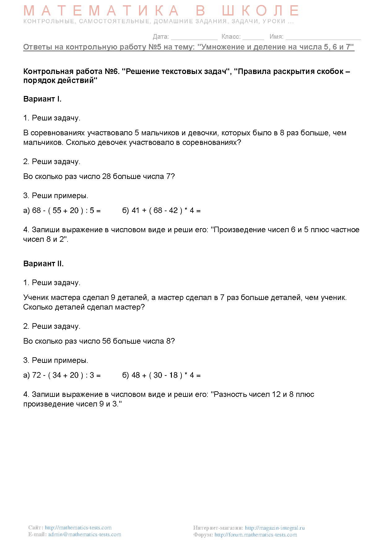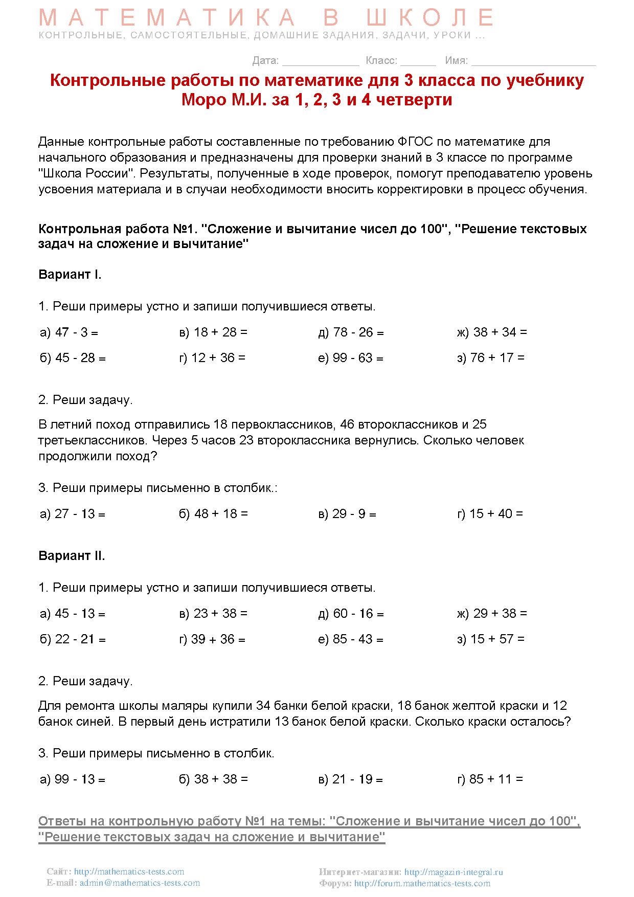 Данные контрольные работы составленные по требованию ФГОС по математике для начального образования и предназначены для проверки знаний в 3 классе по программе "Школа России".