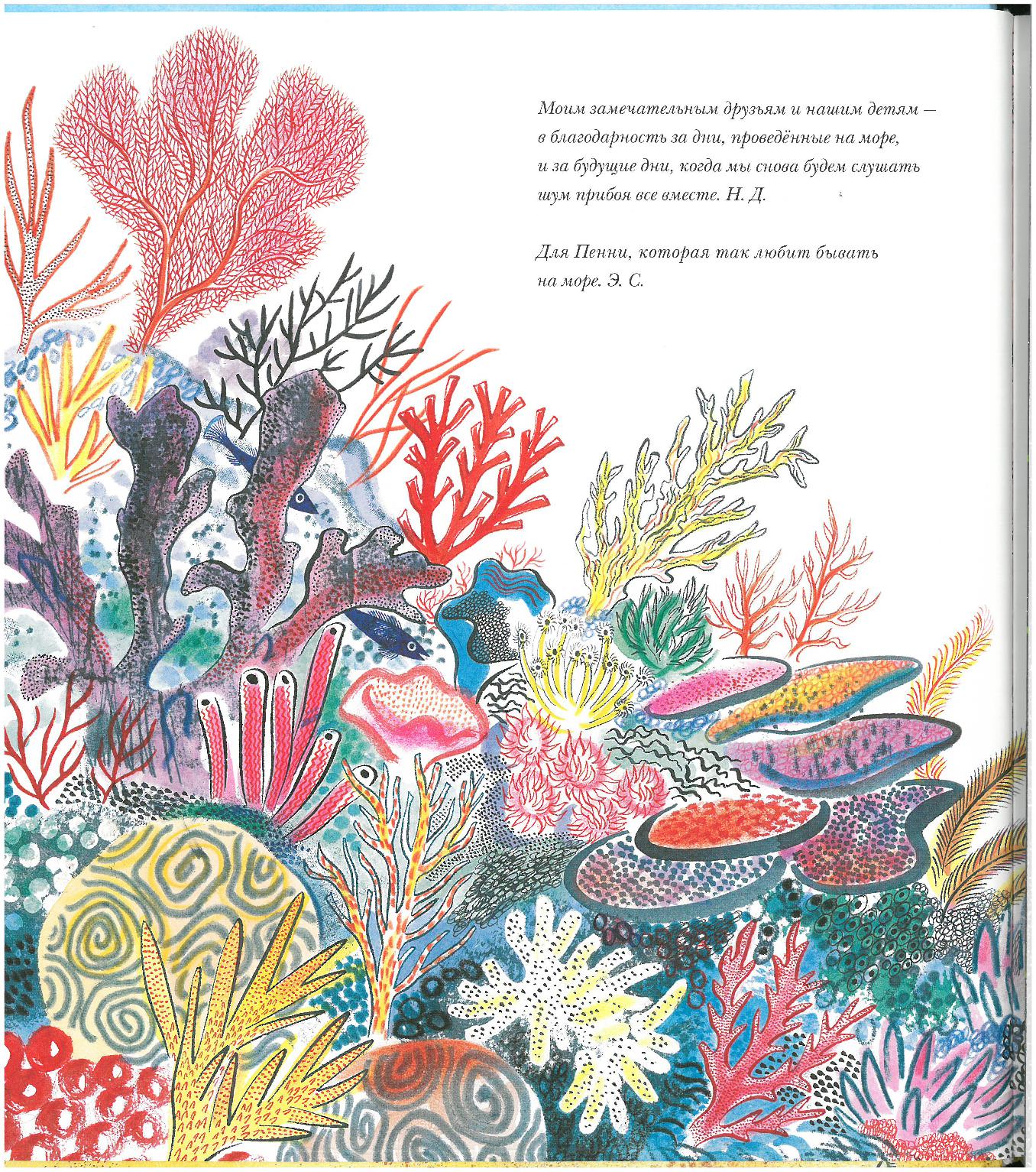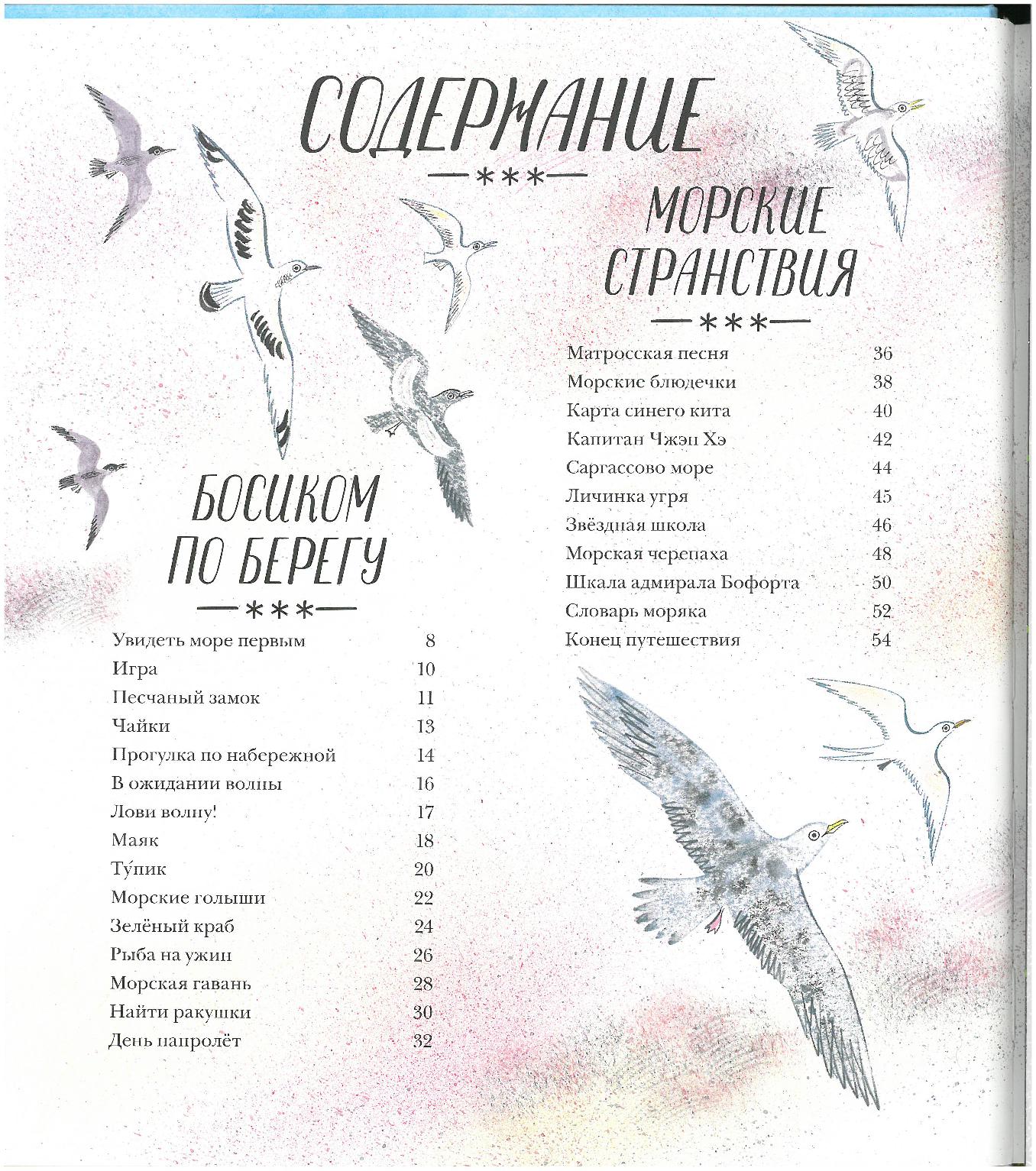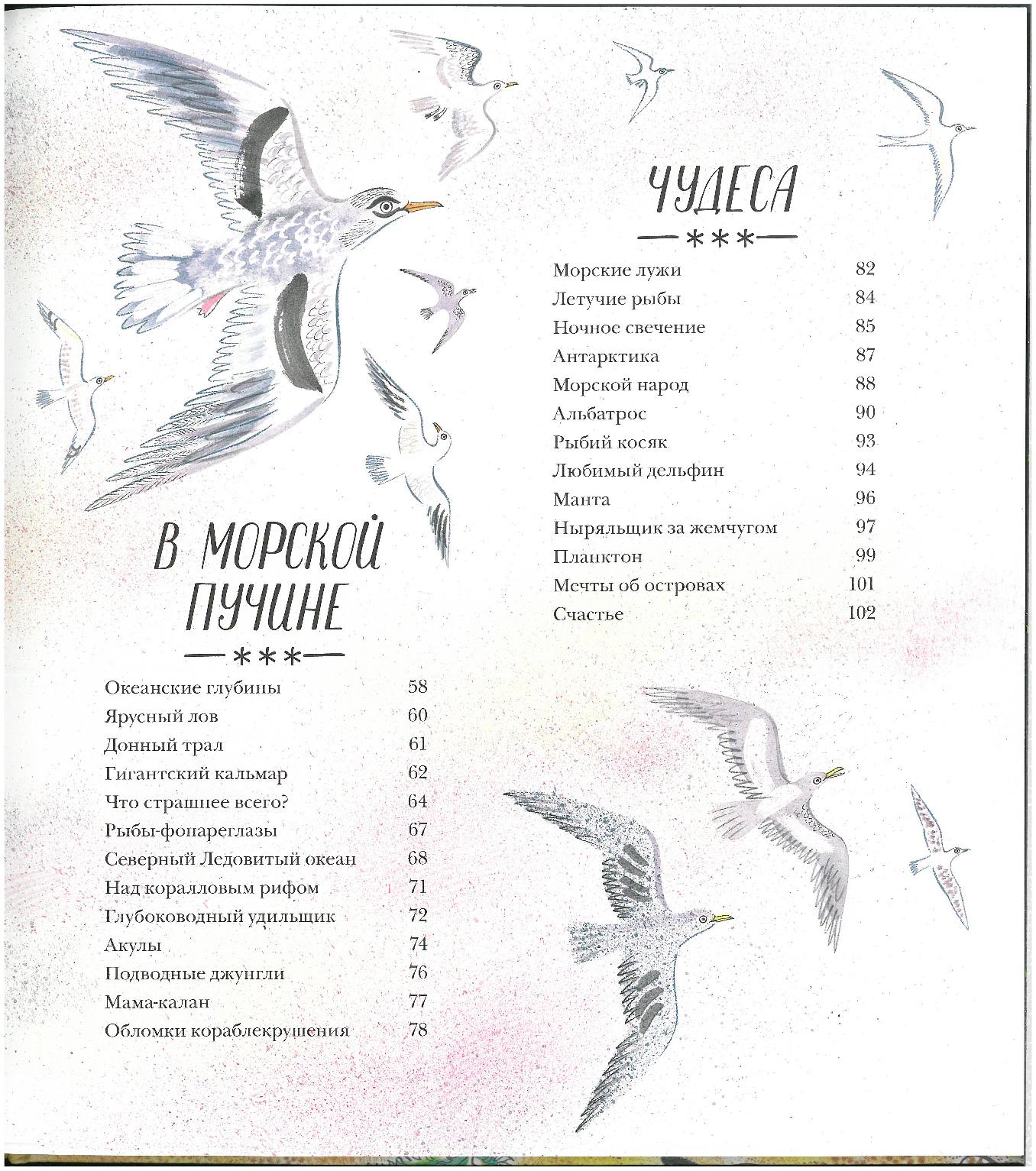 В этой красочной книге собраны поэтичные тексты разных видов (стихи, проза, белые стихи) о мантах, тупиках и летучих рыбах, гаванях, штормах и ныряльщиках за жемчугом. Текст украшают великолепные рисунки морской жизни в водах Арктики и Антарктики, тропических островов, обломков древних кораблей и коралловых рифов. Описываются и морские обитатели, знакомые и незнакомые широкому кругу читателей, привычки и обычаи живущих около моря народов.
