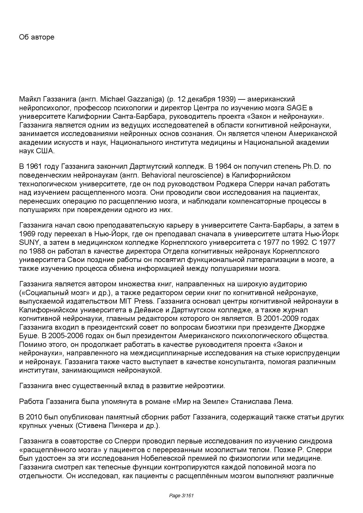 В книге "Кто за главного?" Майкл Газзанига объясняет, несет ли каждый человек личную ответственность за свои поступки. Он рассказывает, как благодаря исследованиям расщепленного мозга был открыт модуль интерпретации, заставляющий нас считать, будто мы действуем по собственной свободной воле и сами принимаем важные решения.