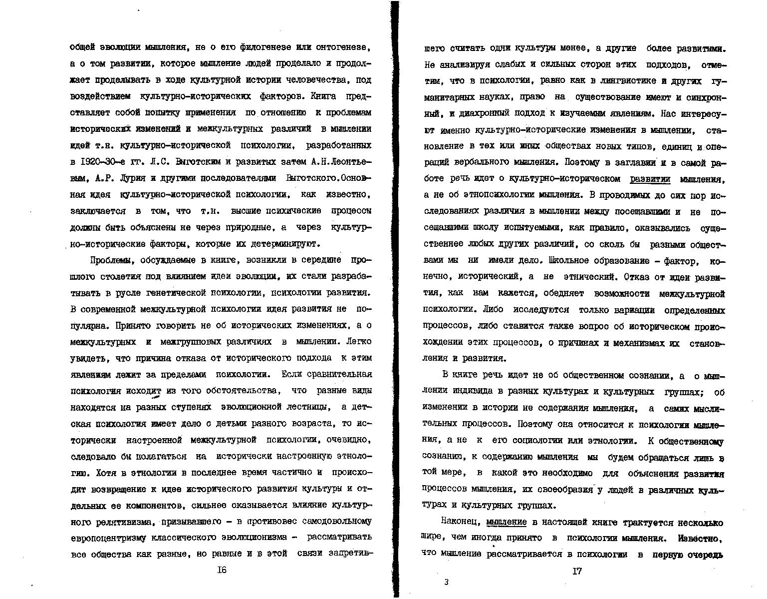 В монографии рассматриваются проблемы исторических изменении и межкультурных различий в процессах вербального (речевого) мышления. Анализируются старые и современные концепции исторического развития мышления и связей между культурой и мышлением. Выдвигается новая, концепция исторического развития мышления, разработанная в традициях школы Выготского-Лурия-Леонтьева. На основе этой концепции обсуждаются экспериментальные данные о различиях между процессами вербального мышления у посещавших и не посещавших школу людей.