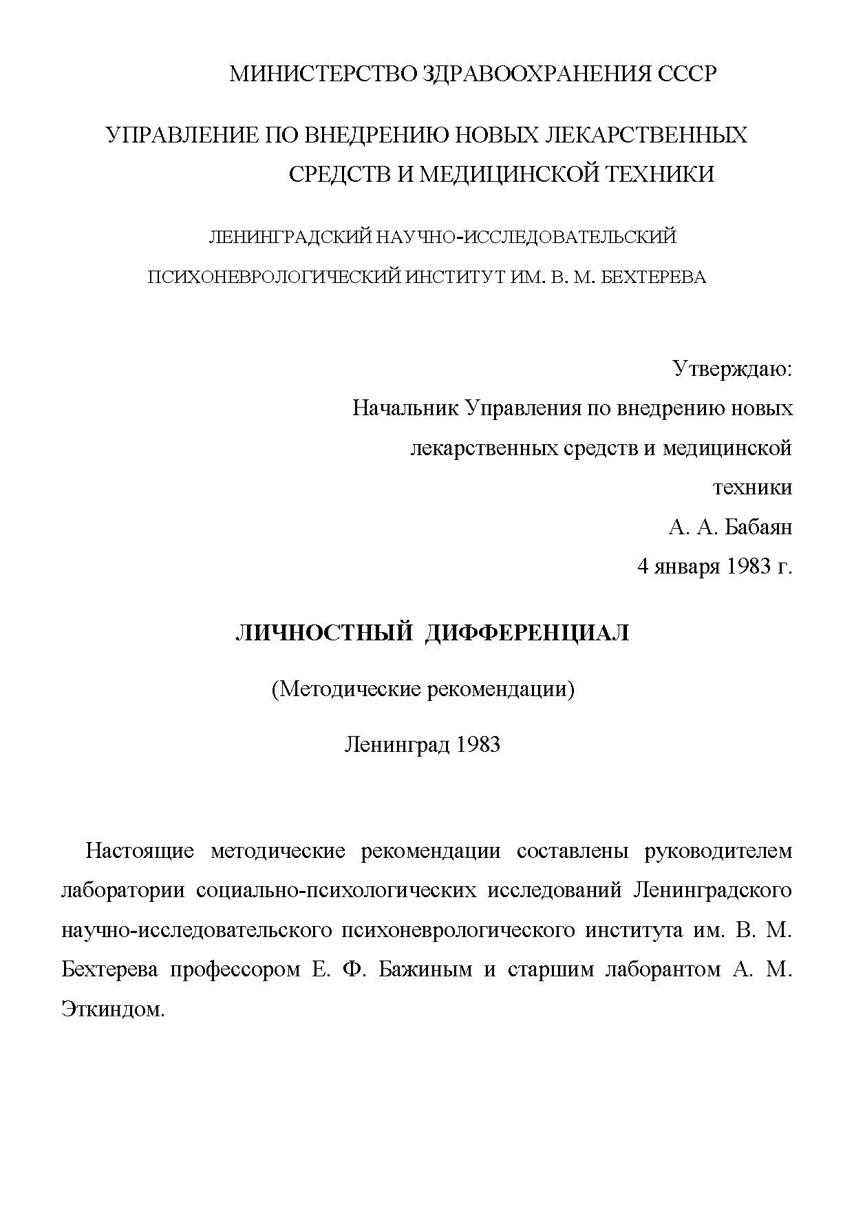 Настоящие методические рекомендации составлены руководителем лаборатории социально-психологических исследований Ленинградского научно-исследовательского психоневрологического института им. В. М. Бехтерева профессором Е. Ф. Бажиным и старшим лаборантом А. М. Эткиндом.