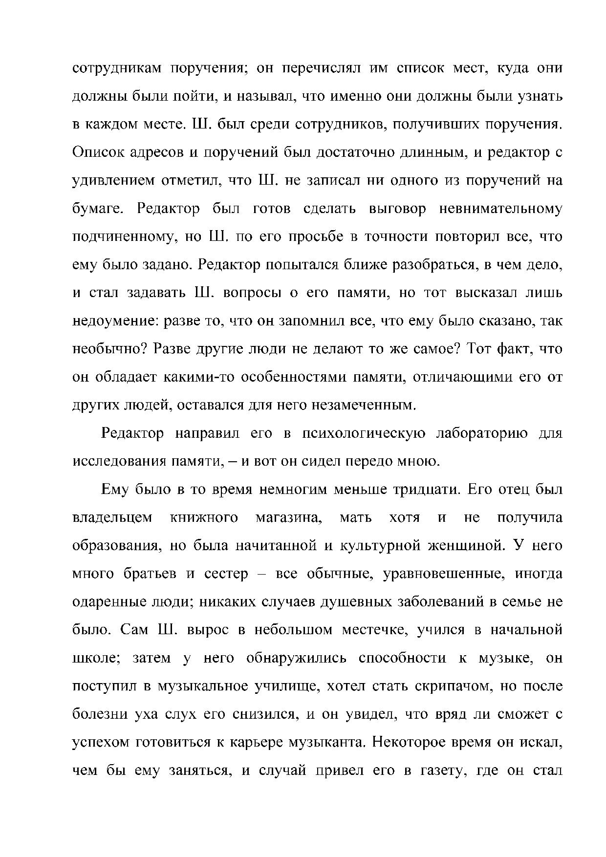 Книга о человеке с удивительными способностями – Соломоне Вениаминовиче Ш. (1892 – 1958). Психологи за 30 лет обследования этого человека так и не смогли найти верхних границ его памяти. Ему не важно