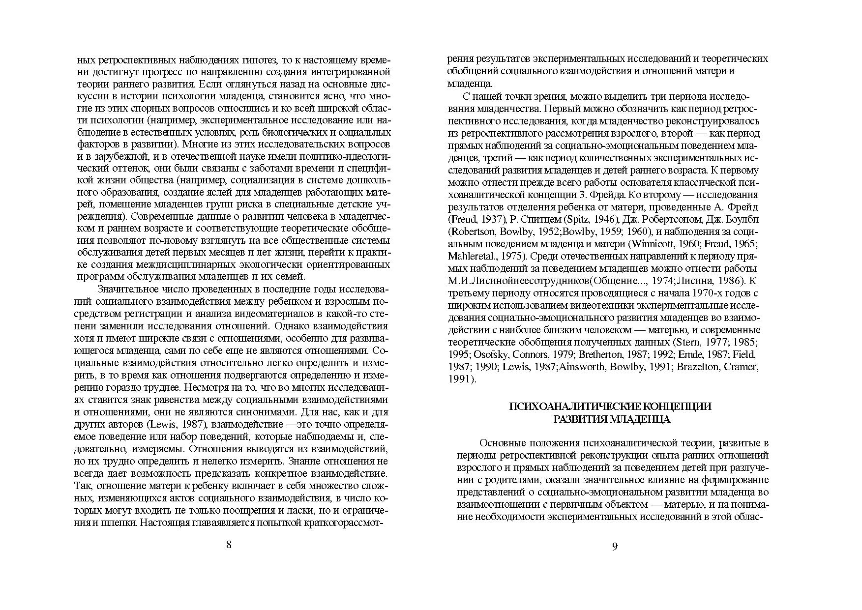 Приводятся основные результаты экспериментальных исследований и теоретические обобщения в этой области. Обсуждается влияние индивидуальных особенностей матери на взаимодействие и привязанность матерей и младенцев, в том числе из групп риска. Анализируется состояние младенцев и детей раннего возраста в условиях социальной депривации. Рассматриваются современные психотерапевтические и социально-педагогические программы раннего вмешательства.