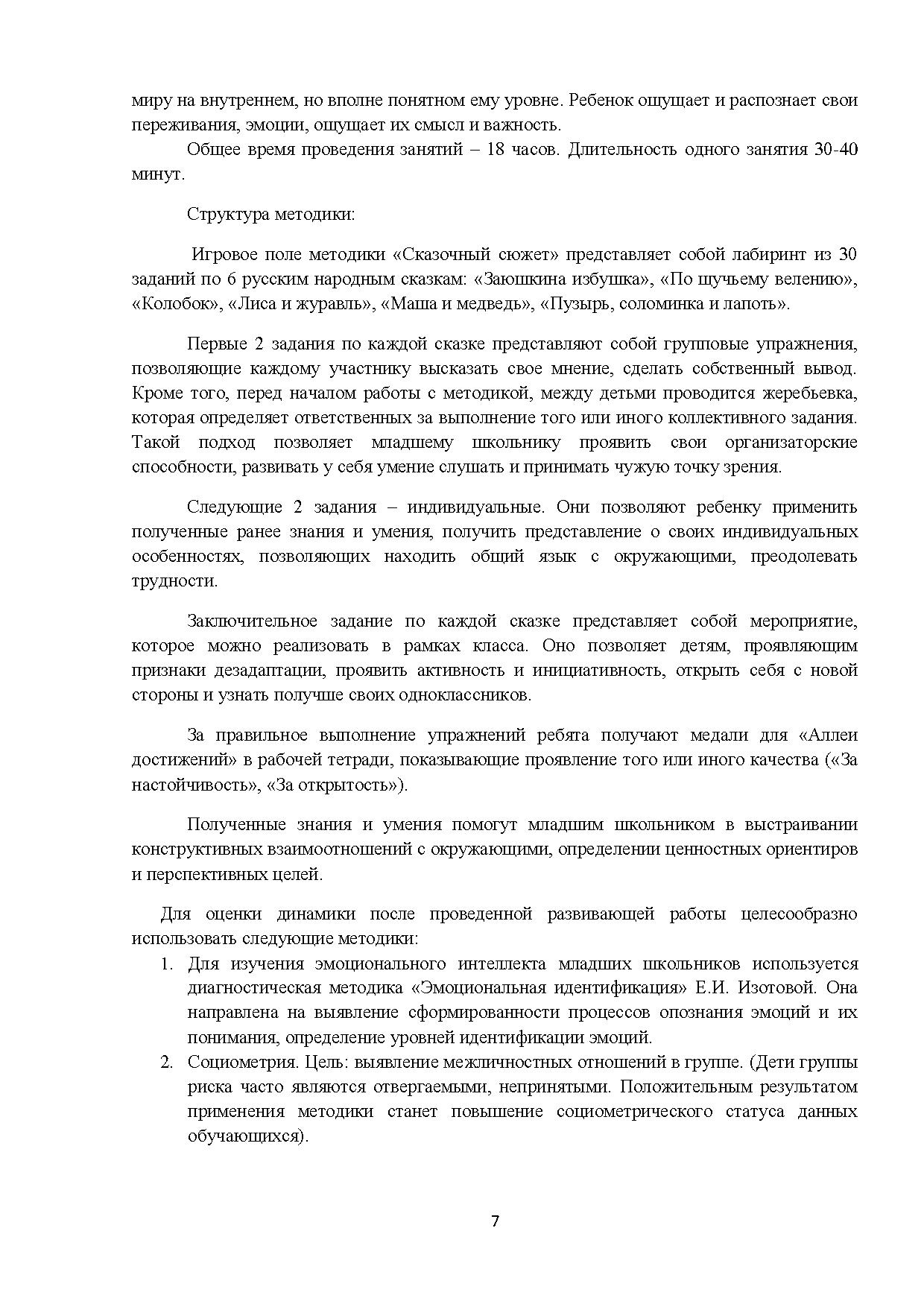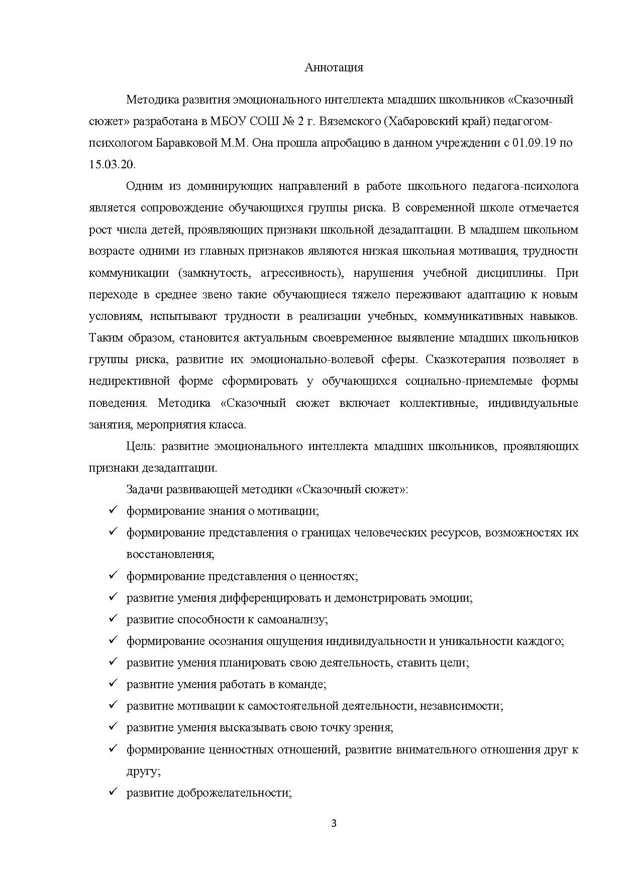 Методика развития эмоционального интеллекта младших школьников «Сказочный сюжет» разработана в МБОУ СОШ № 2 г. Вяземского (Хабаровский край) педагогомпсихологом Баравковой М.М. Она прошла апробацию в данном учреждении с 01.09.19 по 15.03.20.
