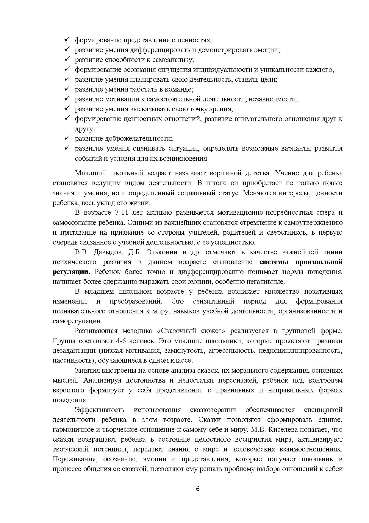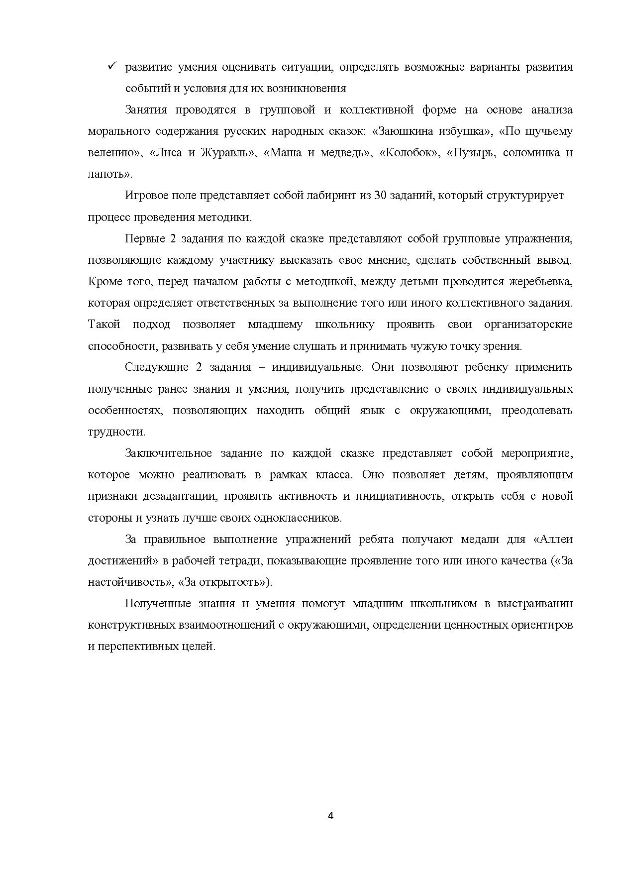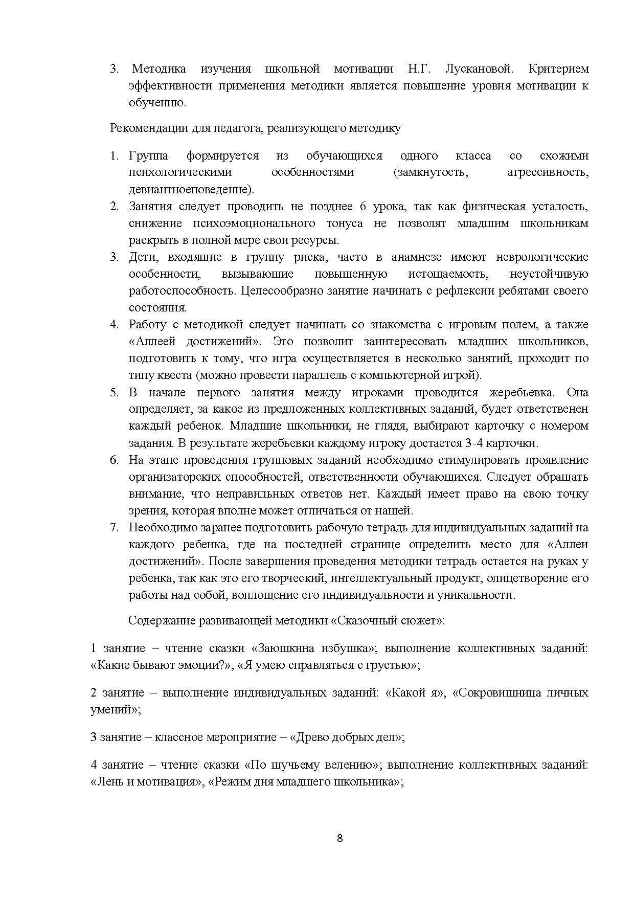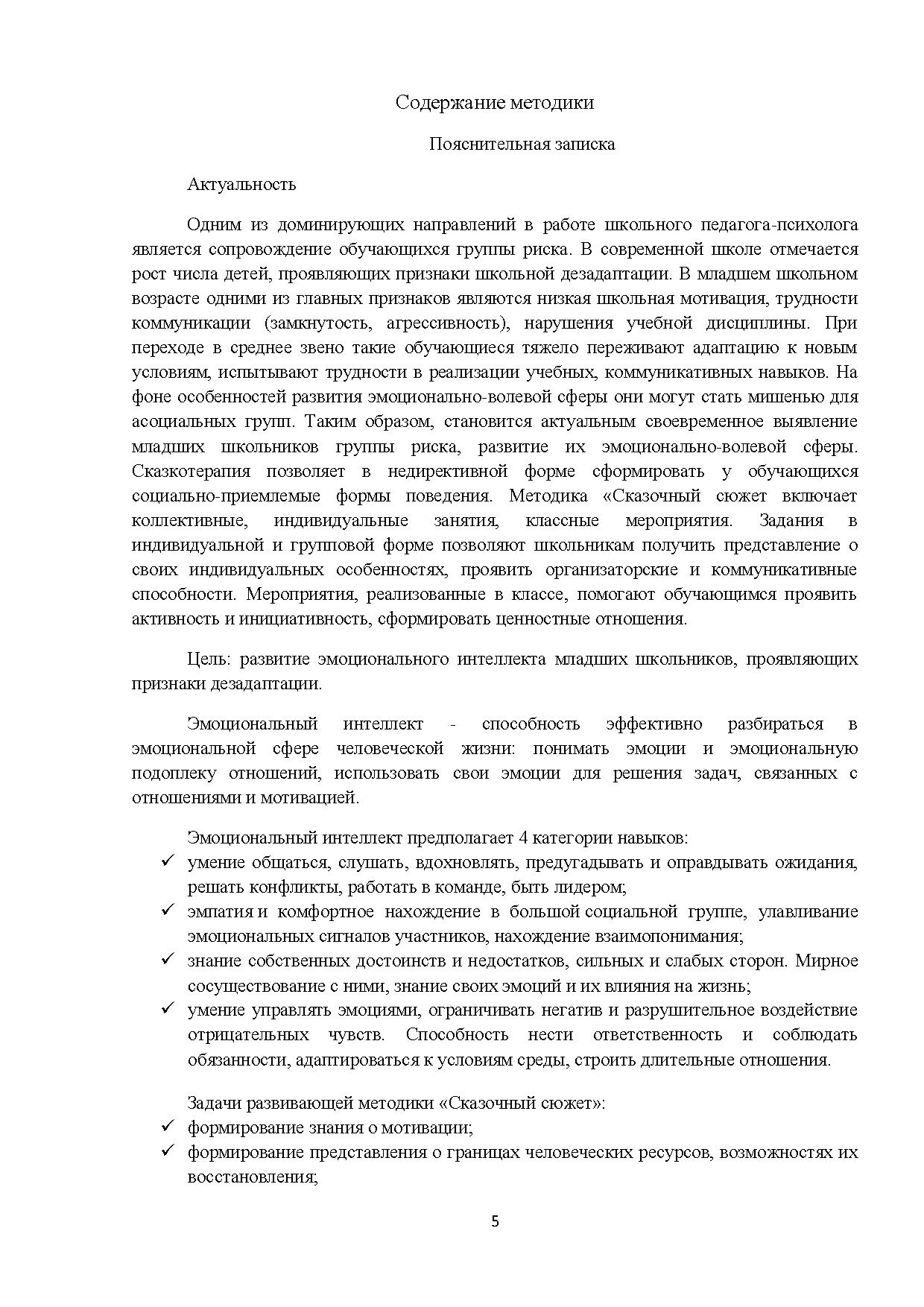 Одним из доминирующих направлений в работе школьного педагога-психолога является сопровождение обучающихся группы риска. В современной школе отмечается рост числа детей, проявляющих признаки школьной дезадаптации. В младшем школьном возрасте одними из главных признаков являются низкая школьная мотивация, трудности коммуникации (замкнутость, агрессивность), нарушения учебной дисциплины. При переходе в среднее звено такие обучающиеся тяжело переживают адаптацию к новым условиям, испытывают трудности в реализации учебных, коммуникативных навыков. Таким образом, становится актуальным своевременное выявление младших школьников группы риска, развитие их эмоционально-волевой сферы. Сказкотерапия позволяет в недирективной форме сформировать у обучающихся социально-приемлемые формы поведения. Методика «Сказочный сюжет включает коллективные, индивидуальные занятия, мероприятия класса.