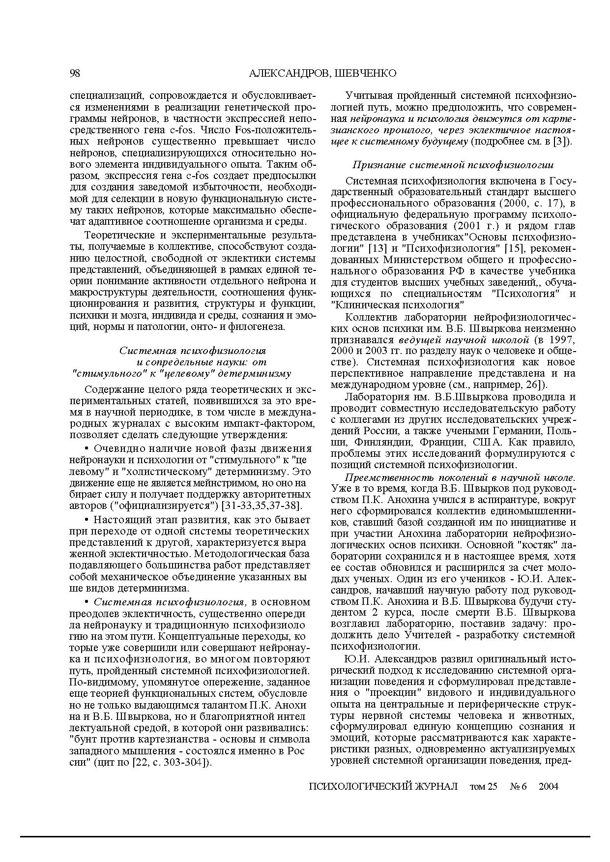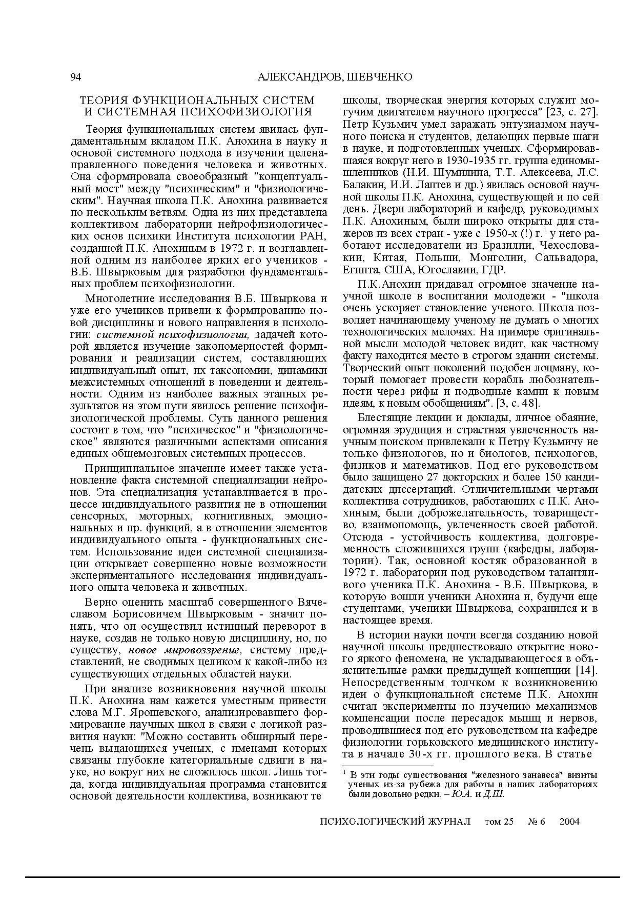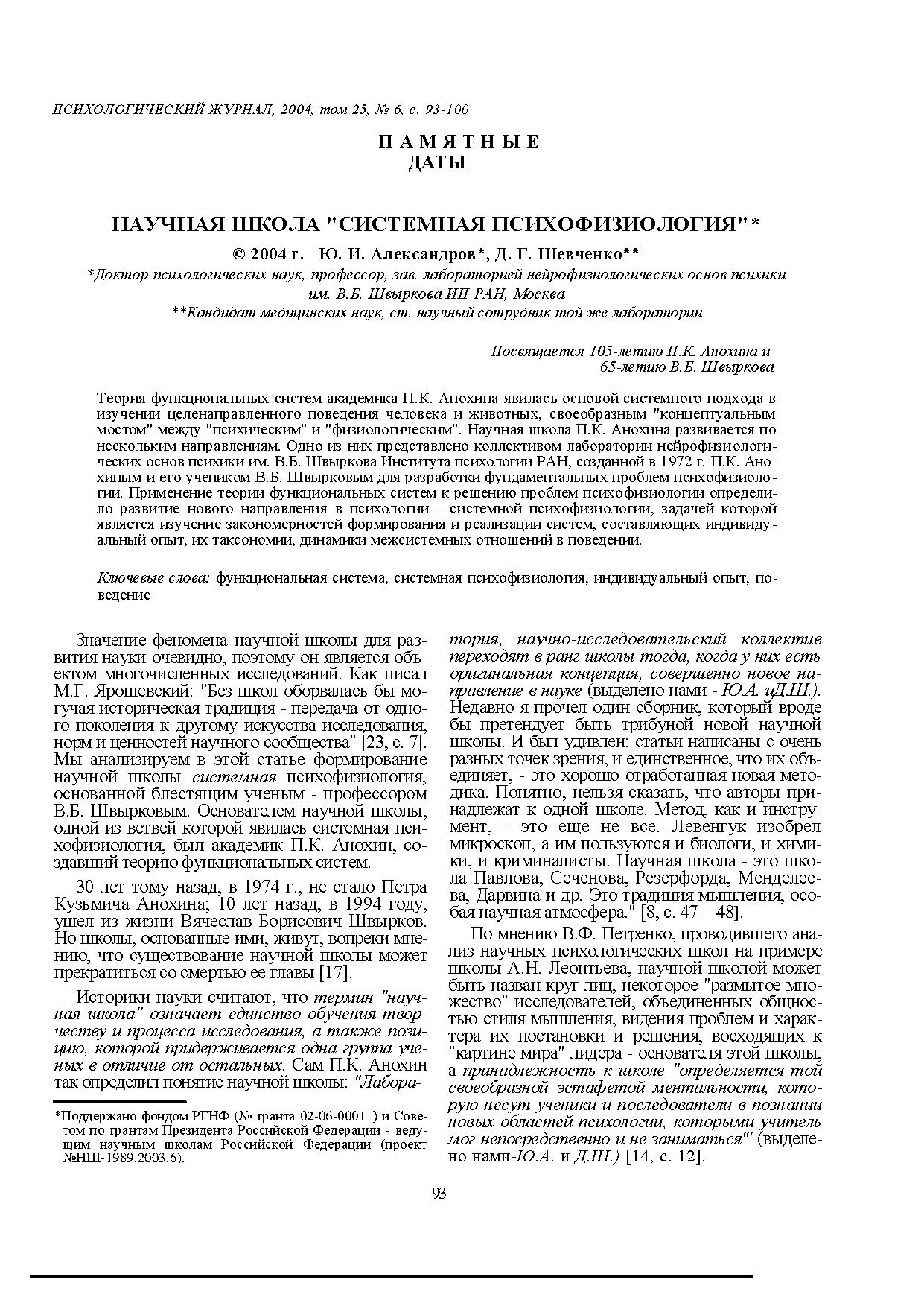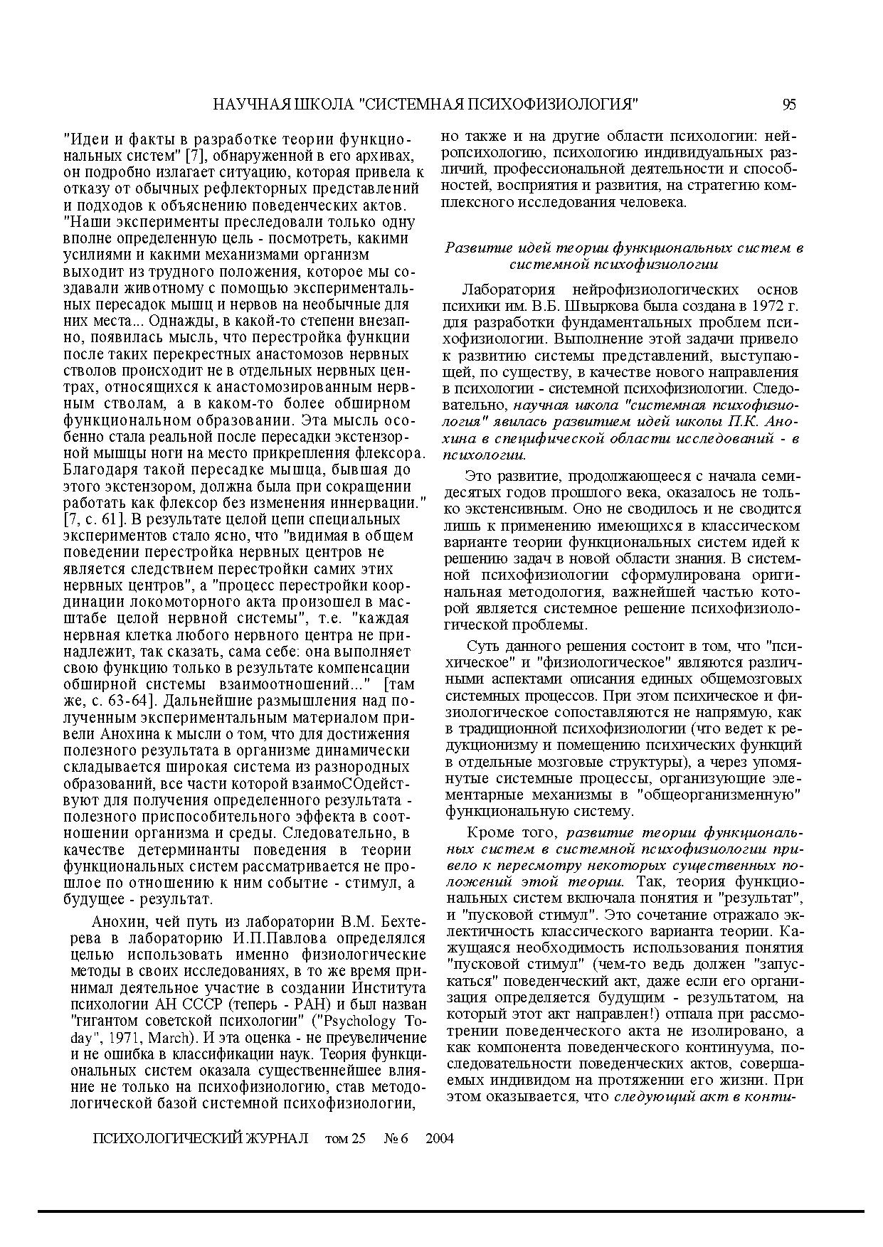 Теория функциональных систем академика П.К. Анохина явилась основой системного подхода в изучении целенаправленного поведения человека и животных, своеобразным "концептуальным мостом" между "психическим" и "физиологическим". Научная школа П.К. Анохина развивается по нескольким направлениям. Одно из них представлено коллективом лаборатории нейрофизиологических основ психики им. В.Б. Швыркова Института психологии РАН, созданной в 1972 г. П.К. Анохиным и его учеником В.Б. Швырковым для разработки фундаментальных проблем психофизиологии.