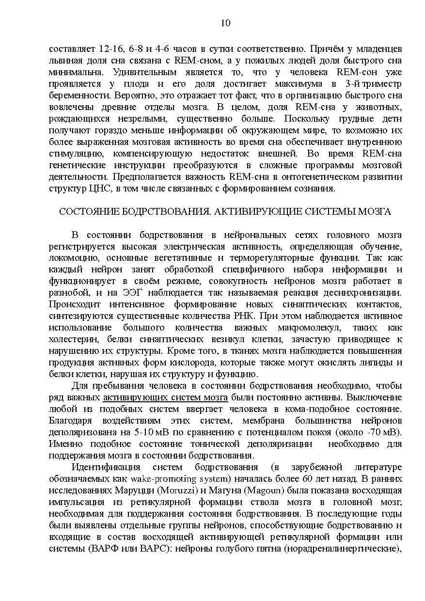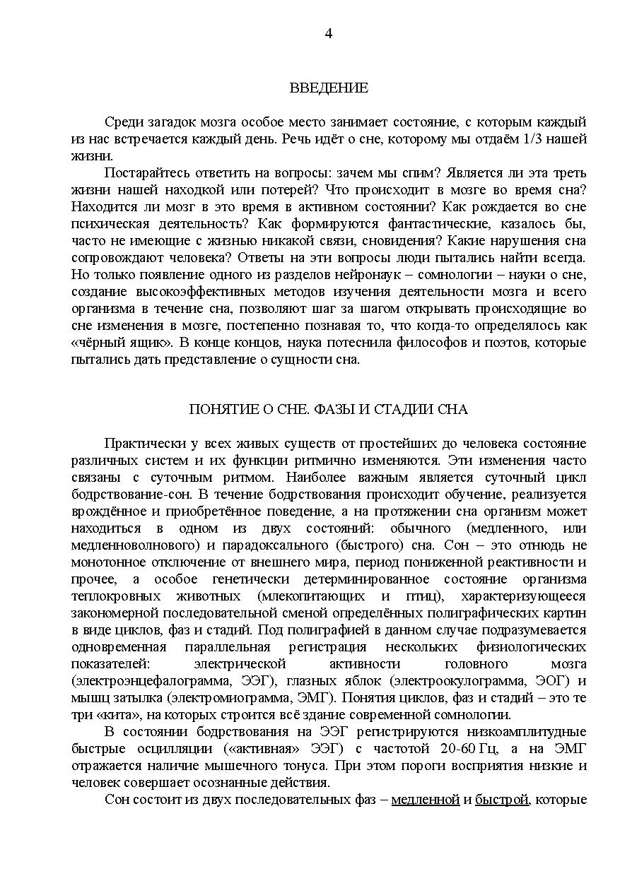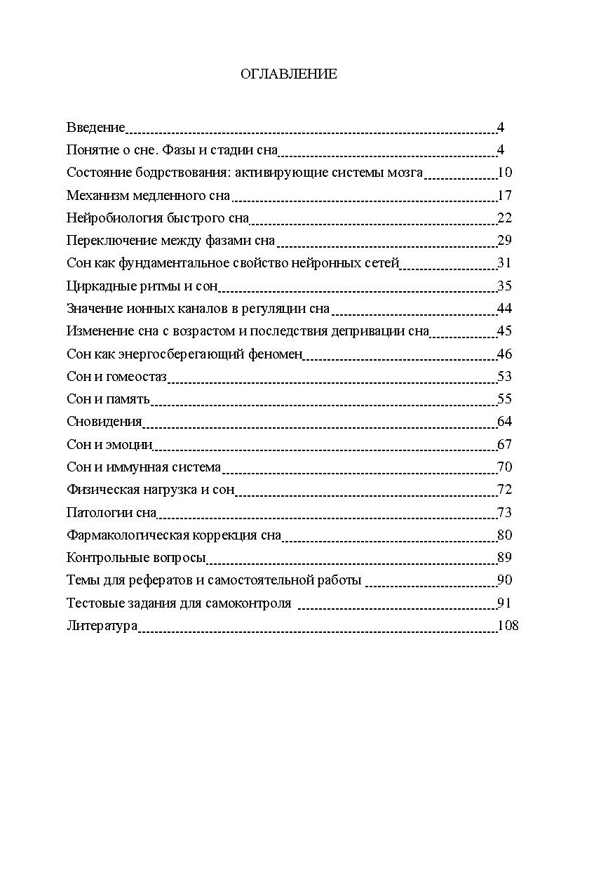Подробно описаны активирующие системы мозга, поддерживающие состояние бодрствования, а также череда событий, ввергающих человека в сон. В отдельных главах рассматриваются вопросы о нейрональной природе медленной и быстрой фаз сна, сменах фаз. В пособии приведены новые данные о способности к «сну» отдельных нейрональных сетей (составляющих функциональные единицы коры полушарий), рассматриваются взаимоотношения между сном и циркадными ритмами, системами, реагирующими на освещѐнность окружающей среды. Особое внимание уделено изложению физиологической роли сна: описывается значение сна в регуляции энергетического баланса и гомеостаза мозга, в процессах памяти и эмоциональной сфере. Разбираются гипотезы, объясняющие возникновение и функции сновидений. В отдельные главы собраны сведения о влиянии иммунной системы и физической нагрузки на сон. Краткие сведения о патологиях сна и способах фармакологического воздействия представлены в заключительной части пособия.