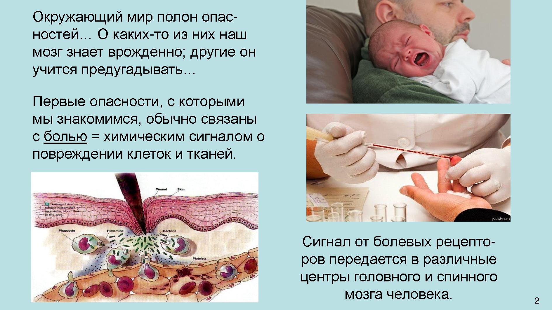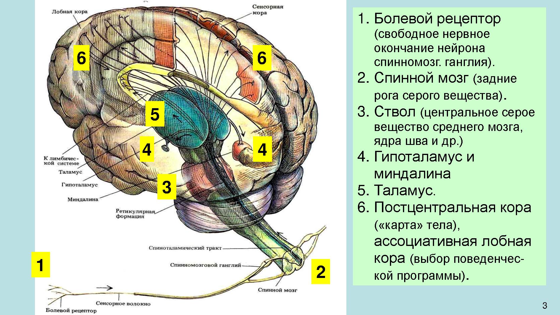 Боль — рефлекторный процесс, поэтому включает все основные звенья рефлекторной дуги: рецепторный аппарат, болевые проводники, образования спинного и головного мозга, медиаторы, осуществляющие передачу болевых импульсов.