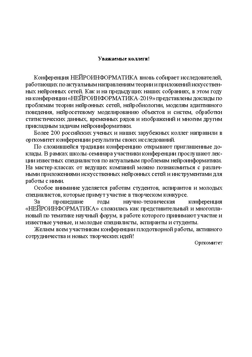 Сборник научных трудов содержит доклады, включенные в программу XXI Международной научно-технической конференции «НЕЙРОИНФОРМАТИКА-2019», проходившей в г. Москве 7–11 октября 2019 г.