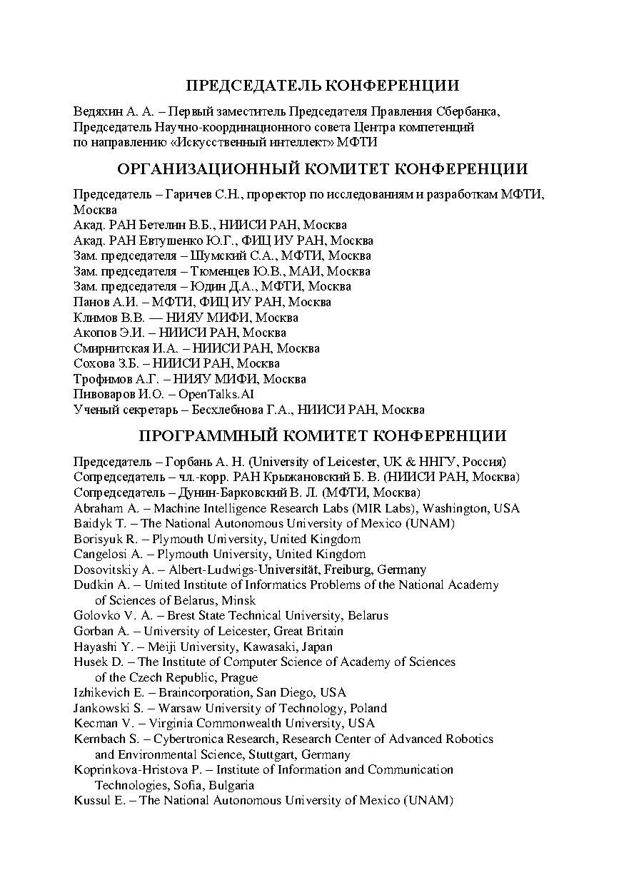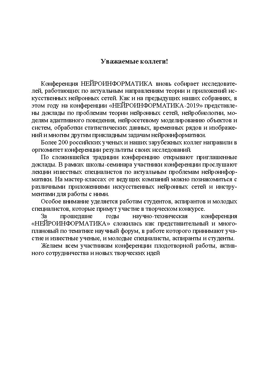 Сборник научных трудов содержит доклады, включенные в программу XXI Международной научно-технической конференции «НЕЙРОИНФОРМАТИКА2019», проходившей в г. Москве 7–11 октября 2019 г.