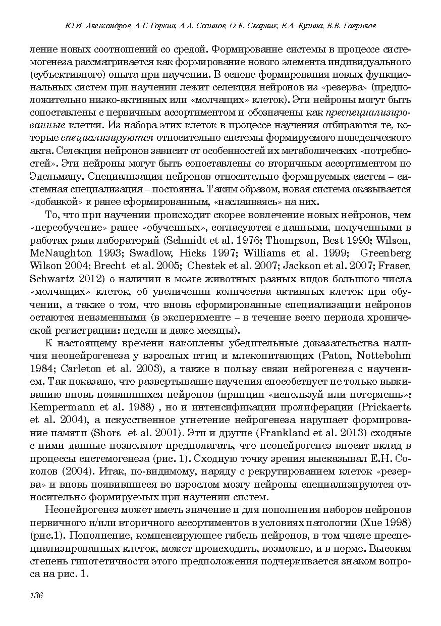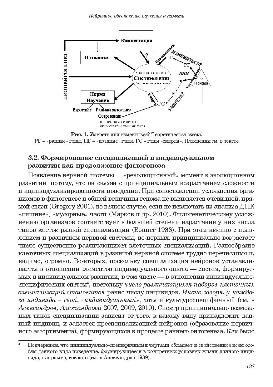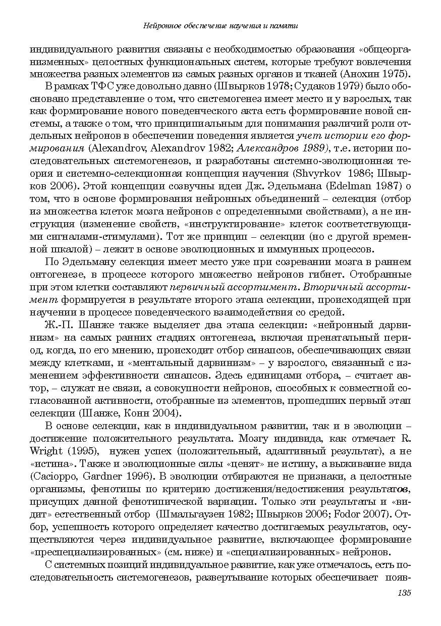 В качестве нейронных механизмов научения и консолидации памяти рассматривается становление новых специализаций нейронов относительно систем вновь формируемых поведенческих актов. Становление новых специализацией в процессе индивидуального развития оценивается как продолжение филогенеза. Рассматриваются особенности нейронного обеспечения поведения на последовательных стадиях научения, у представителей разных видов и у индивидов одного вида, имеющих разную историю формирования внешне сходного поведения. Обсуждается роль процессов селекции, реконсолидационных модификаций ранее сформированной памяти, экспрессии генов, нейрогенеза и апоптоза в научении. Обосновывается системная трактовка феномена долговременной потенциации.