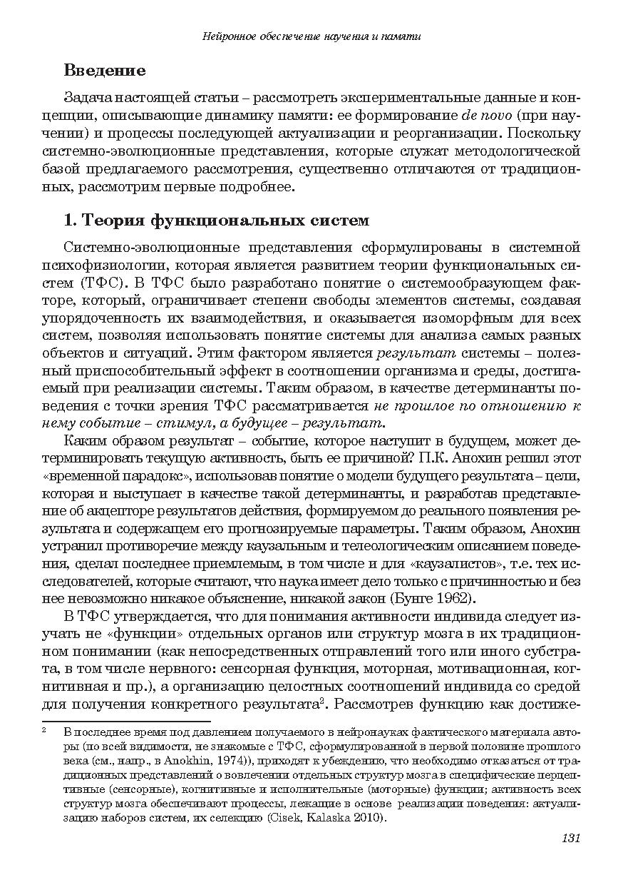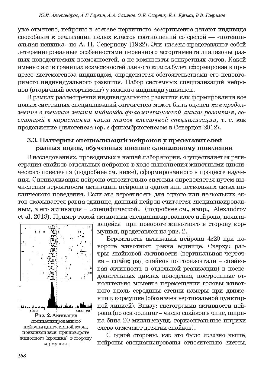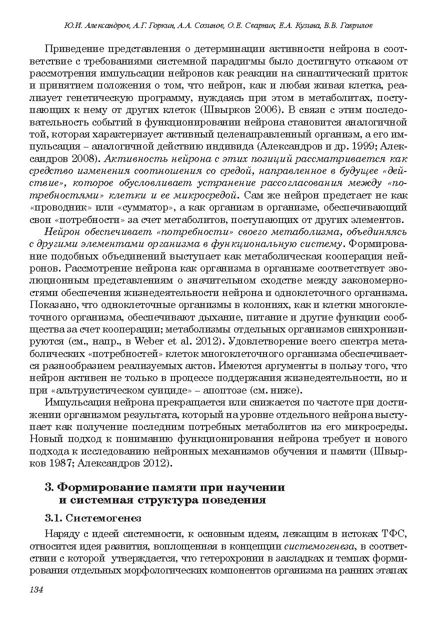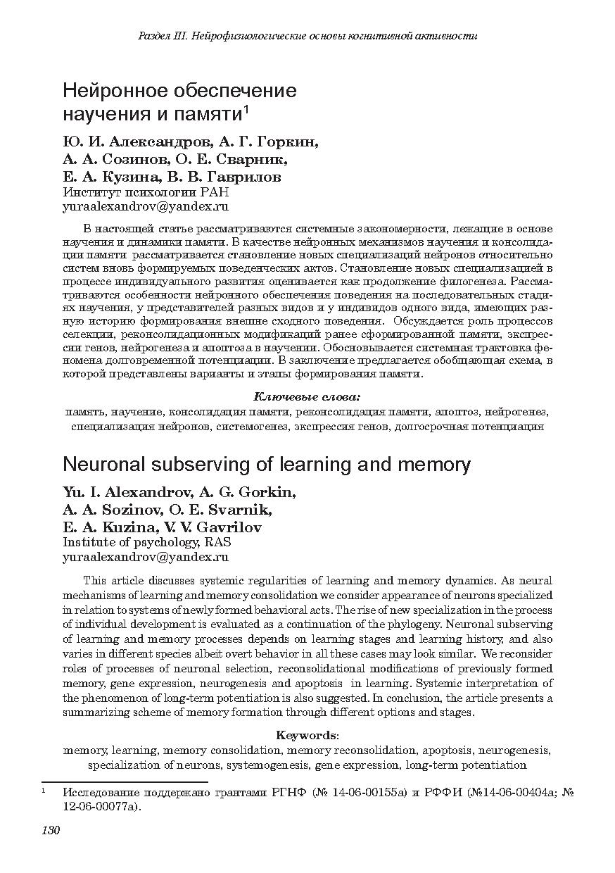 В качестве нейронных механизмов научения и консолидации памяти рассматривается становление новых специализаций нейронов относительно систем вновь формируемых поведенческих актов. Становление новых специализацией в процессе индивидуального развития оценивается как продолжение филогенеза. Рассматриваются особенности нейронного обеспечения поведения на последовательных стадиях научения, у представителей разных видов и у индивидов одного вида, имеющих разную историю формирования внешне сходного поведения. Обсуждается роль процессов селекции, реконсолидационных модификаций ранее сформированной памяти, экспрессии генов, нейрогенеза и апоптоза в научении. Обосновывается системная трактовка феномена долговременной потенциации.