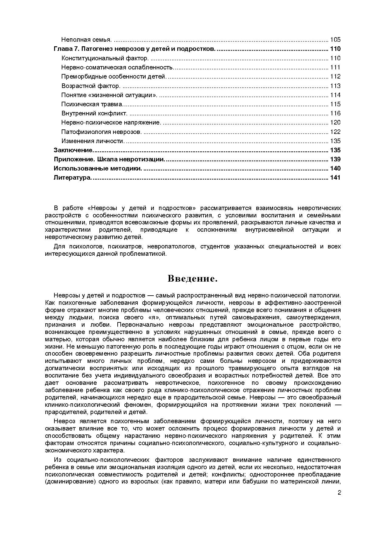В работе «Неврозы у детей и подростков» рассматривается взаимосвязь невротических расстройств с особенностями психического развития, с условиями воспитания и семейными отношениями, приводятся всевозможные формы их проявлений, раскрываются личные качества и характеристики родителей, приводящие к осложнениям внутрисемейной ситуации и невротическому развитию детей.