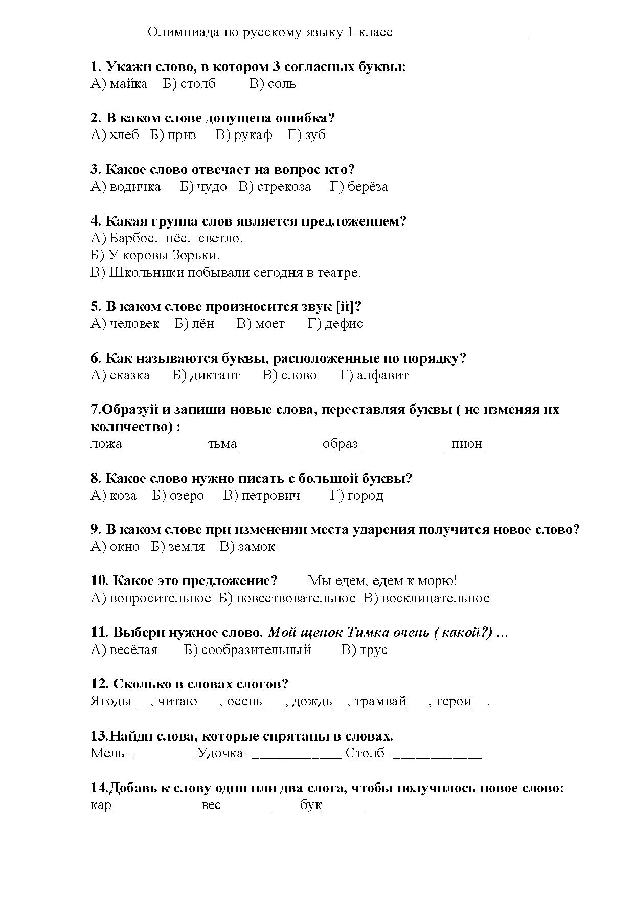 Олимпиада по русскому языку в первом классе на внутришкольном уровне проводится в два этапа.