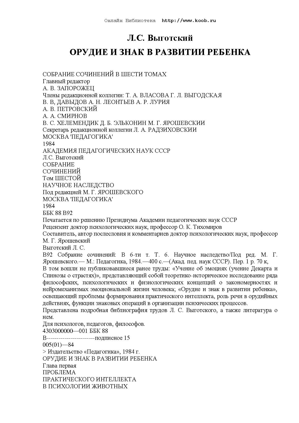 В том вошли не публиковавшиеся ранее труды: «Учение об эмоциях (учение Декарта и Спинозы о страстях)», представляющий собой теоретико-историческое исследование ряда философских, психологических и физиологических концепций о закономерностях и нейромеханизмах эмоциональной жизни человека; «Орудие и знак в развитии ребенка», освещающий проблемы формирования практического интеллекта, роль речи в орудийных действиях, функции знаковых операций в организации психических процессов.