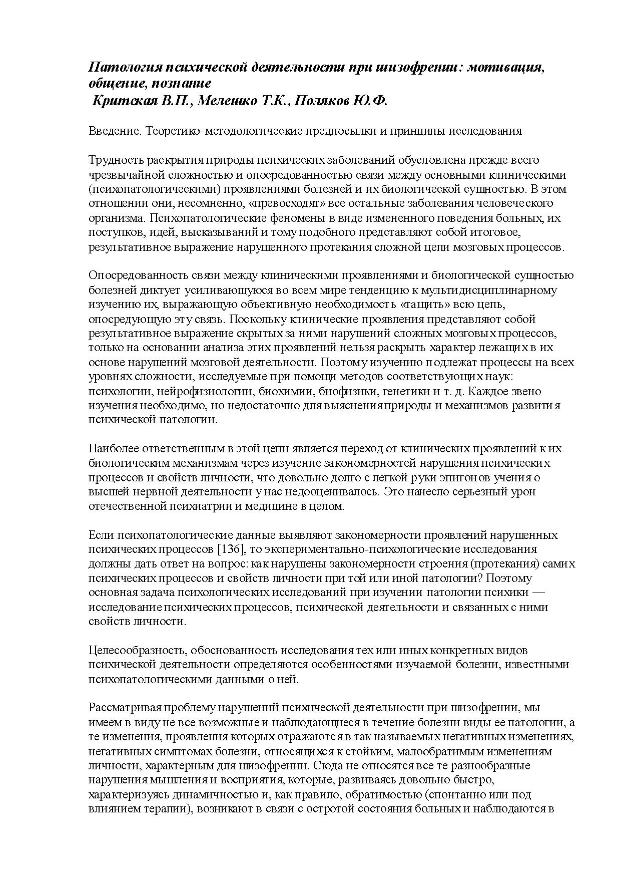 С позиций системного подхода выделен основной психологический синдром, раскрывающий обусловленность и взаимосвязь многообразных и часто парадоксальных нарушений психической деятельности. На этой основе рассматривается ряд общепсихологических проблем: мотивации и социальной регуляции психической деятельности, общения, познавательной деятельности, формирования психики, соотношения социального и биологического в ее развитии, связи патологии и творчества.
