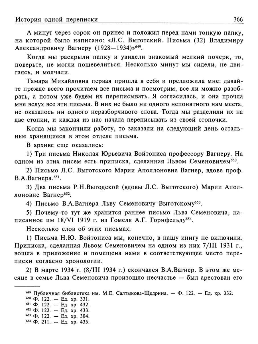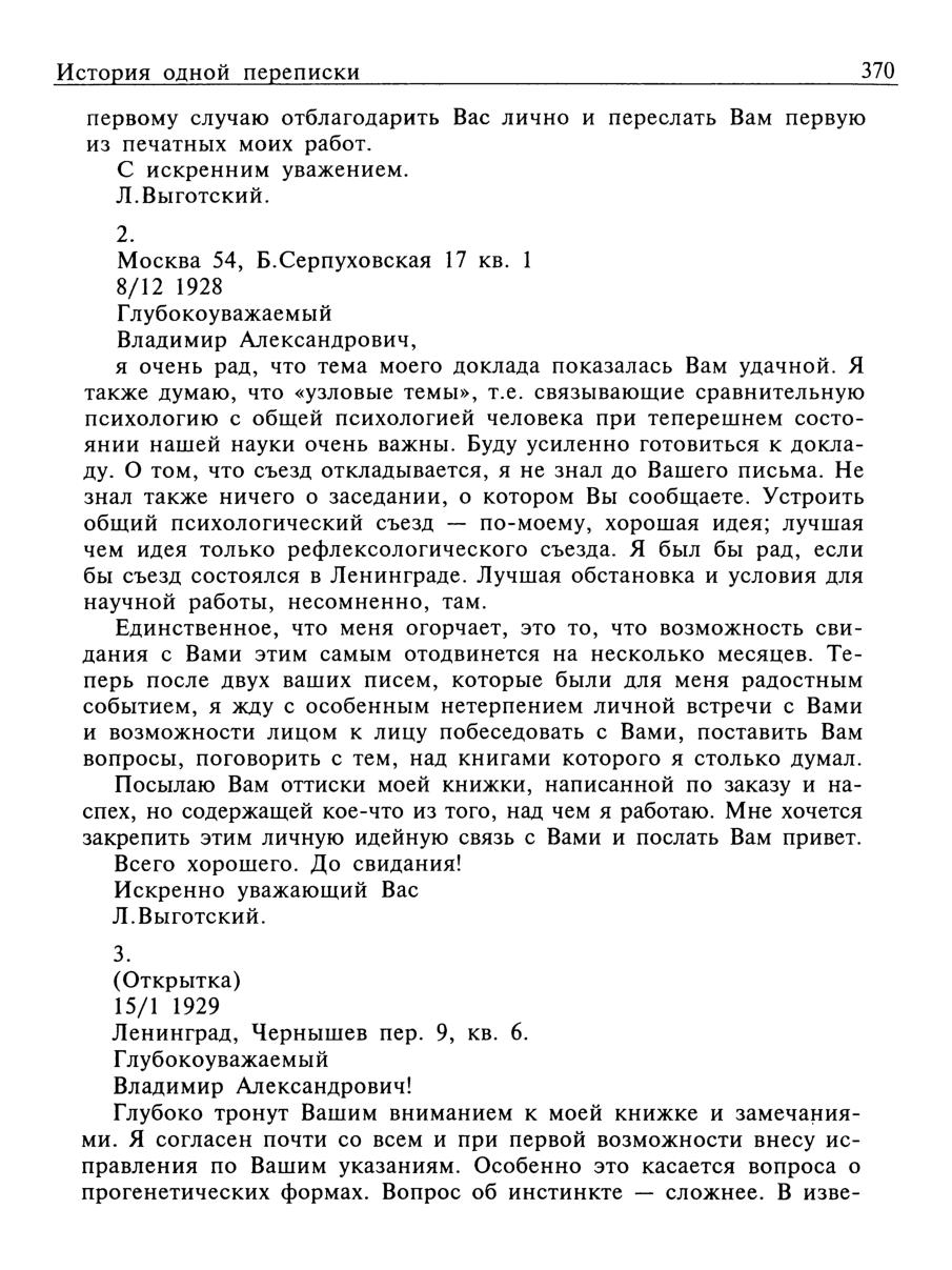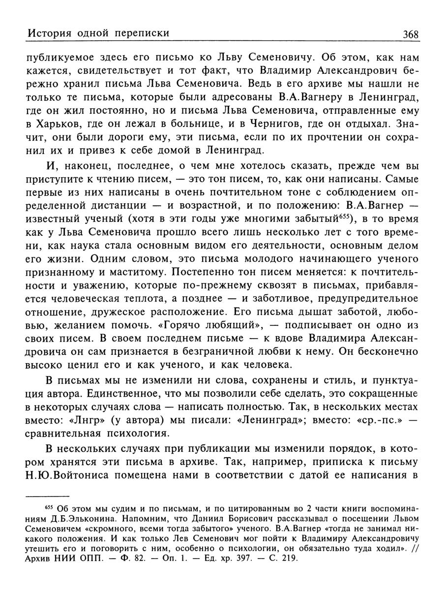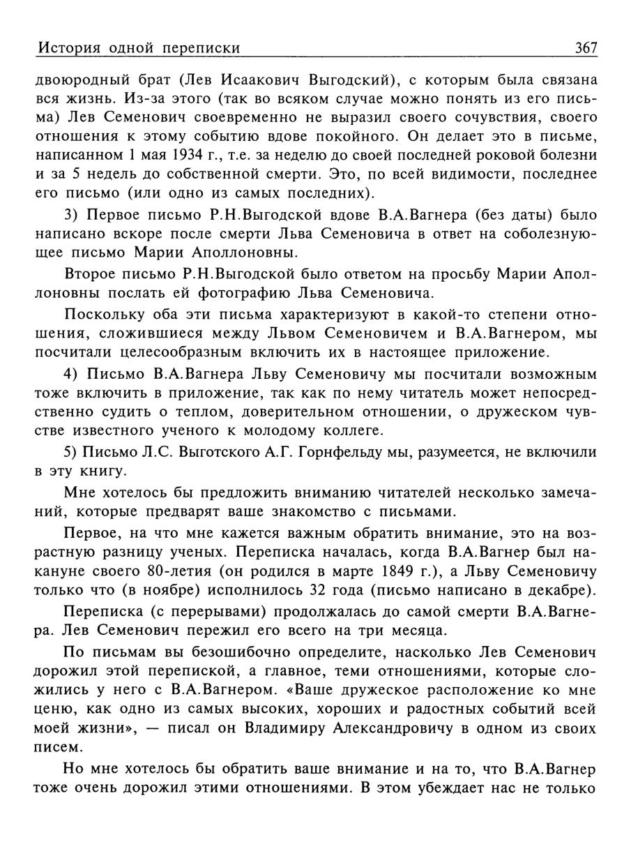Знакомство с неопубликованной перепиской этих двух ученых (к сожалению, письма Вагнера к Выготскому не сохранились, и об их содержании можно судить лишь по ответам последнего) свидетельствует об огромном влиянии, которое оказывал Вагнер на своего молодого коллегу.