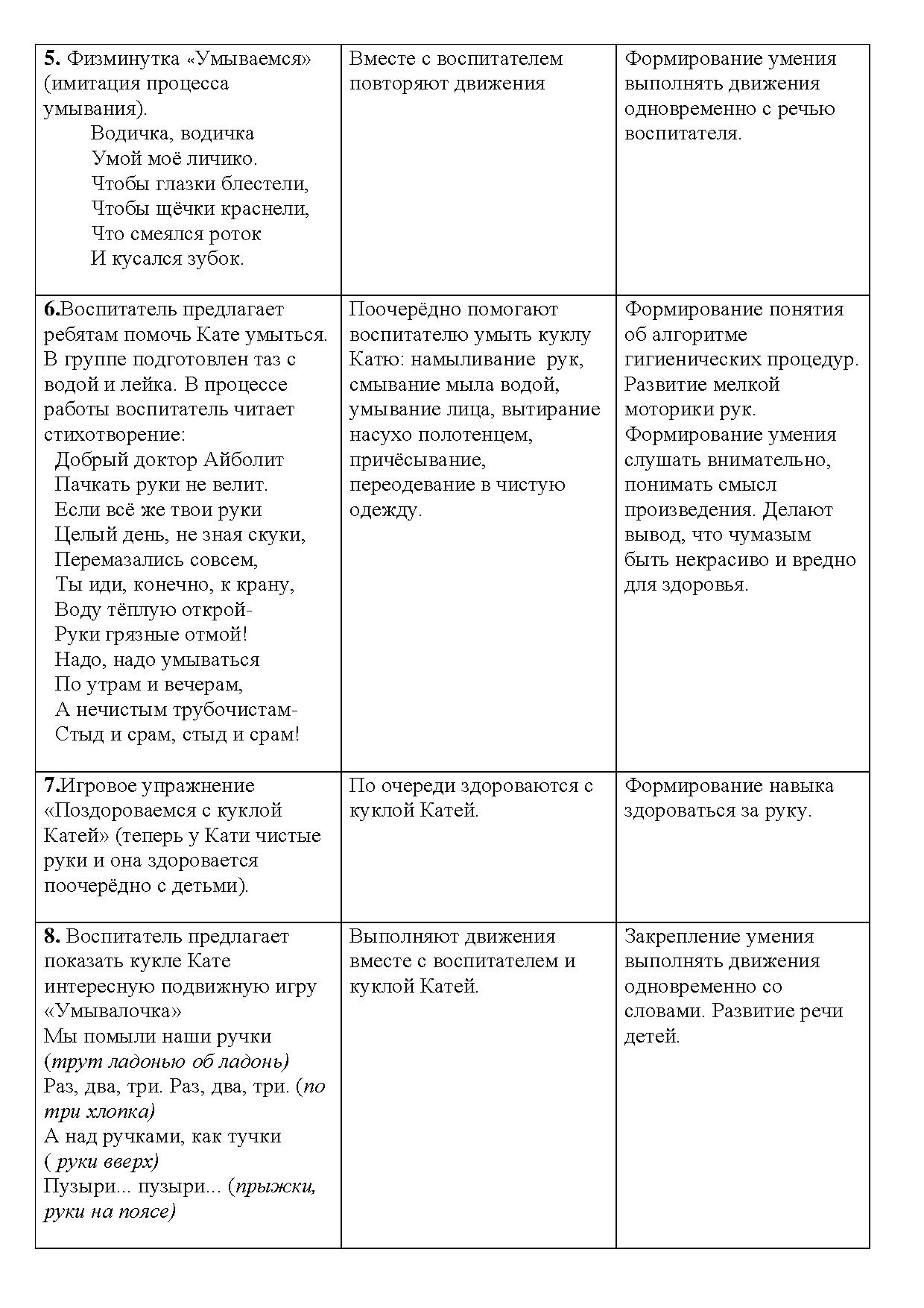 · побуждать к выполнению элементарных гигиенических навыков: мыть руки, лицо, тело, расчёсываться, следить за чистотой одежды («Здоровье»);