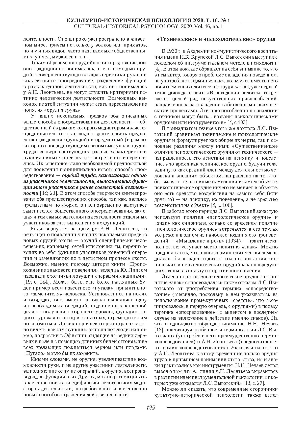 Статья посвящена рассмотрению ряда важнейших для культурно-исторической психологии понятий — «орудие», «психологическое орудие», «знак» — и их соотношения, как в прошлом, так и у современных исследователей. Проанализированы разные подходы к трактовке понятия «орудие» и предложен вариант его переосмысления. Отмечен переход Л.С. Выготского от понятия «психологическое орудие» к понятию «знак» и некоторые важные в контексте статьи особенности понимания им этого термина.